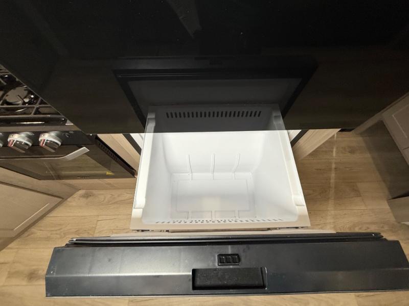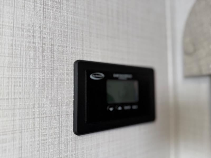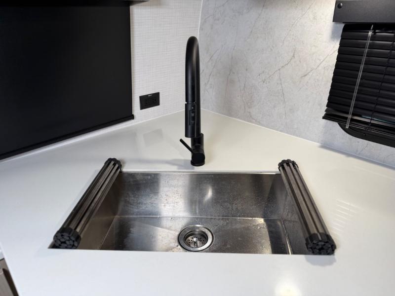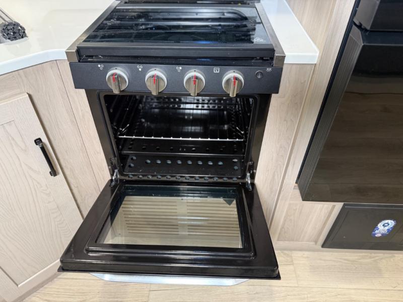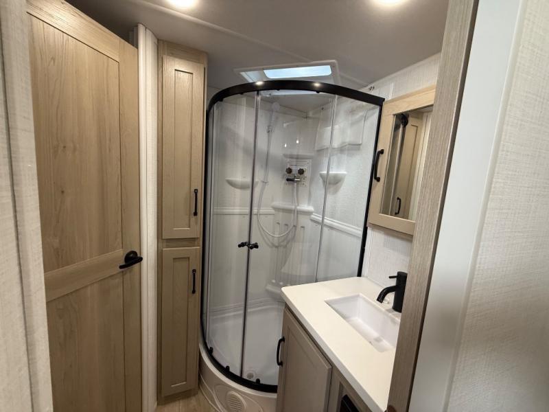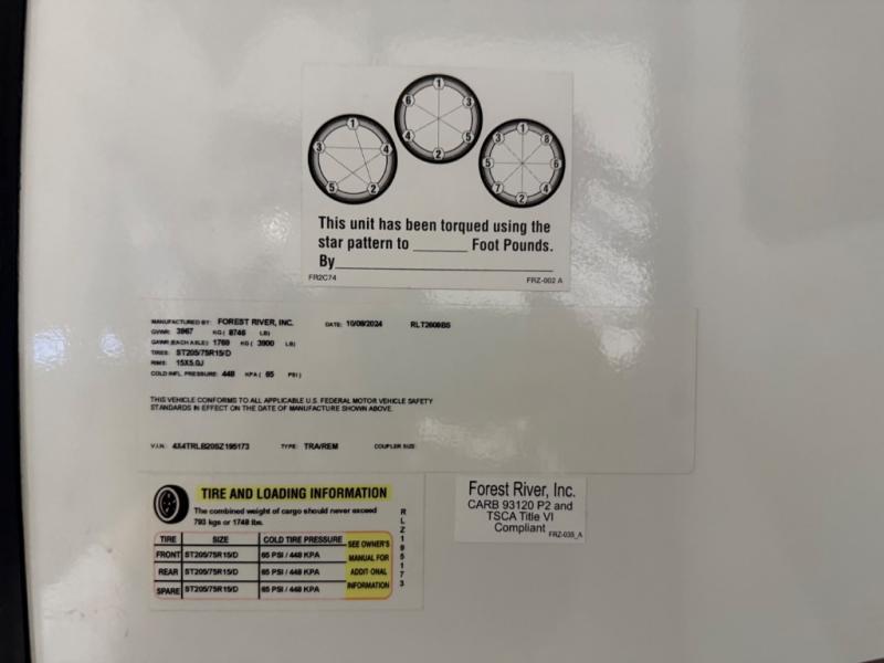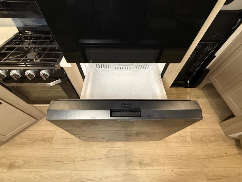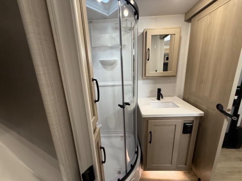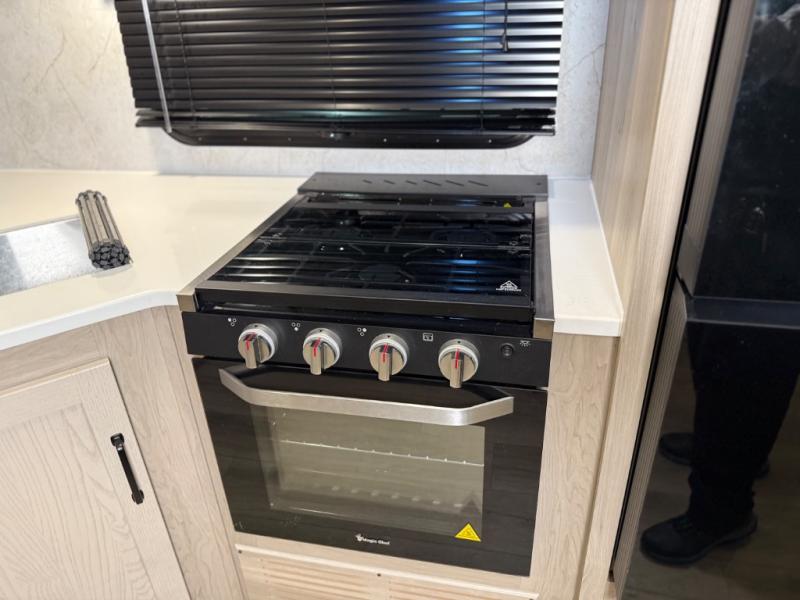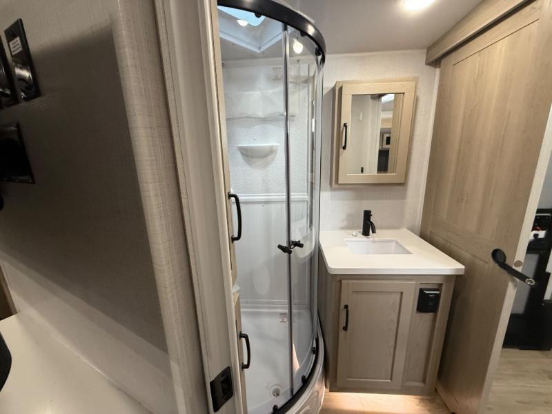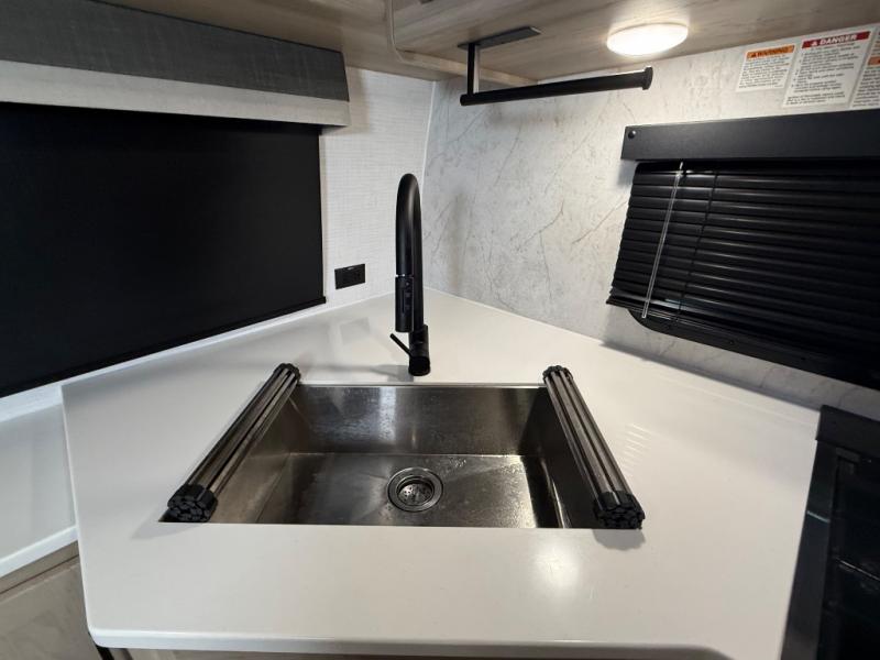 When you are outside this trailer you can enjoy the protection from the 21' power awning, and whip up a meal using the outside griddle. You will find exterior storage for your extra gear, and a ladder at the rear. You get to choose which entrance to step up into, be it the spacious rear bedroom with a queen bed slide and a wardrobe, or the main entry into the kitchen and living area. The furniture slide includes a booth dinette to eat your meals at, and theater seating to watch the Smart TV with a fireplace below. And the cook will love the front kitchen with extra counter space, a three burner range, plus a 12V refrigerator and pantry for food storage!