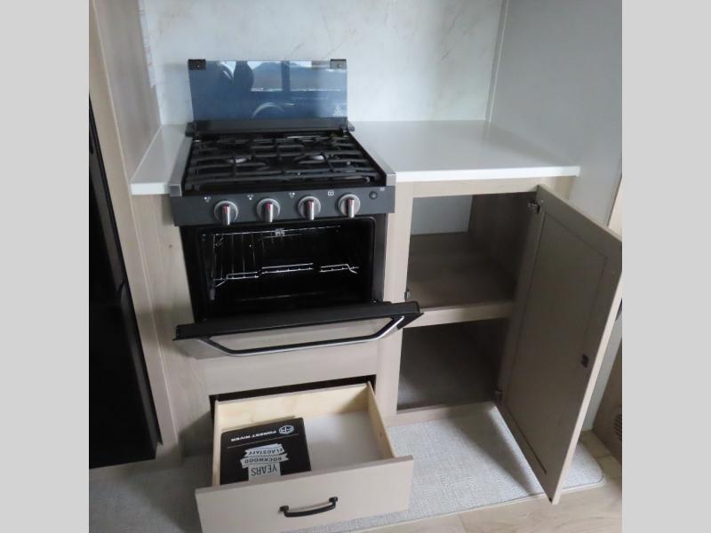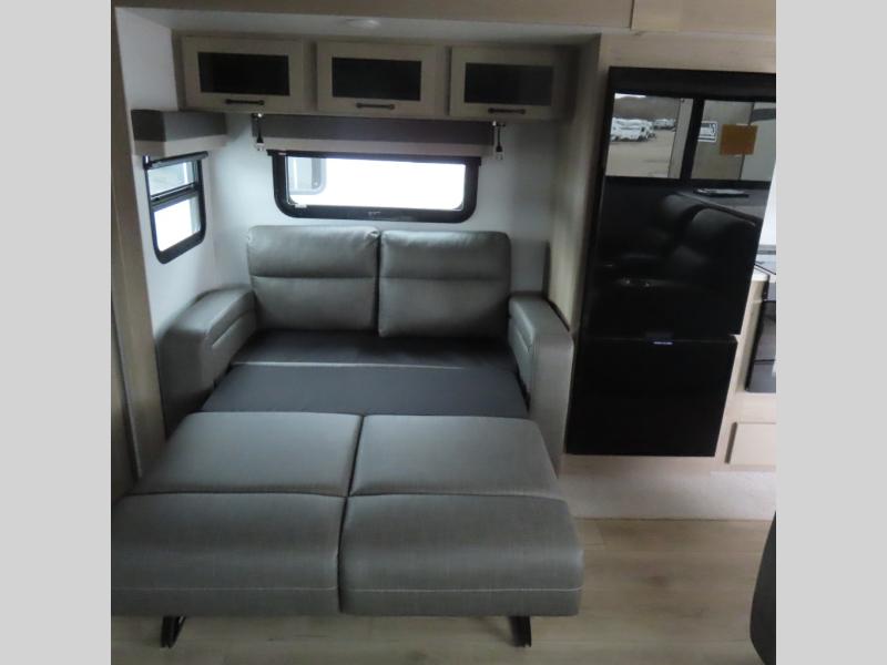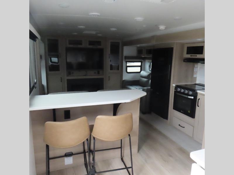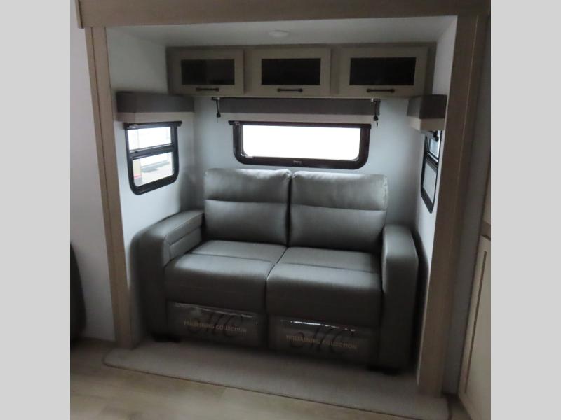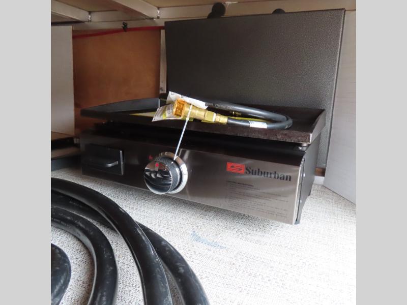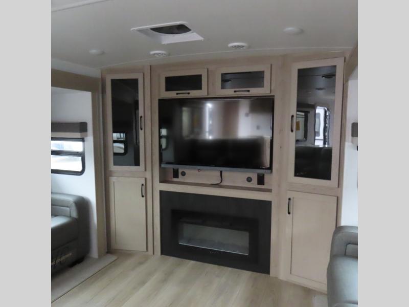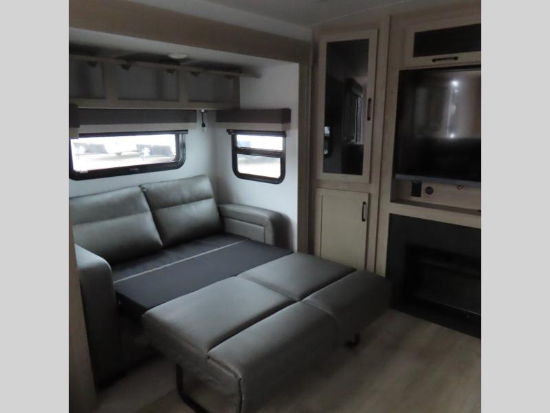 Enjoy trips to the lake in this travel trailer with triple slides! The rear living area includes a rear entertainment center, a 60" theater seat, plus two hide-a-bed sofas, which allows this room to double as your guests' bedroom at night. You'll enjoy the front private bedroom all to yourselves, and the full bath is close by for convenience. The chef of your group will love the full kitchen with a three burner range, a 21" gas oven, and a 12V refrigerator to hold perishables. And don't overlook the exterior with its outside storage, 21' awning, and exterior griddle!