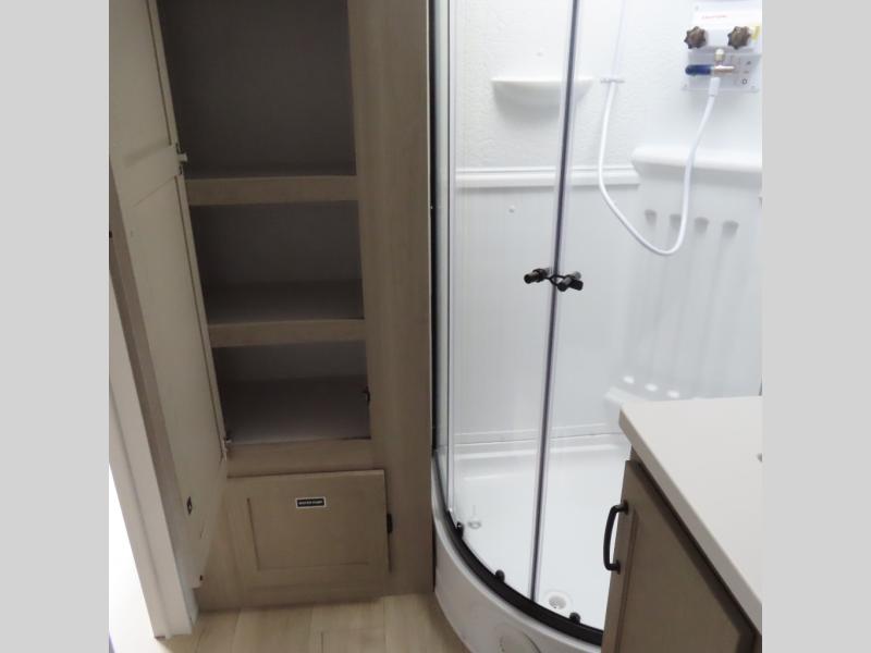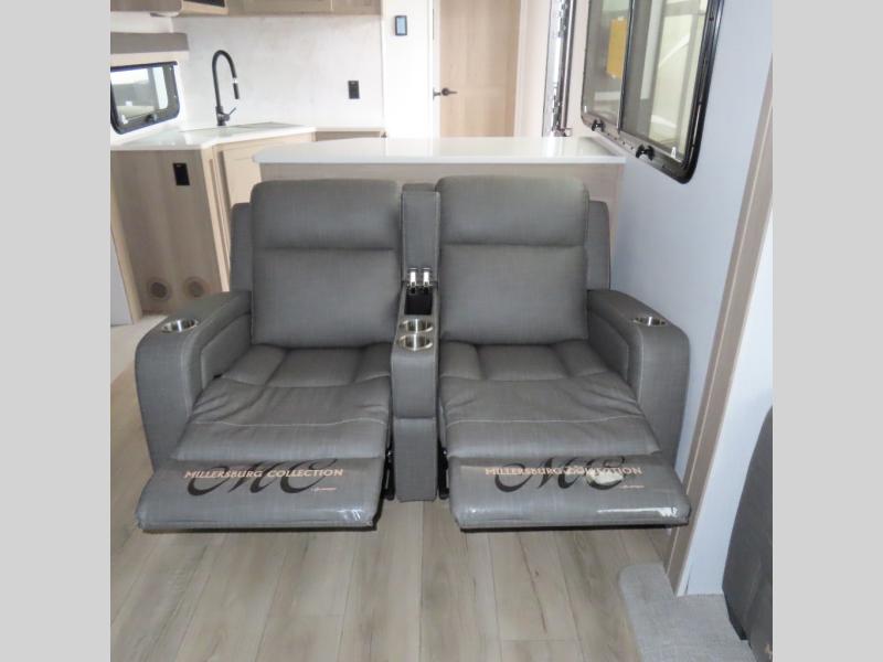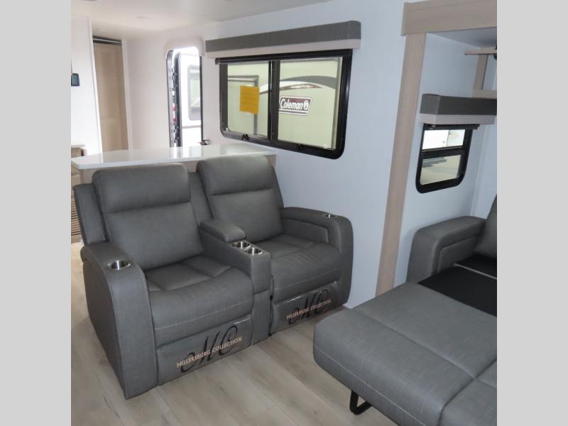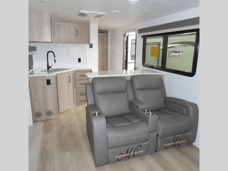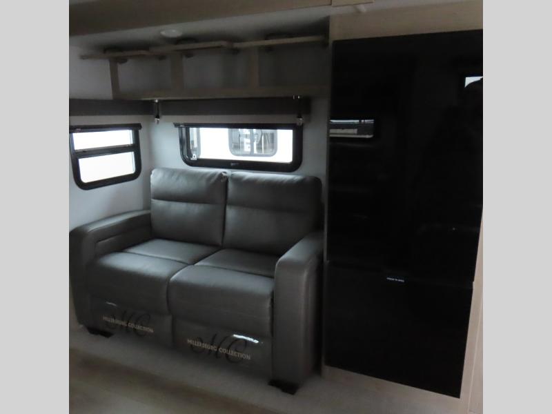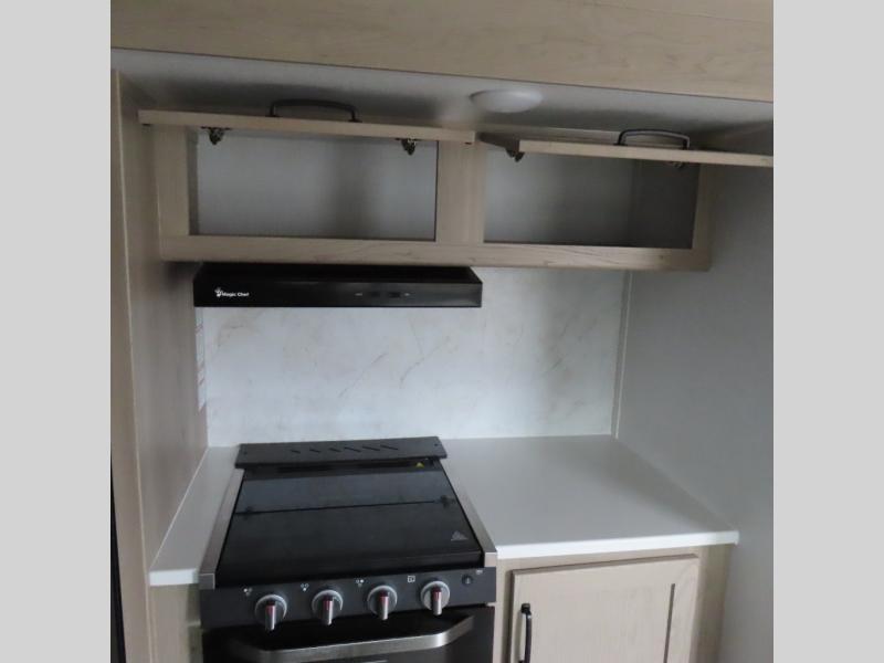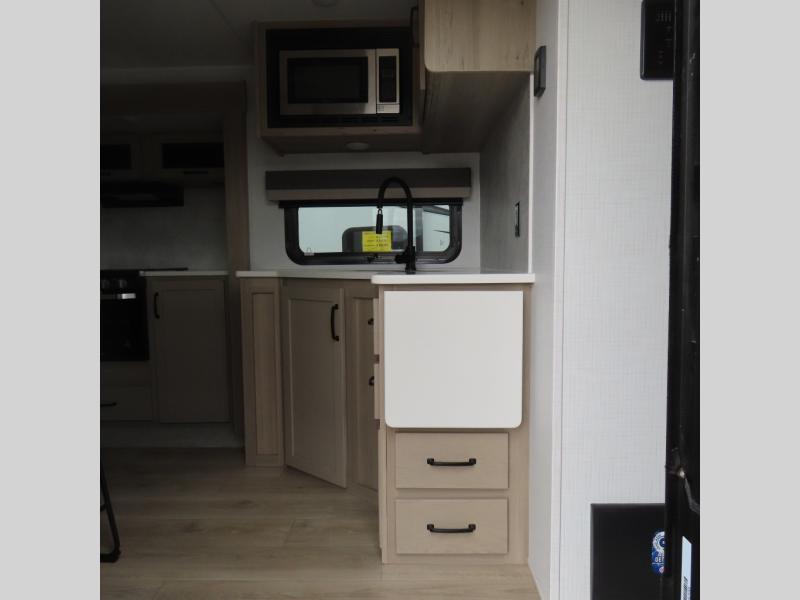 Enjoy trips to the lake in this travel trailer with triple slides! The rear living area includes a rear entertainment center, a 60" theater seat, plus two hide-a-bed sofas, which allows this room to double as your guests' bedroom at night. You'll enjoy the front private bedroom all to yourselves, and the full bath is close by for convenience. The chef of your group will love the full kitchen with a three burner range, a 21" gas oven, and a 12V refrigerator to hold perishables. And don't overlook the exterior with its outside storage, 21' awning, and exterior griddle!