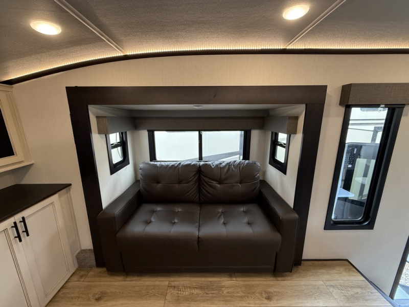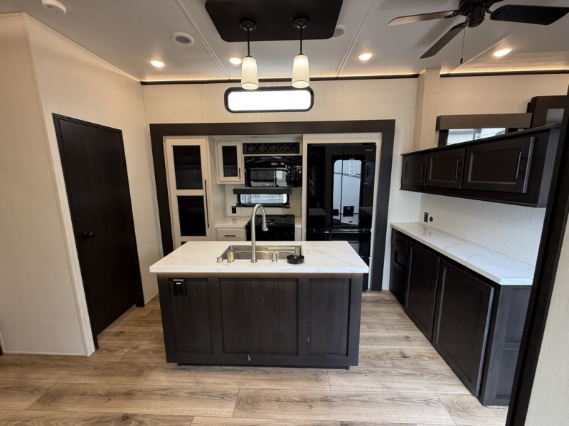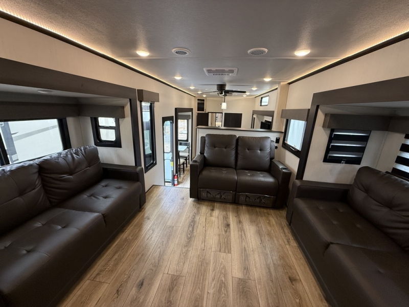 FRONT LARGE LIVING AREA WITH THEATER SEATING & UPGRADED SLEEPER SOFAS. ELECTRIC FIREPLACE & BIG 60" FLAT SCREEN TV. BEAUTIFUL ISLAND KITCHEN with residential refrigerator, STAINLESS STEEL APPLIANCES, and LOTS OF CABINET STORAGE.