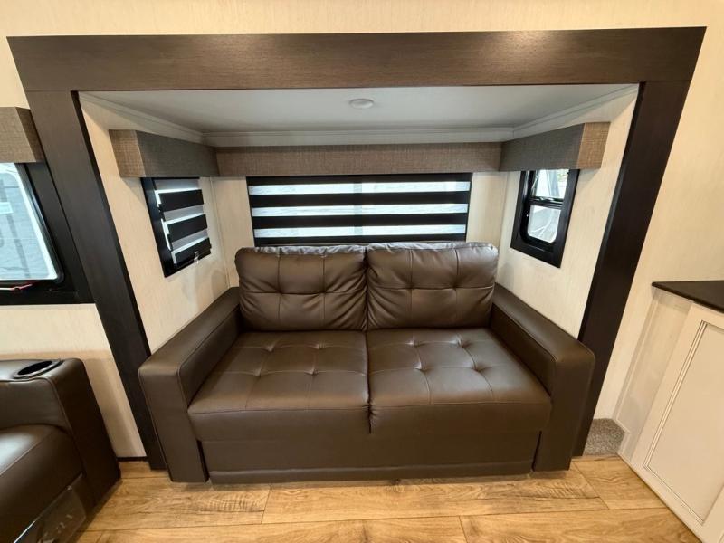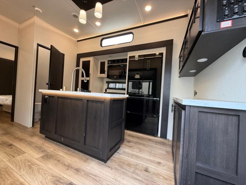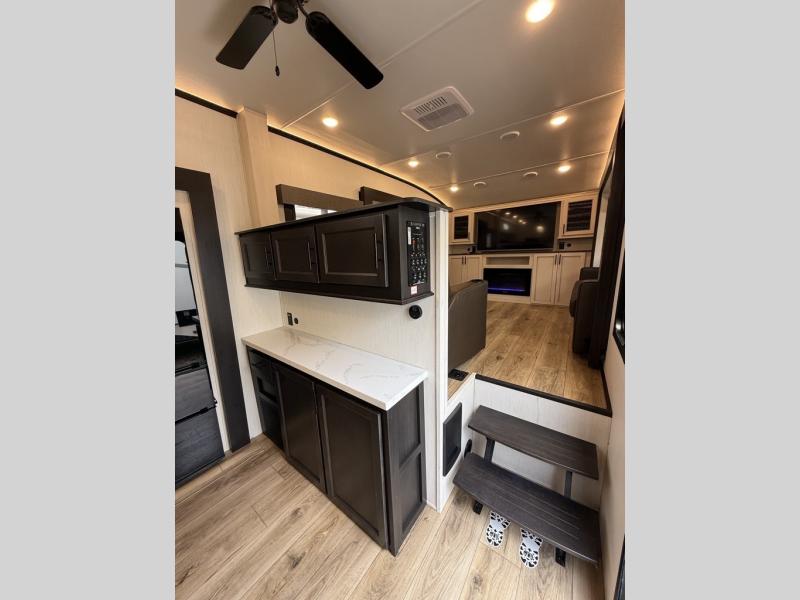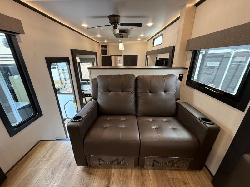 FRONT LARGE LIVING AREA WITH THEATER SEATING & UPGRADED SLEEPER SOFAS. ELECTRIC FIREPLACE & BIG 60" FLAT SCREEN TV. BEAUTIFUL ISLAND KITCHEN with residential refrigerator, STAINLESS STEEL APPLIANCES, and LOTS OF CABINET STORAGE.