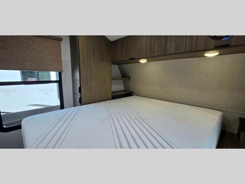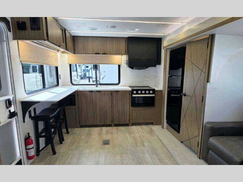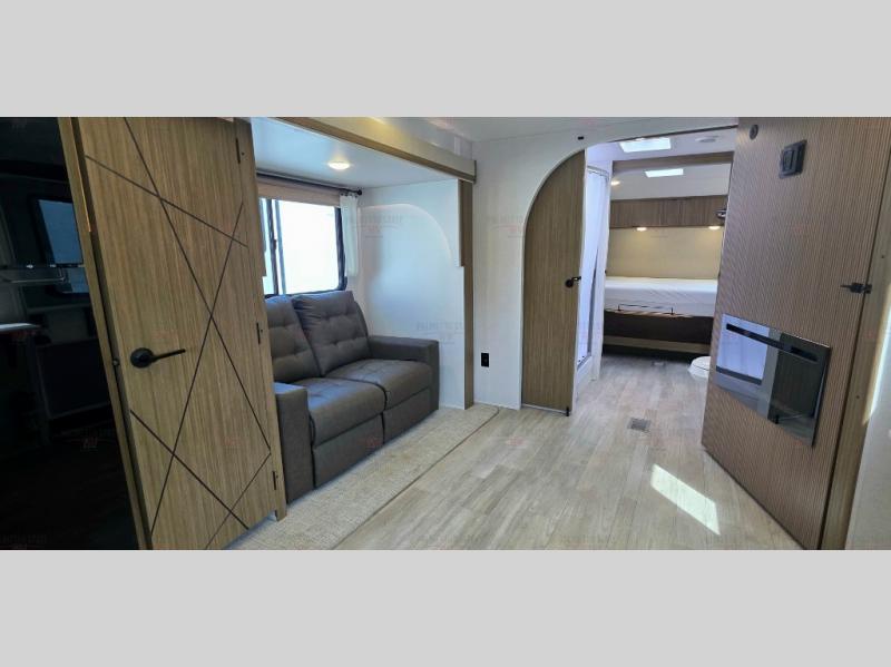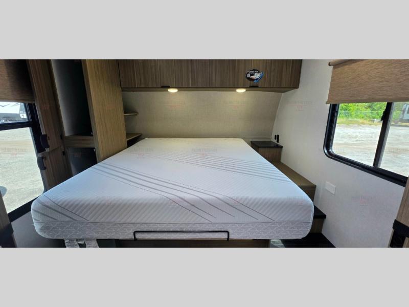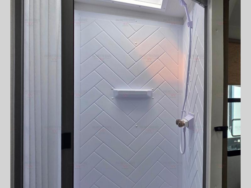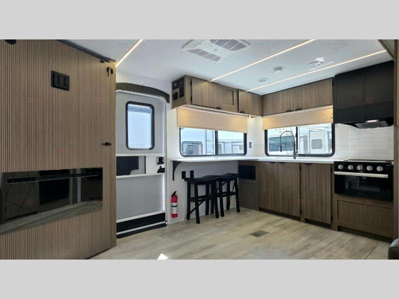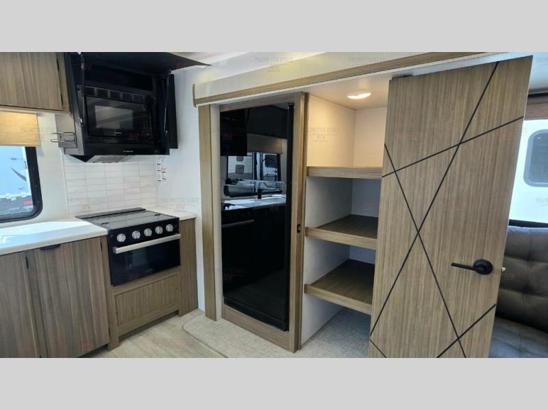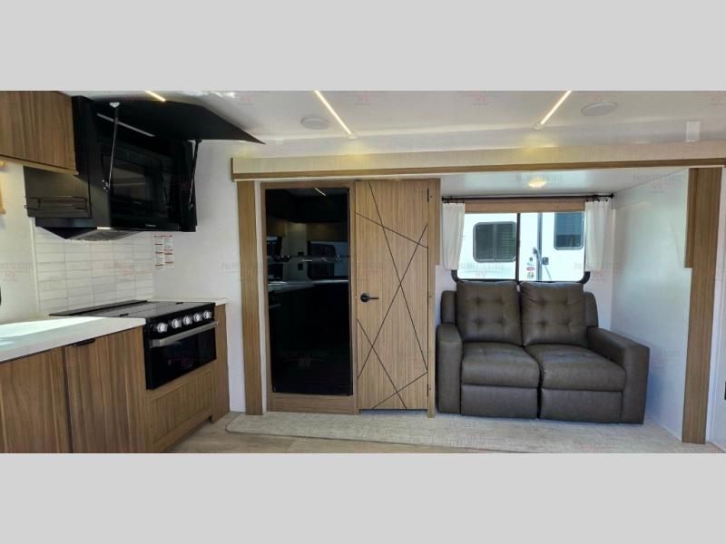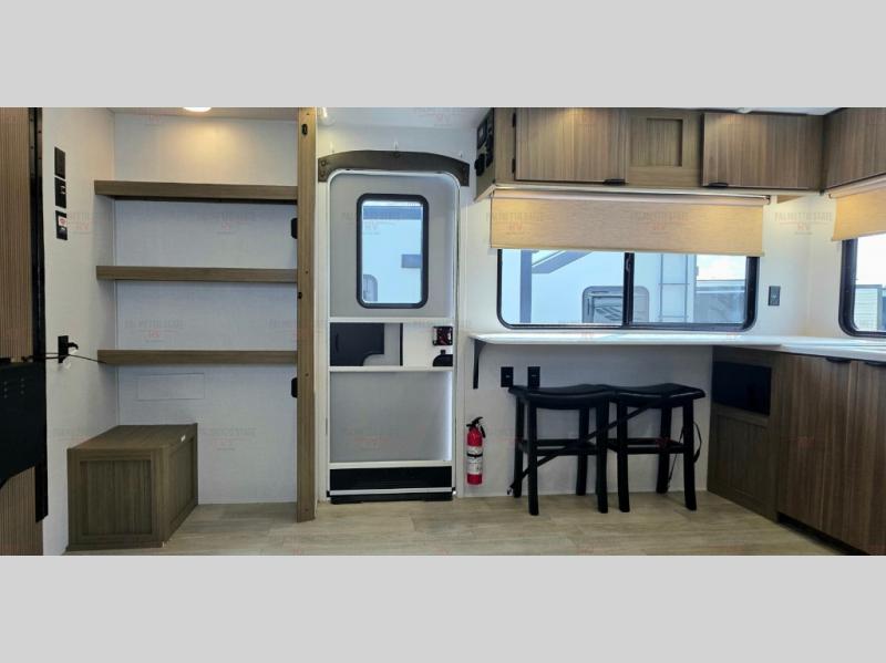 You're going to love cooking in the rear kitchen of this travel trailer! It has everything you need to prepare delicious home cooked meals including a large pantry and oversized fridge, plus there are two bar stools to sit on while you enjoy them. The theater seating is conveniently across from the swiveling entertainment center which hidden shelves behind it for your games and movies. As you walk-through the bathroom, you will notice a walk-in shower to the left and a toilet and sink to the right. It leads directly into the front private bedroom which has a Versa-Tilt custom king bed to lay your head on at night and a closet plus overhead storage for your items!