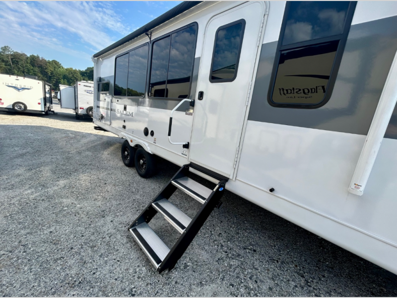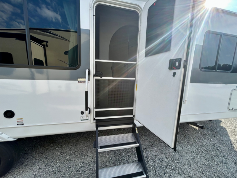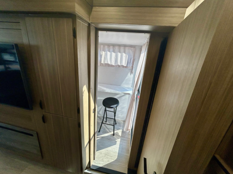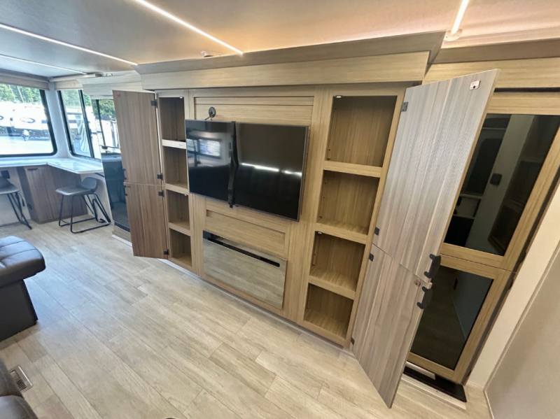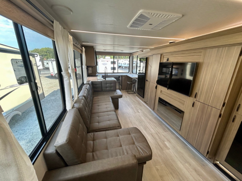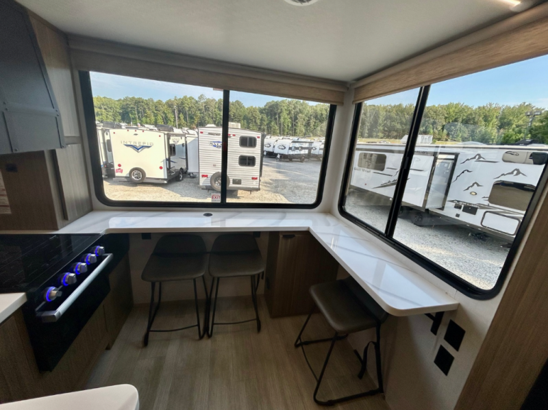 Your family of four will enjoy this Salem View bunk model featuring 105 square feet of window space for unbelievable views of your surroundings. A Versa Slide features a refrigerator, pantry, and entertainment center with a door leading to a bunk space including a set of 30" x 70" bunks with top flip-up bunk, storage cubbies for your things, and a desk with bar stool for any office work that you may need to do while you travel. The rear kitchen area offers 18 linear feet of countertop space with four bar stools, plus a range and double sink. Your refrigerator and pantry will hold all of your perishables and dry goods, and those are nearby within the Versa slide. Up front, a private bedroom with Versa-Tilt custom king bed which provides additional floor space, plus you will find a wardrobe with washer and dryer prep option. A large pass-through storage compartment offers plenty of space for your outdoor gear, and if you enjoy outdoor cooking, you are sure to love the exterior camp kitchen!