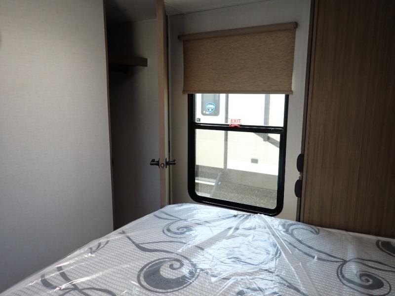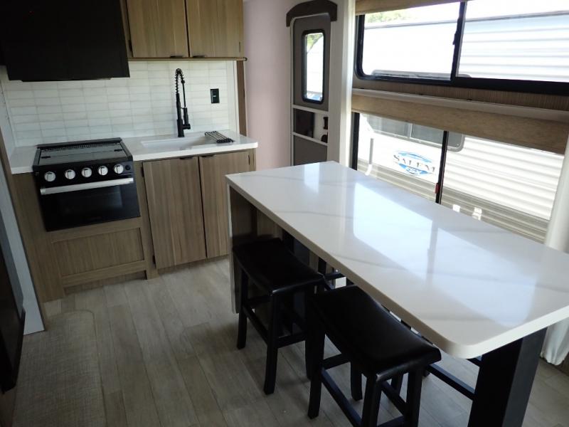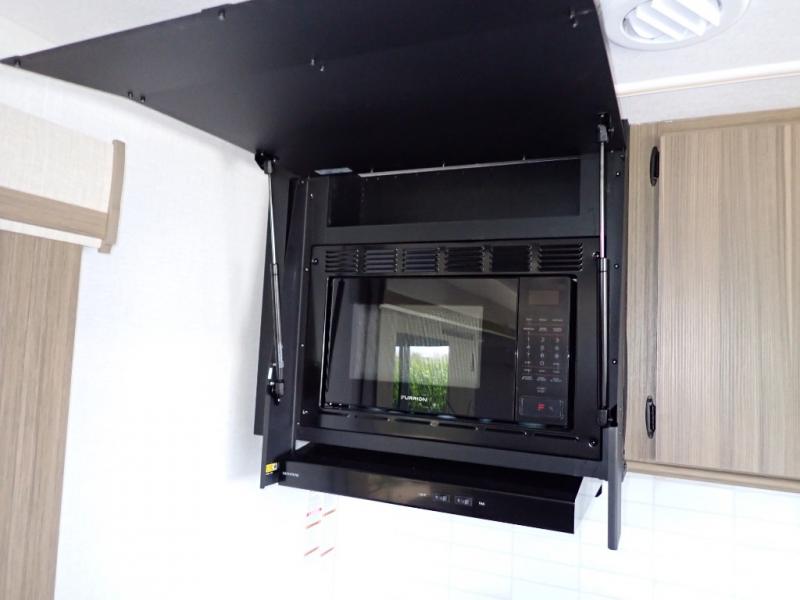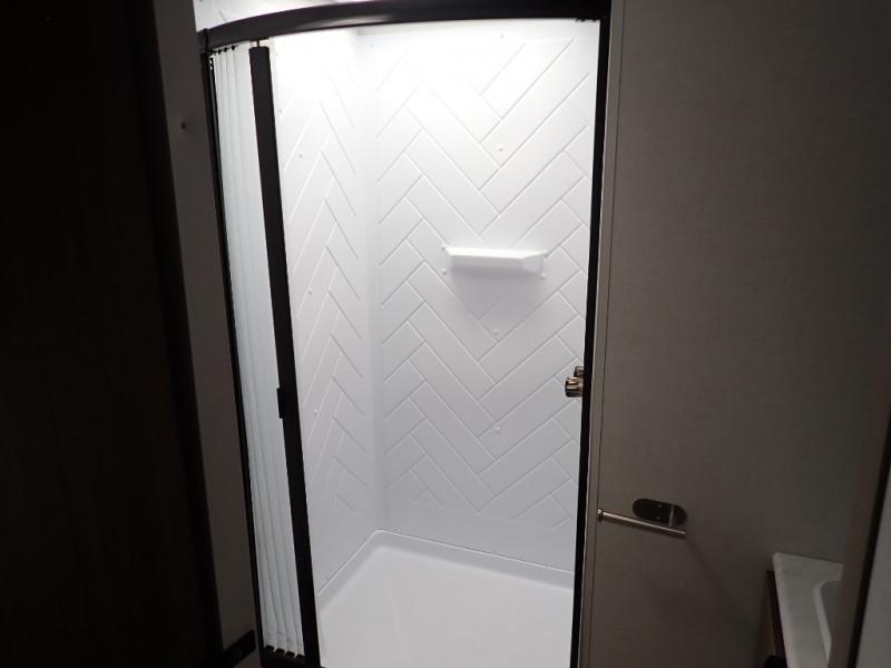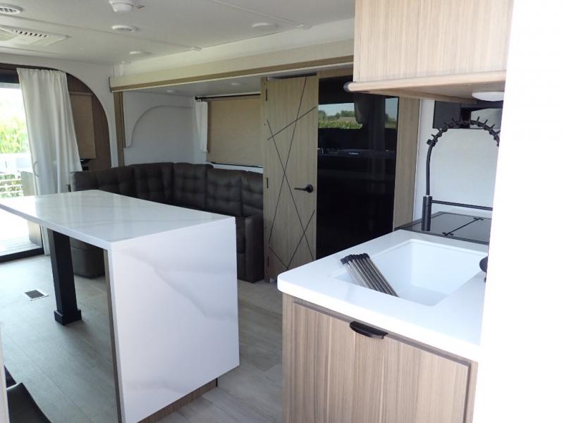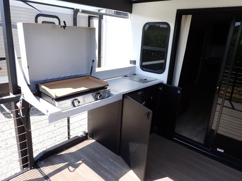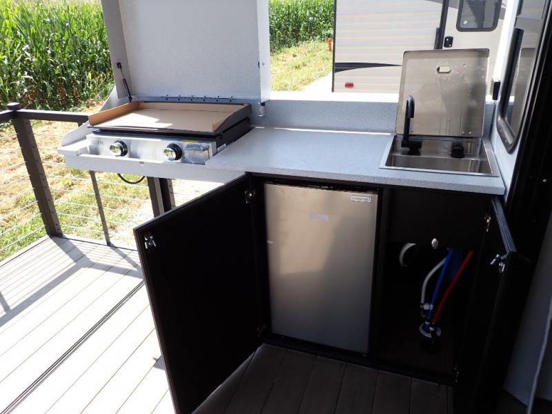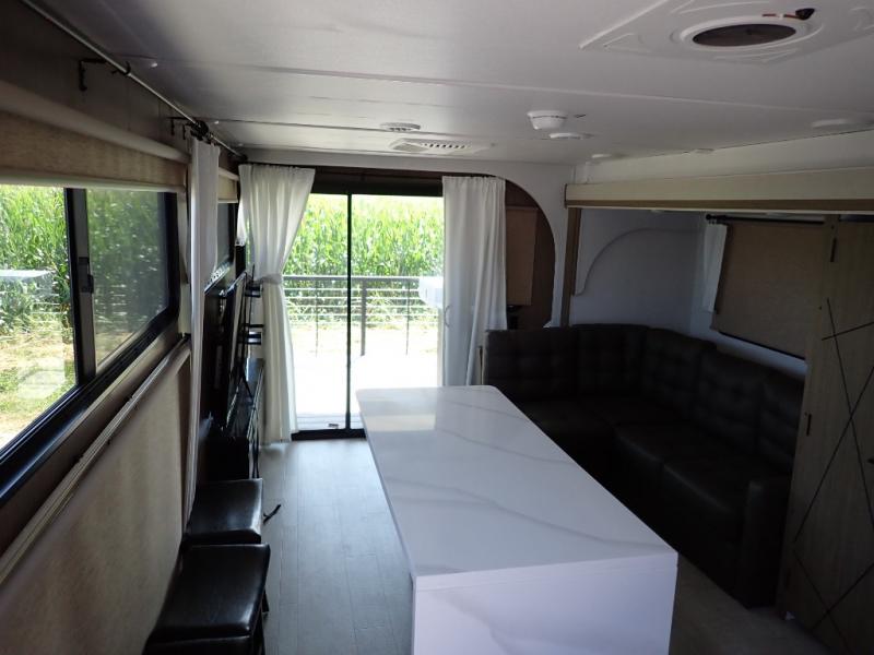 This travel trailer will feel more like home with its rear veranda/porch, dual entry doors, and front private bedroom! There is an outdoor kitchen on the back porch so you can make lunch in the fresh air, and the patio doors lead right into the main living area. Your crew can relax on the L-shaped sofa across from the fireplace, which will make your space more cozy. A kitchen island with four chairs will provide a place to dine at, and there is a spacious pantry and refrigerator for food storage. You will love having your own space in the private bedroom, and the Versa-Tilt custom king bed will let you sit up in bed to read your book at night.