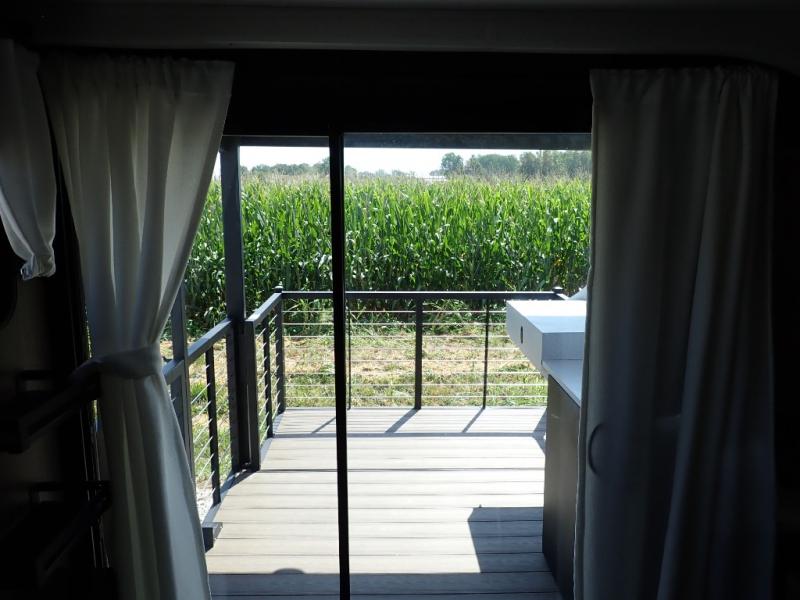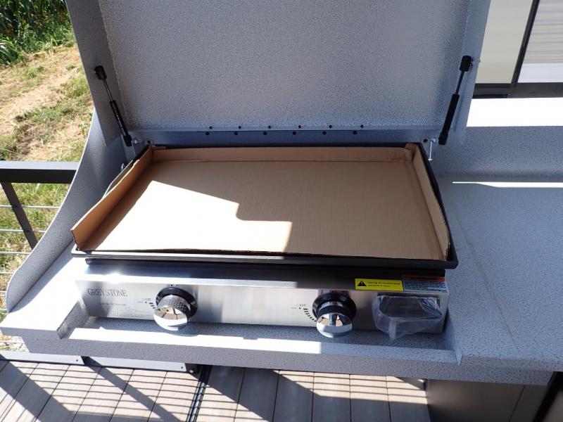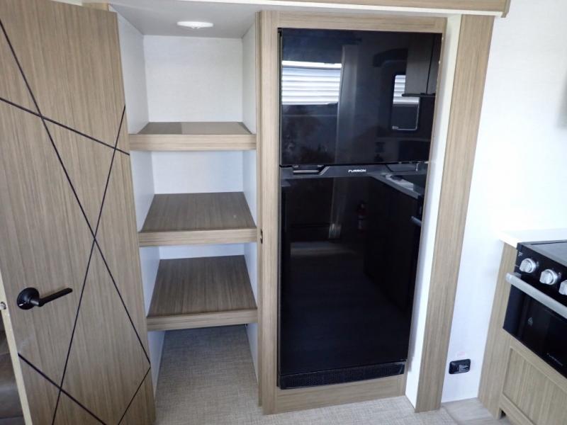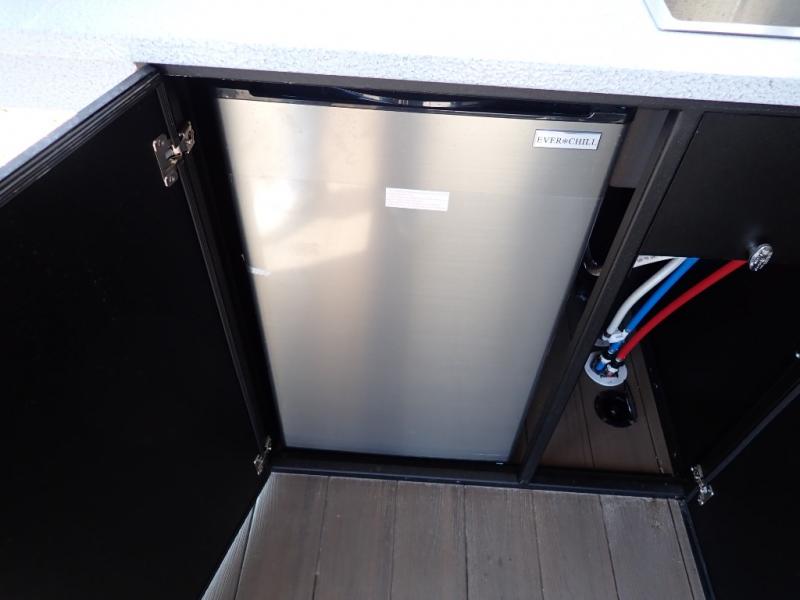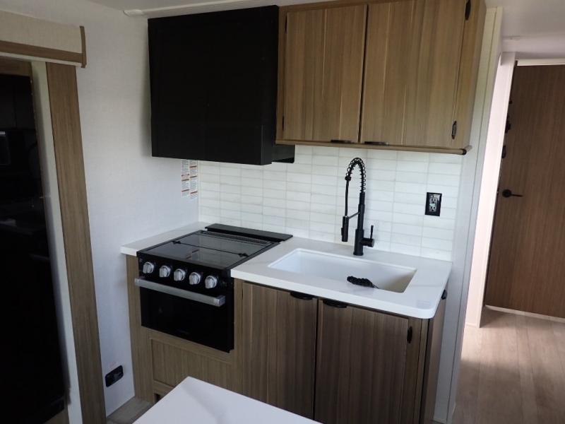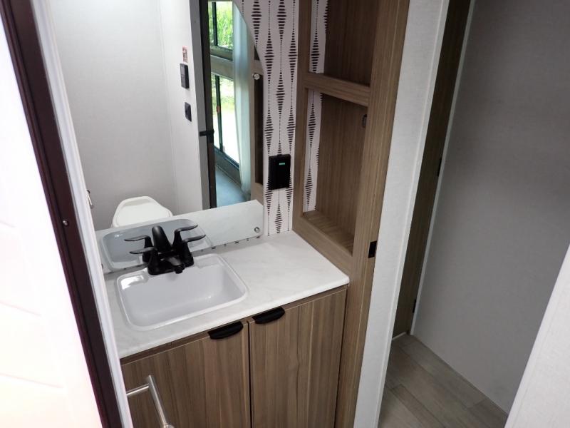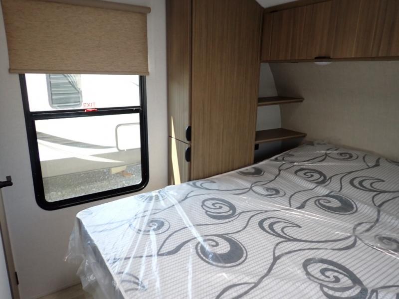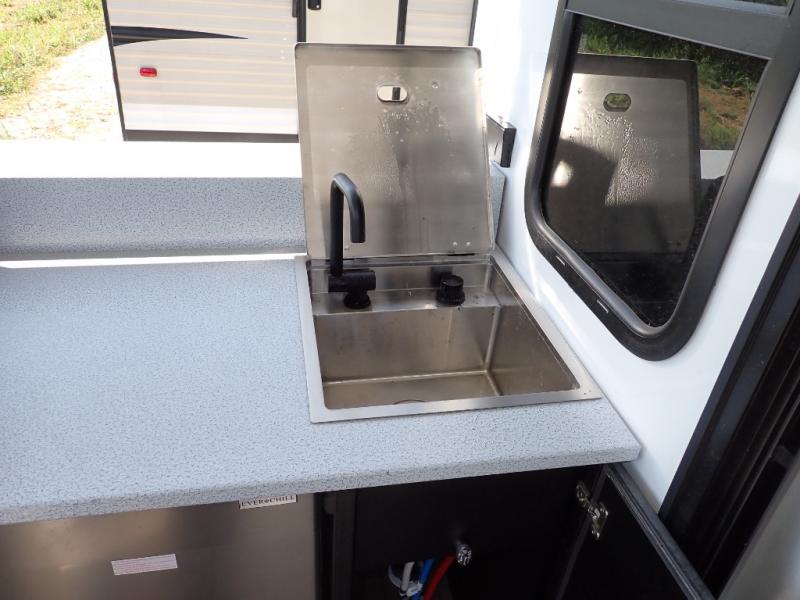 This travel trailer will feel more like home with its rear veranda/porch, dual entry doors, and front private bedroom! There is an outdoor kitchen on the back porch so you can make lunch in the fresh air, and the patio doors lead right into the main living area. Your crew can relax on the L-shaped sofa across from the fireplace, which will make your space more cozy. A kitchen island with four chairs will provide a place to dine at, and there is a spacious pantry and refrigerator for food storage. You will love having your own space in the private bedroom, and the Versa-Tilt custom king bed will let you sit up in bed to read your book at night.