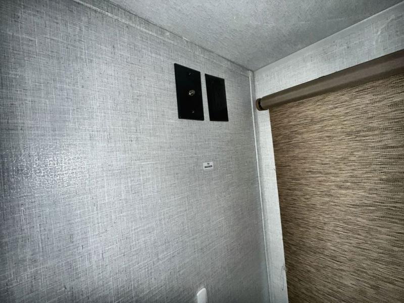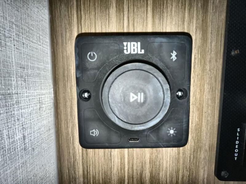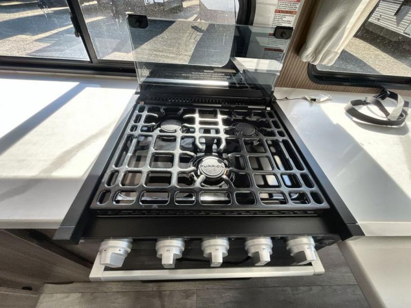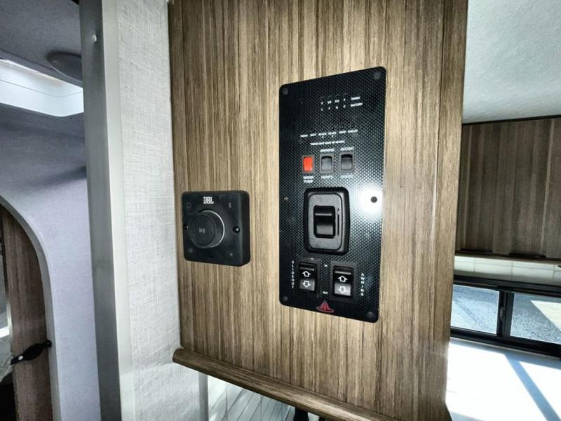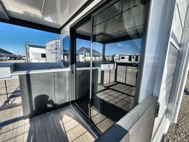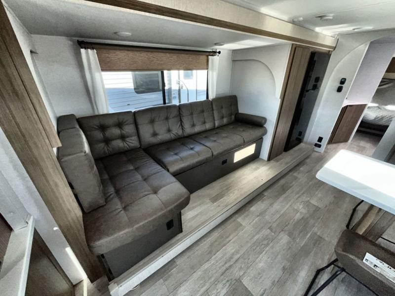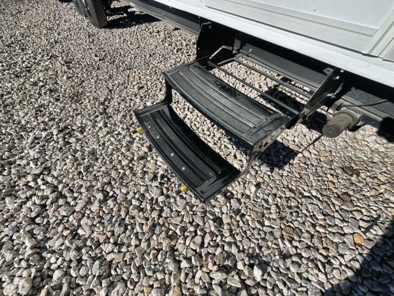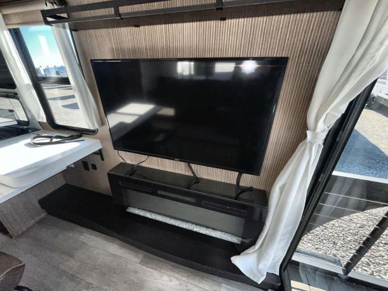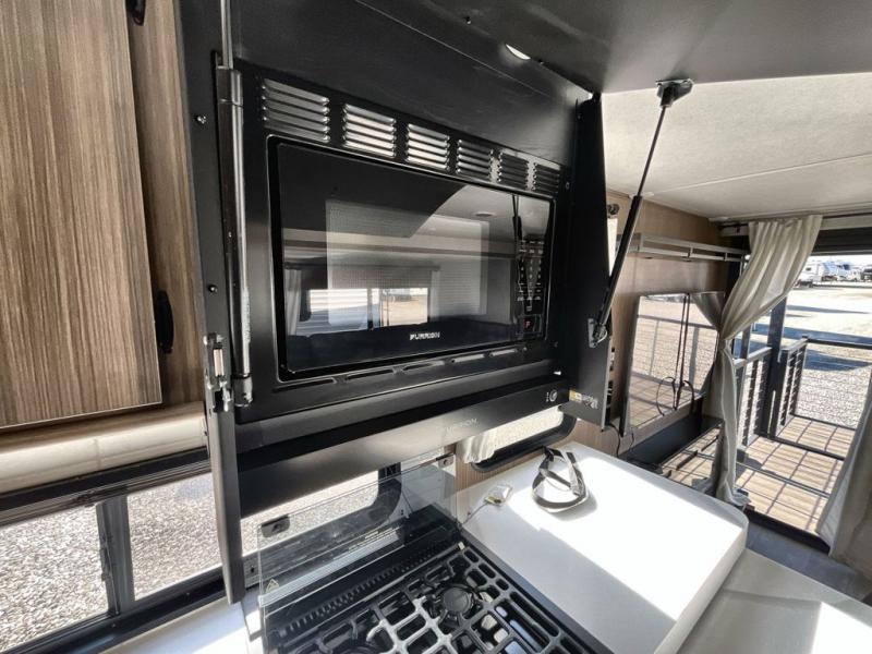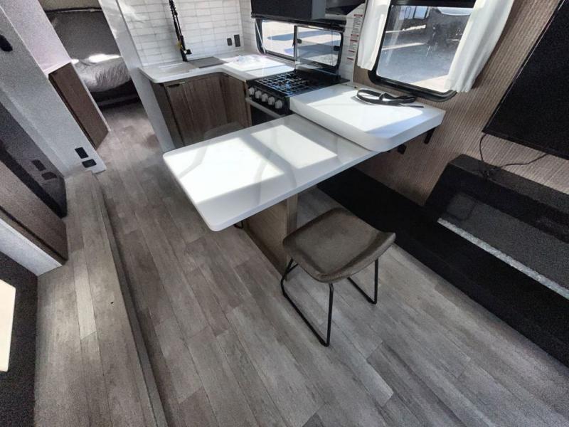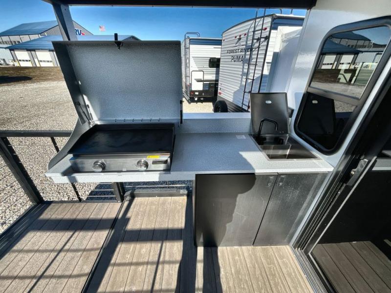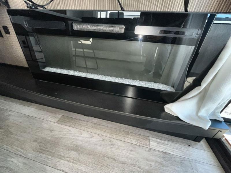 This travel trailer will feel more like home with its rear veranda/porch, dual entry doors, and front master bedroom! There is an outdoor kitchen on the back porch so you can make lunch in the fresh air, and the patio doors lead right into the main living area. Your crew can relax on the L-shaped sofa across from the fireplace, which will make your space more cozy. The U-shaped kitchen counter includes a pull-out table for even more counter space, and the walk-thru bath is easily accessible for everyone to use. You will love having your own space in the master bedroom, and the Versa-Tilt custom king bed will let you sit up in bed to read your book at night. One of the dual entry doors is also found here for added convenience!