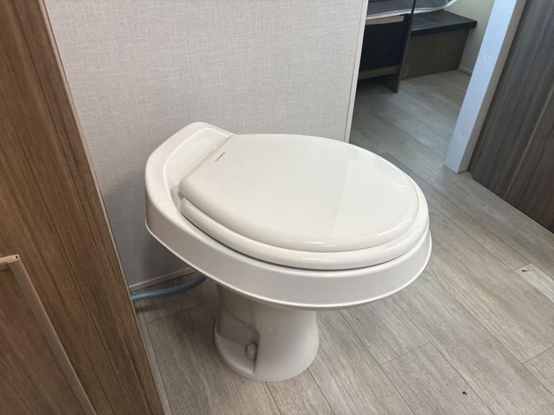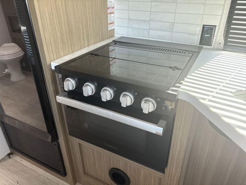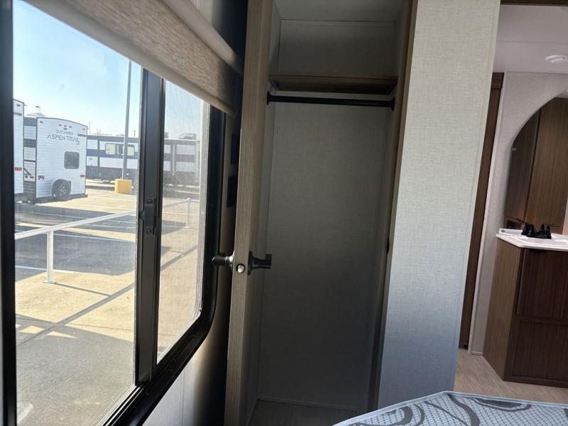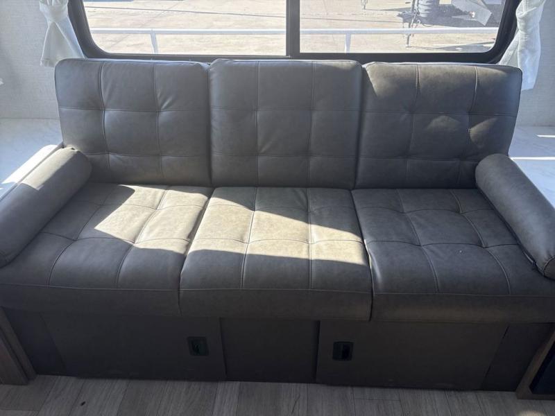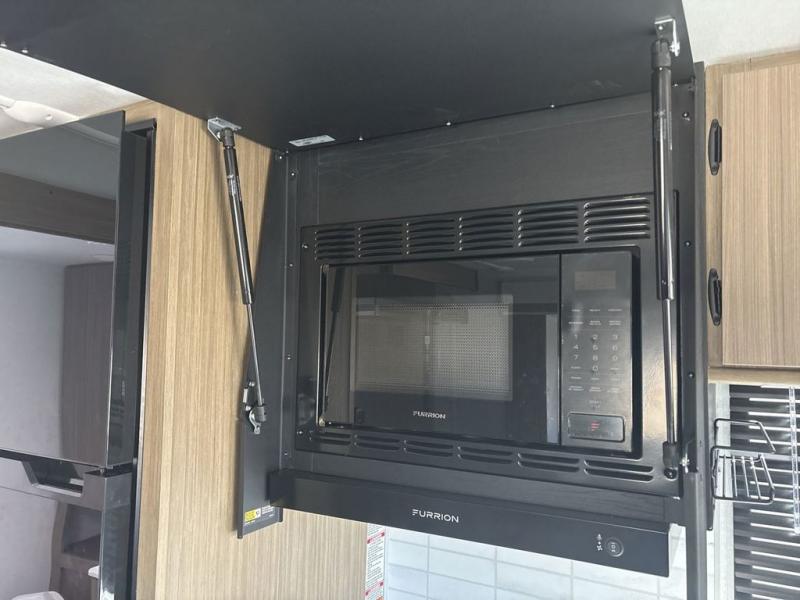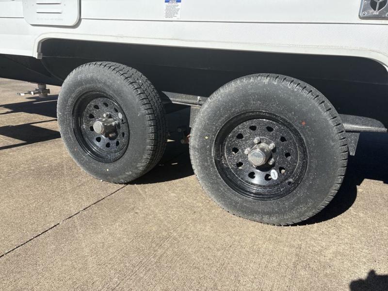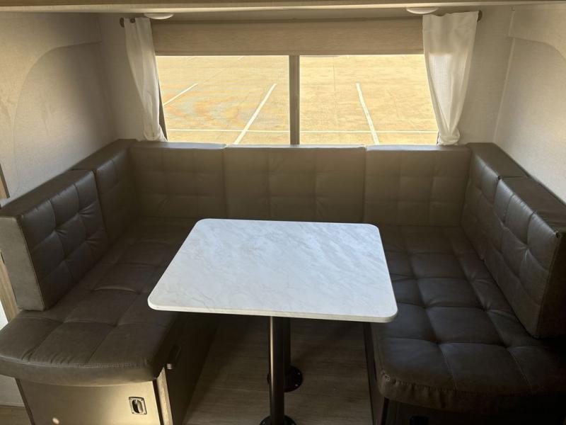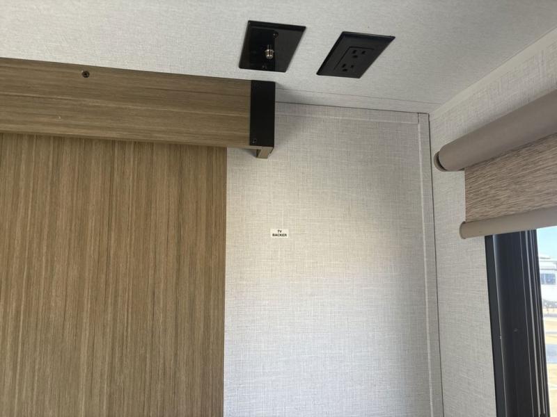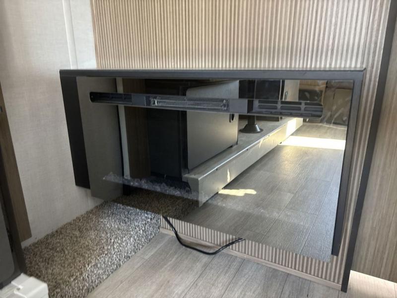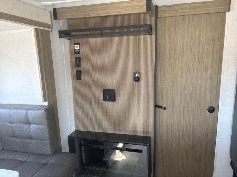 This travel trailer is packed full of features, but is still lightweight coming in at just over 5,000 lbs.! You will feel right at home in the front master bedroom with a custom king bed with Versa Tilt and a closet to keep your clothes tidy. The walk-through bathroom has a walk-in shower with fiberglass surround and a skylight above for added natural lighting as you get ready. The U-shaped dinette slide has a panoramic window for you to enjoy your beautiful scenery as you eat dinner, and there is a fireplace at the entertainment center for a relaxing evening indoors. There is a pass-through storage area to store your outdoor camping gear, and a 16' awning will provide shade as you're visiting outdoors.