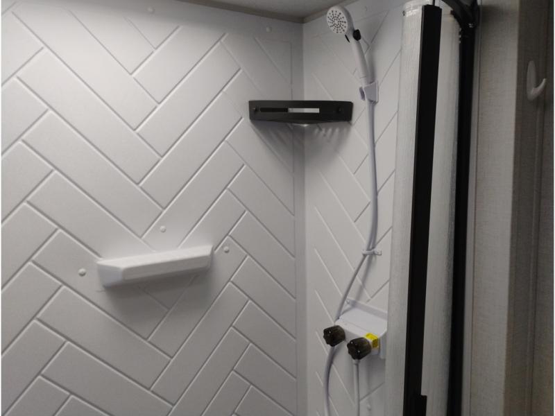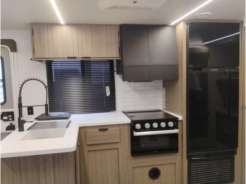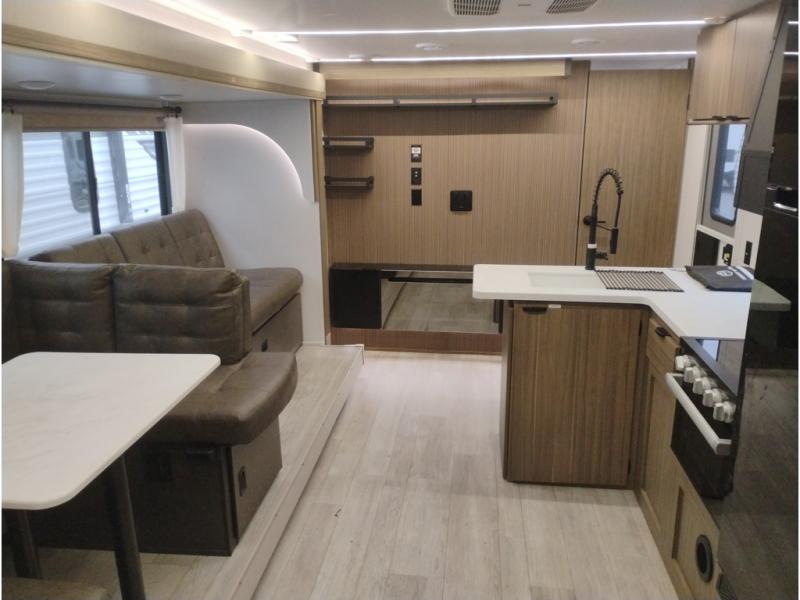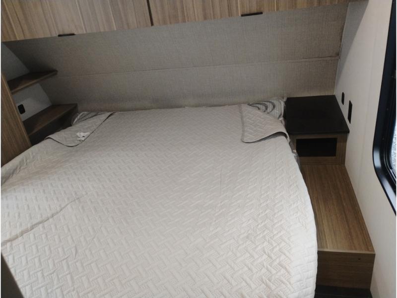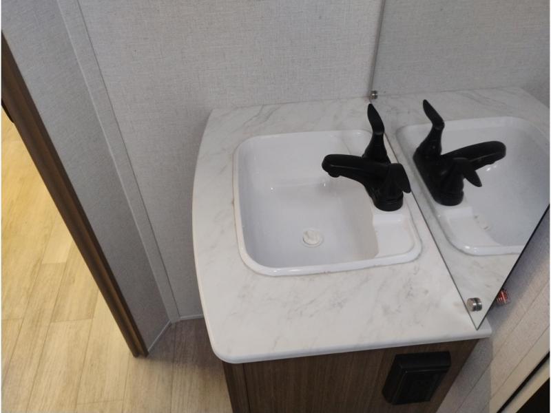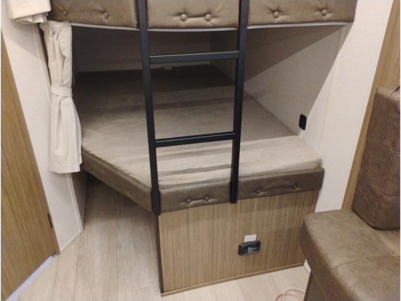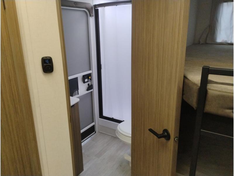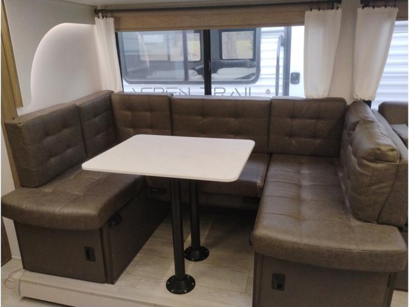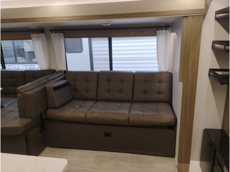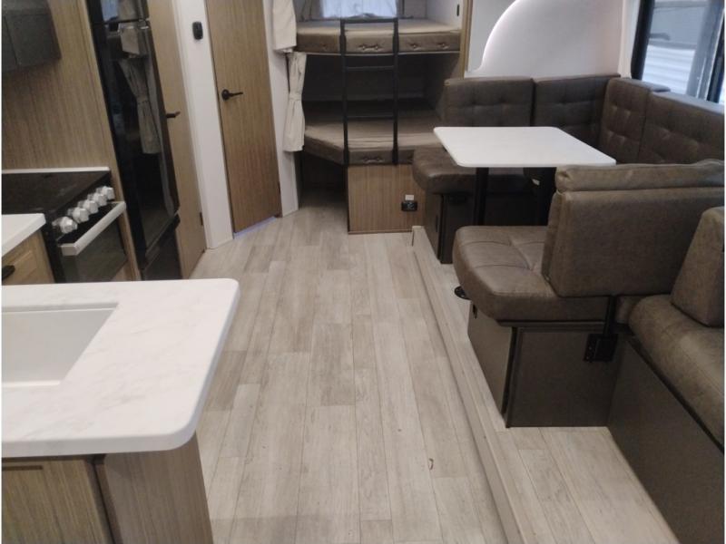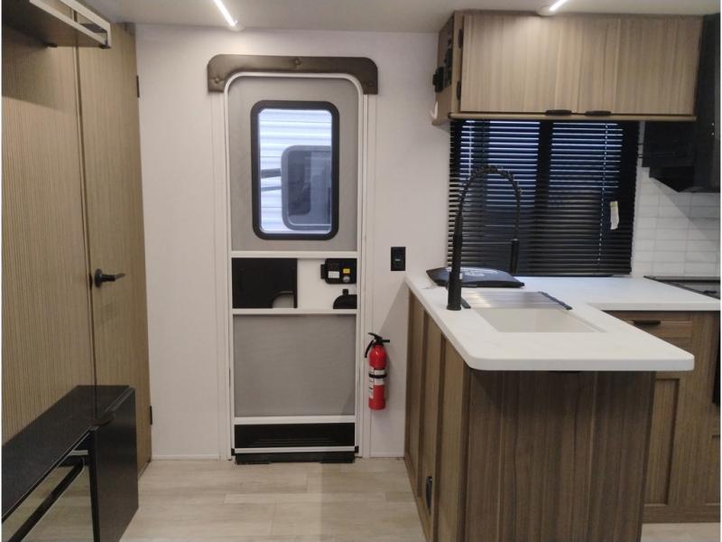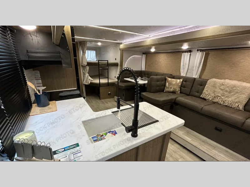 If you're looking for a travel trailer that will meet your family's needs then this one is for you! The kiddos will enjoy a good night's rest on the rear corner double-size bunk beds and you will enjoy a good night's rest on the custom king bed with Versa Tilt inside the front private bedroom. You can also transform the U-shaped dinette and Versa-lounge into extra sleeping spaces. One of the dual entrances leads directly into the rear corner bathroom which has a walk-in shower for you to get squeaky clean each morning. The walk-in pantry is big enough to store your favorite snacks and the oversized refrigerator will keep your beverages nice and cold. There is also an exterior camp kitchen you are sure to love!
