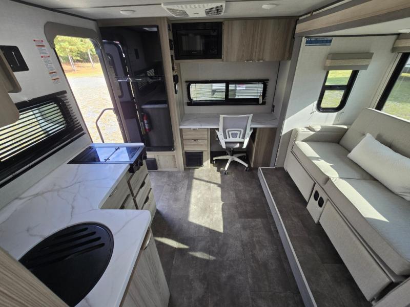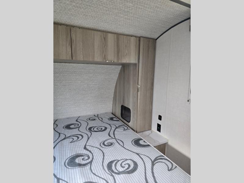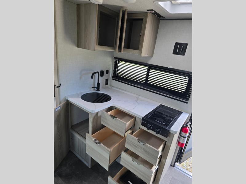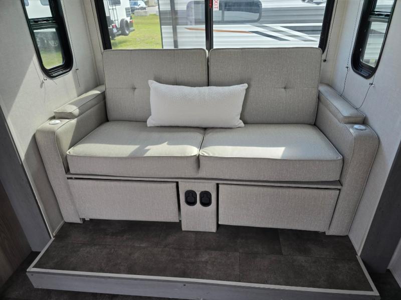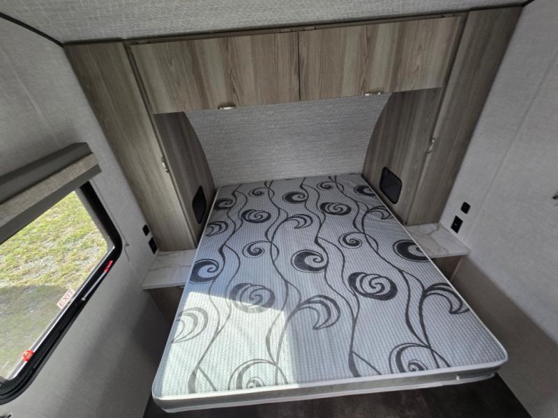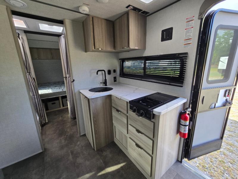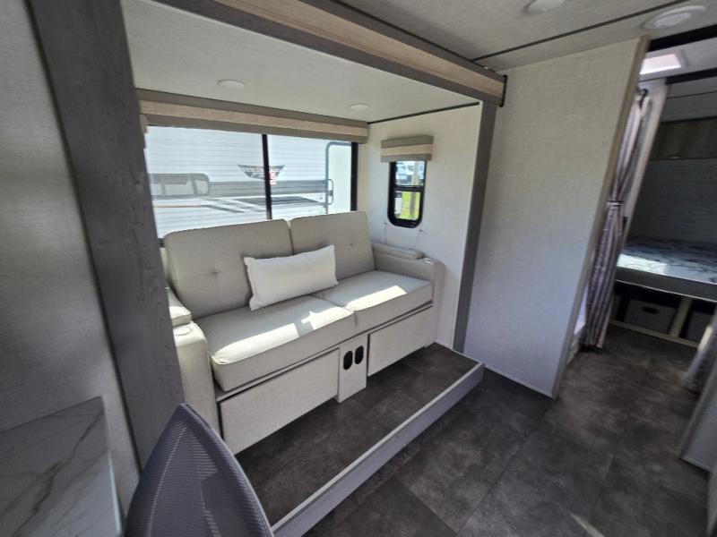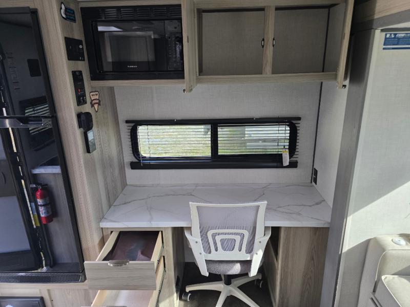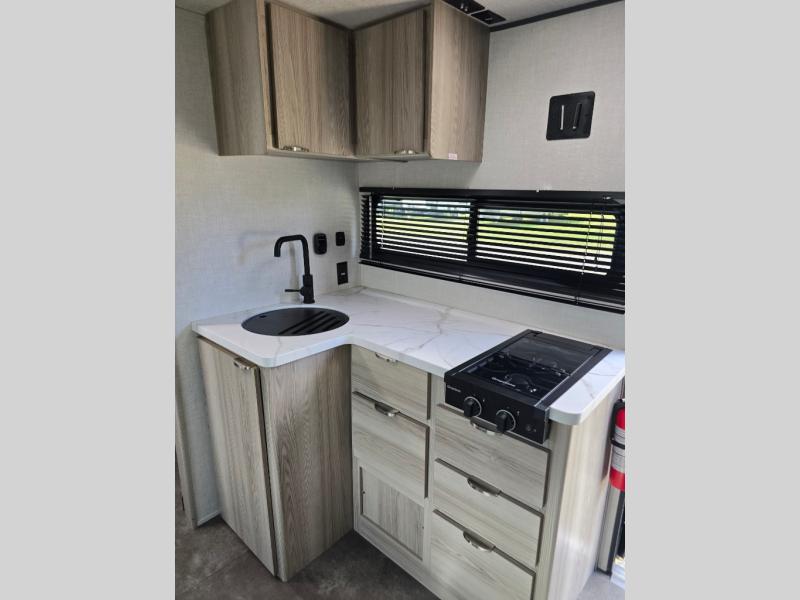 You're going to love every minute spent in this couple's trailer. The queen bed in the front private bedroom will provide a great night's rest, and there are dual wardrobes to easily get dressed in the morning. Head to the kitchen through the bath, then prepare eggs and bacon on the two burner cooktop. There is theater seating here to enjoy your coffee at each morning, or you may want to get some work done at the mobile workstation!