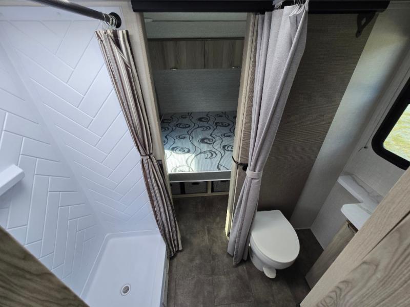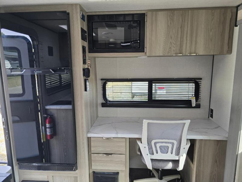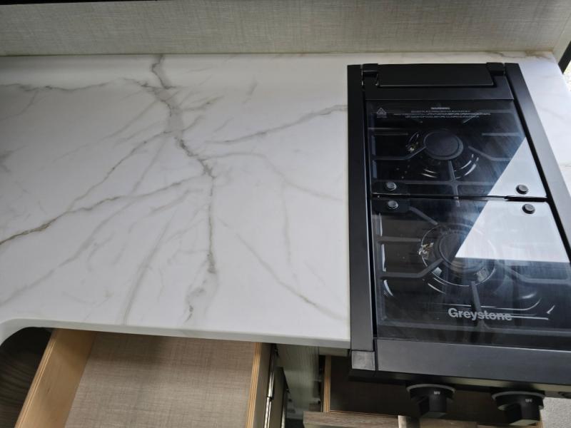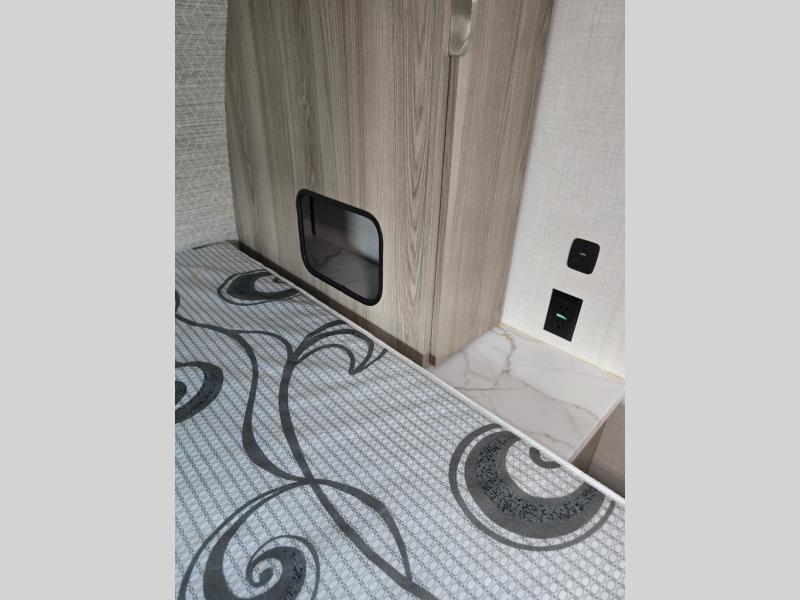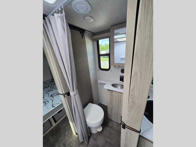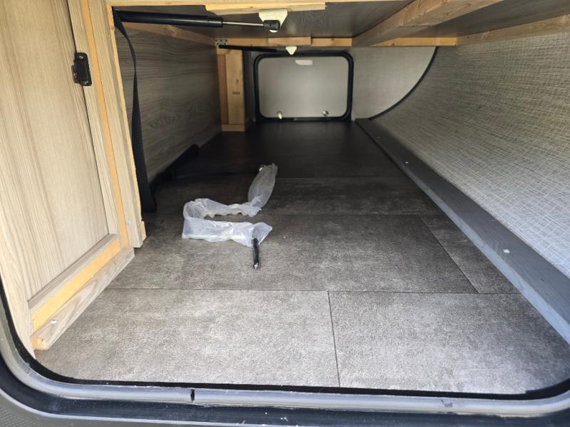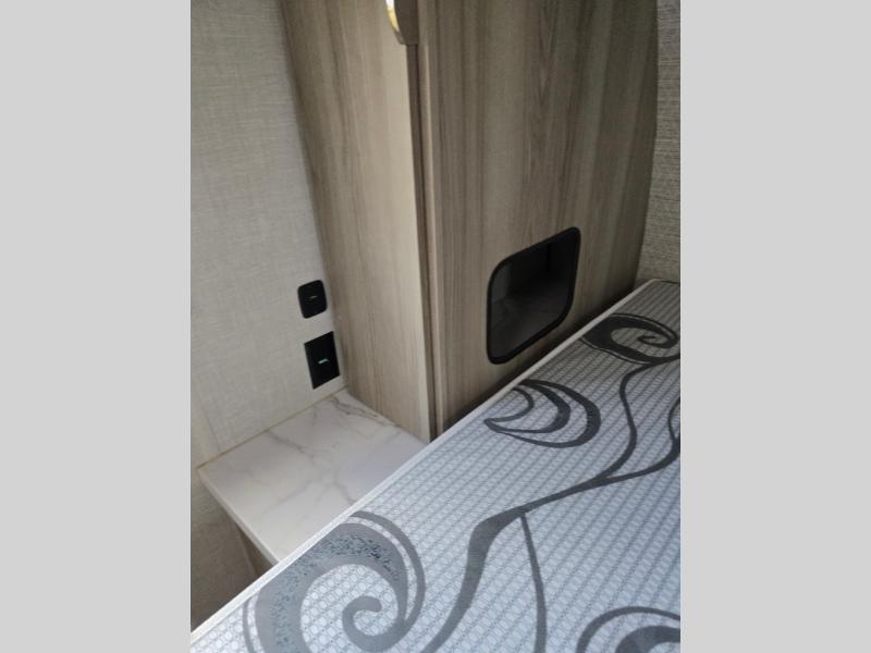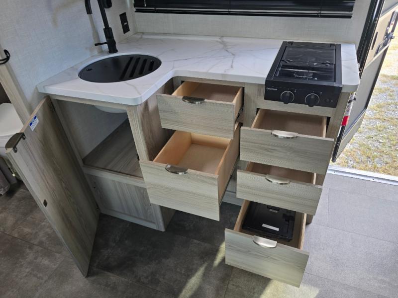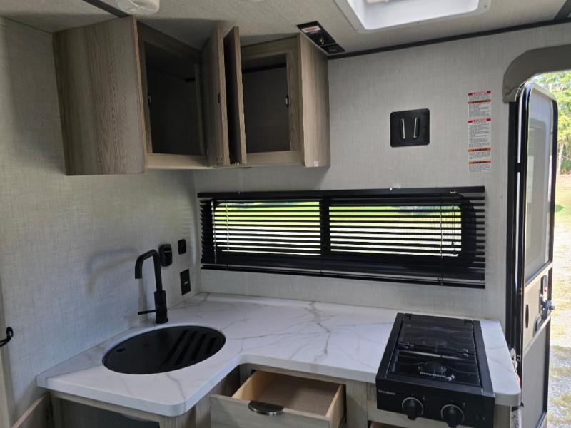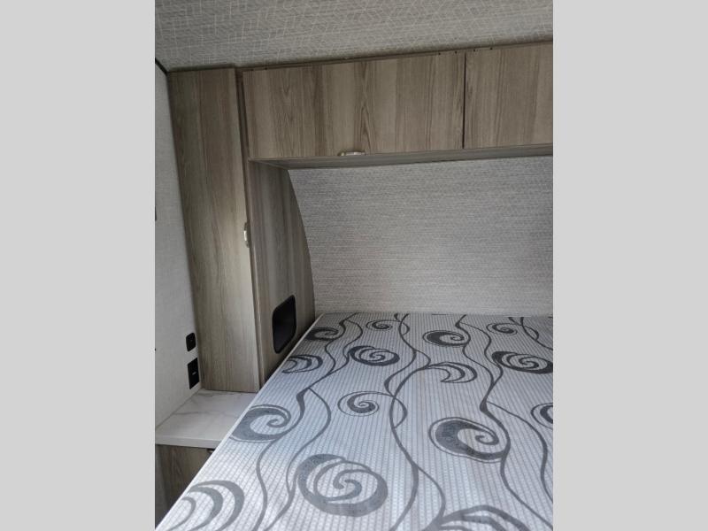 You're going to love every minute spent in this couple's trailer. The queen bed in the front private bedroom will provide a great night's rest, and there are dual wardrobes to easily get dressed in the morning. Head to the kitchen through the bath, then prepare eggs and bacon on the two burner cooktop. There is theater seating here to enjoy your coffee at each morning, or you may want to get some work done at the mobile workstation!