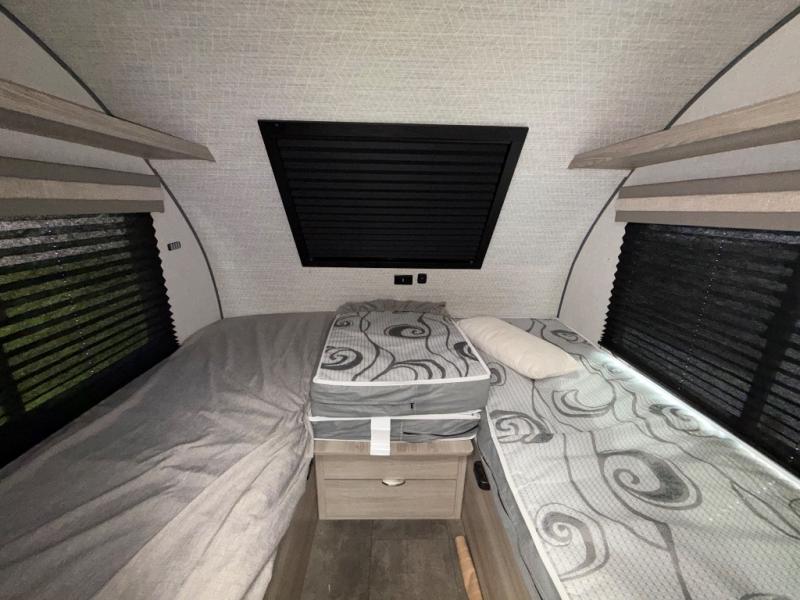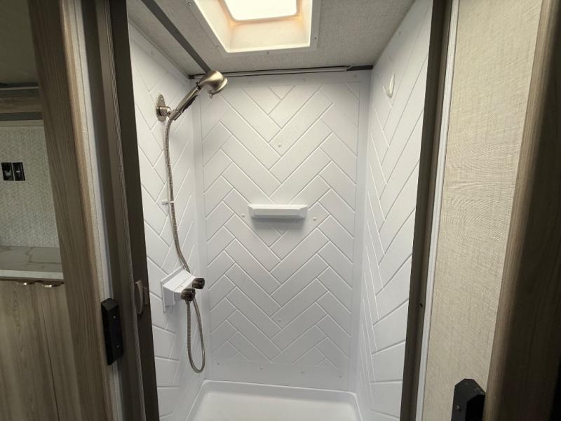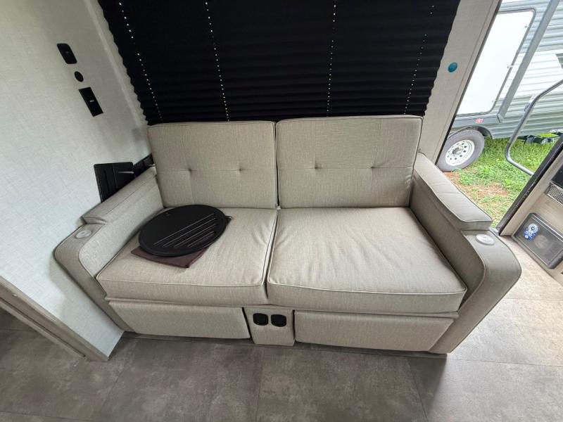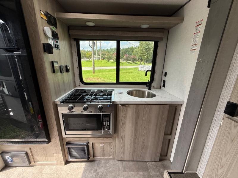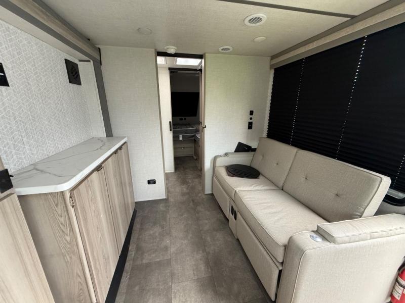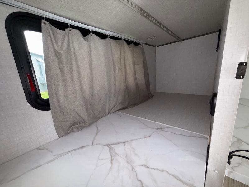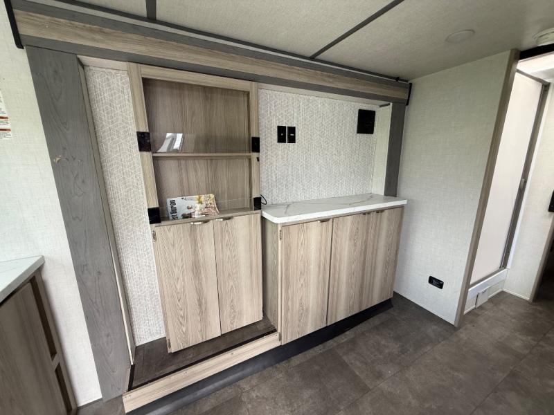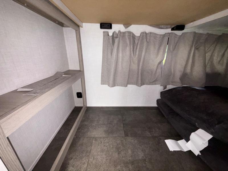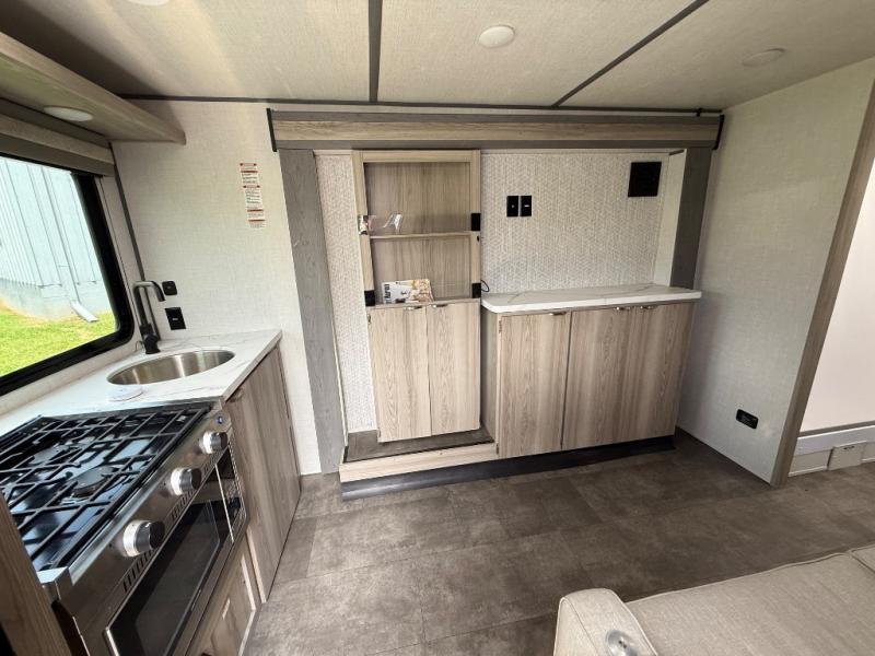 Versatility is found throughout this travel trailer! The front two twin beds convert to a king bed for comfortable sleeping at night, plus there is a split bunk bed slide for an additional sleeping space. The bunk bed is located behind the spice rack door and TV for your entertainment and cooking needs. Speaking of cooking, you can prepare your best home cooked meals with the cooktop and store any leftovers in the dual swinging 12V refrigerator. Relax each night in the theater seating and freshen up in the walk-through bathroom each morning. If you wish to go off grid then you can add the optional solar extended 200W power package!
