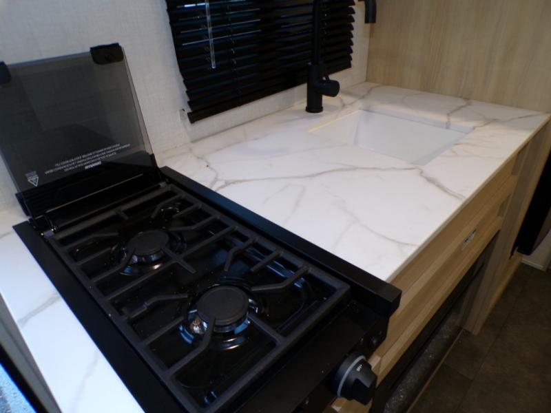 Camping is made easy in this Limited Edition Value trailer that can sleep five to six each night thanks to the bunk beds, front queen bed, and sofa! There is a private shower and toilet so you can freshen up each day, and a kitchen with a two burner cooktop to make meals. You will also find a large baggage door for exterior storage, a powder coated I-beam chassis for durability, plus backup camera prep to make parking easier!