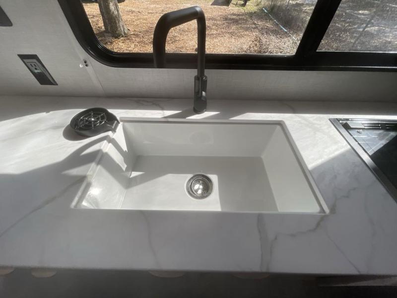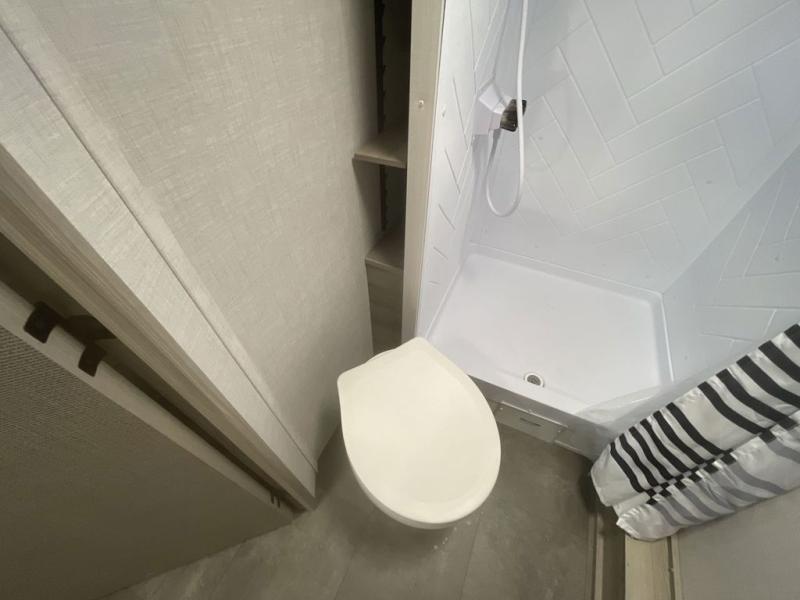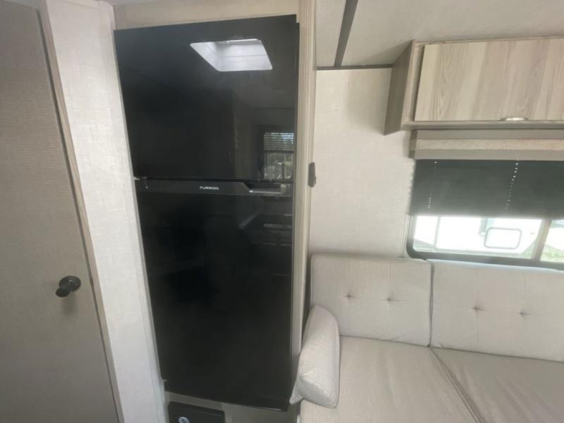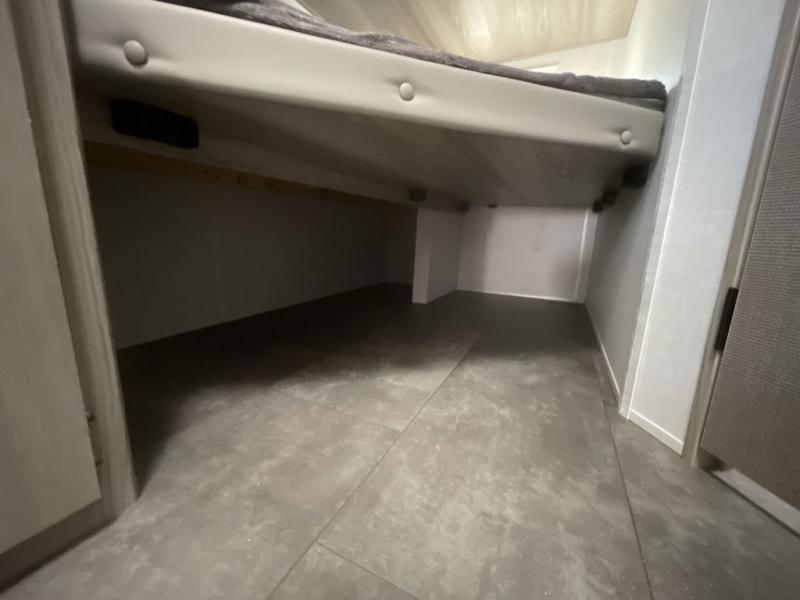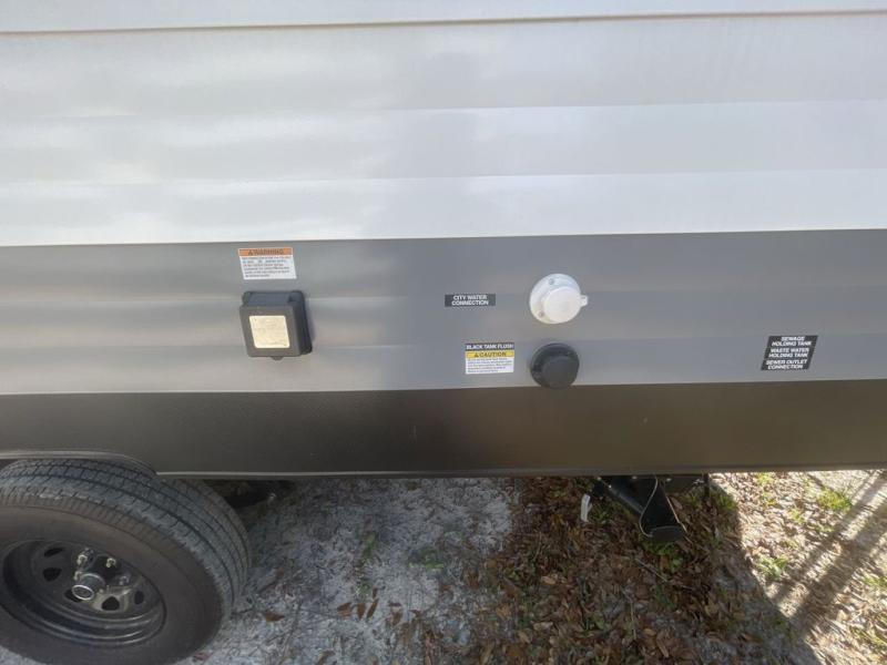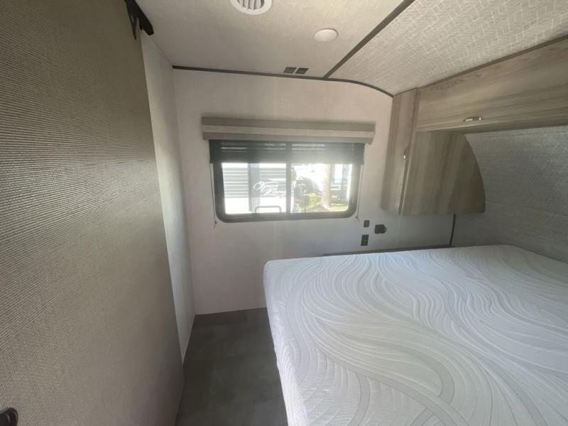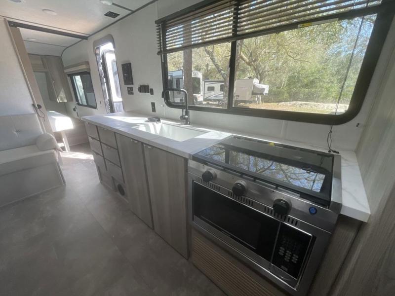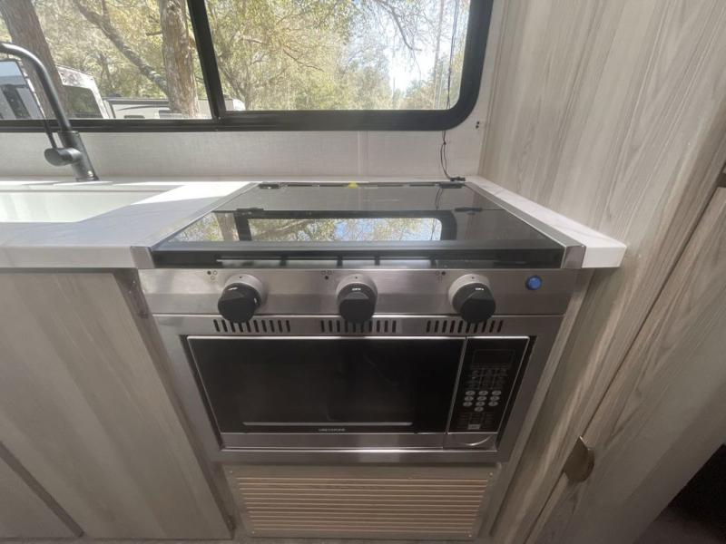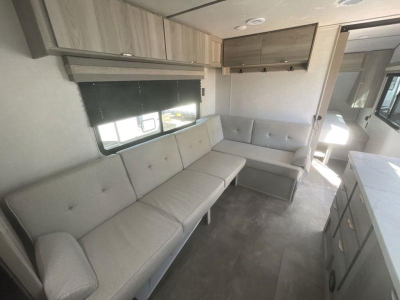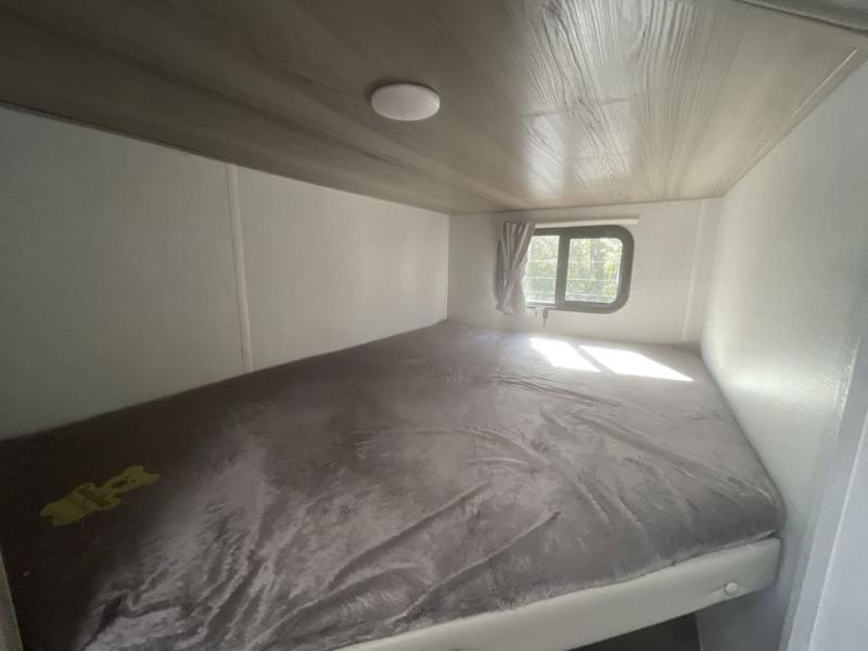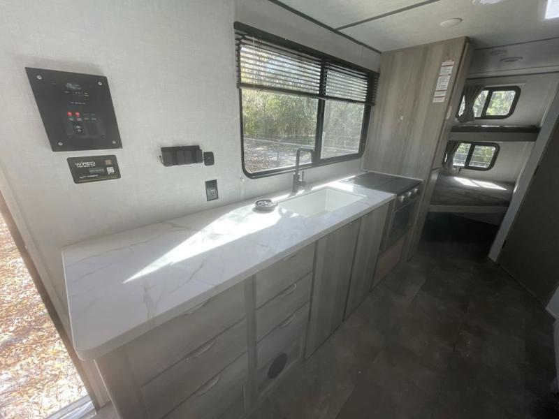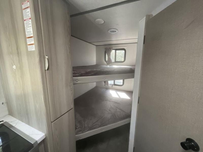 Camping is made easy in this travel trailer with more sleeping space and lots of comforts! The kids or your guests will enjoy the double-size bunks in the back, along with the full bath close by for easy nighttime use. You'll have the front private bedroom with a king bed all to yourselves, and there are dual bedroom wardrobes to keep your space neat and clean. Everyone can meet in the combined kitchen and living room to relax on the super U-lounge with a removable table while the chef of your group makes breakfast on the two burner cooktop. There is also a microwave oven for quick meals, plus a pantry and refrigerator for food storage!