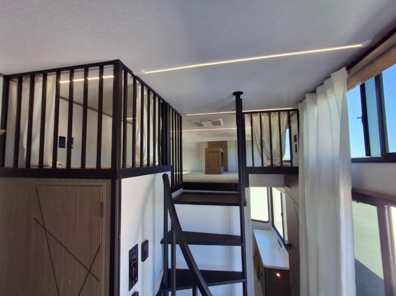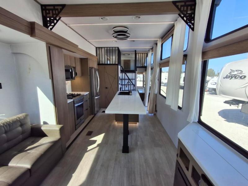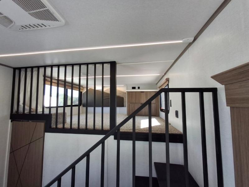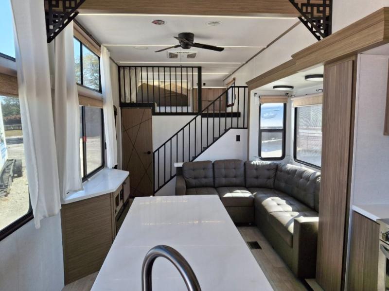 You will feel like you are home when you step inside! Not only will you be impressed with the large slide in the main combined kitchen and living area, but check out the island with four seats! The main entry closest to the front features a step up to a private bedroom featuring a custom king bed with Versa-Tilt within a slide, plus a fireplace, wardrobe, and a dress for your belongings. Just outside this door is a half bath around the corner and a spiral staircase to the front loft with two 42" x 74" bunk mats above. The kitchen is fully equipped for you to provide the best home cooked meals with a roll-out pantry, range and microwave, plus side-by-side refrigerator all part of the large slide that also houses an L-shaped sectional sofa with ottoman so everyone can have a seat! Opposite the sectional find an entertainment center with pop-up TV and fireplace. A second set of stairs leads up to the rear loft featuring a 62" x 74" Versa Queen mattress and a dresser. Back down in the very back of the unit, there is a large bathroom with a walk-in shower, linen cabinet, toilet, and vanity with a sink. There is also a space that has washer/dryer prep to add even more convenience. Outside, a 26' awning for outdoor living, and double entry doors to make it easy to move in and out.