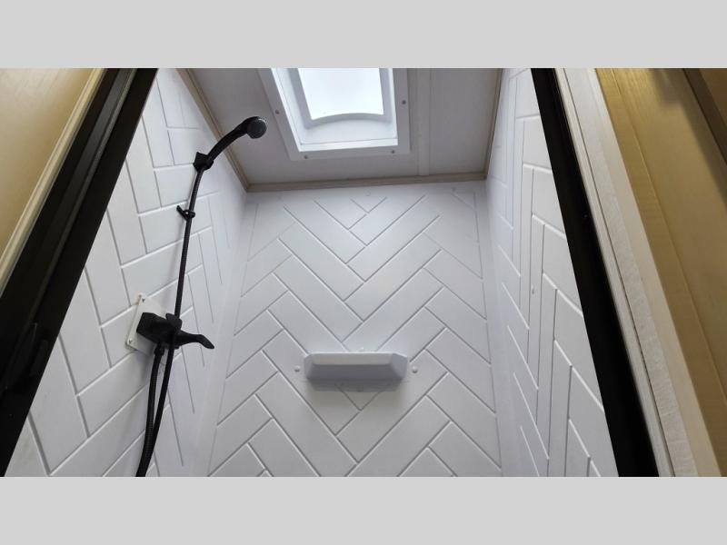 Step inside this luxurious travel trailer and see all that it has to offer! You will enjoy a good night's rest each night on the queen bed with Versa Tilt with wardrobes on either side to keep your clothes wrinkle free, and if you have a couple of guests then you can convert the rear tri-fold sofa or the booth dinette into a sleeping space. The 30" x 36" walk-in shower with a skylight above invites you to take a hot, steamy shower after a fun-filled day outdoors. Once you're cleaned up, you can grab some leftovers from the 10 cu. ft. 12V black refrigerator and warm it up in the microwave. There is also theatre seating across from the 50" LED TV with a fireplace below!