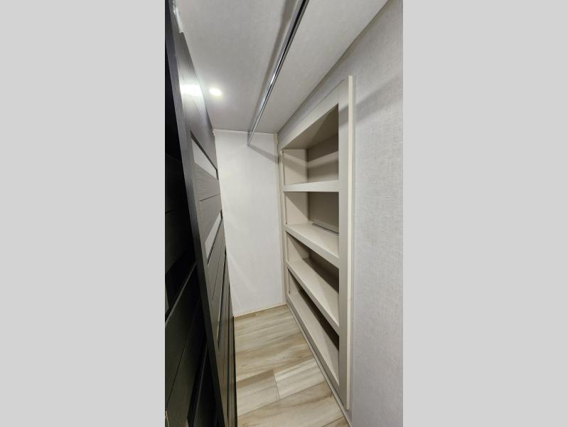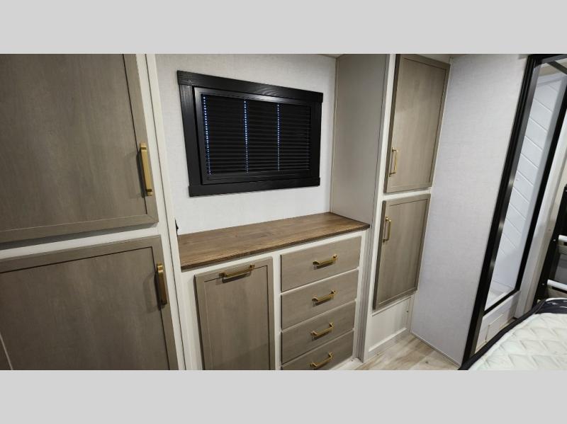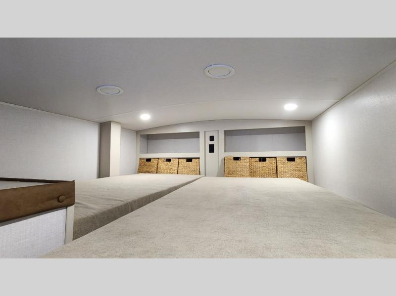 It's easy to see why this fifth wheel is named 375FAM; it's for the whole family or group of friends! There are two private bedrooms, two full baths, a loft, and four slides for tons of space! The front bedroom includes a custom king bed, a dresser with a bench beside it, plus a walk-in closet with shelves and washer/dryer prep! Head to the rear master bedroom to find a custom queen bed, dual wardrobes, plus a rear bath with the second entry door! The loft above this room includes two bunk mats and storage for your guests' things, or you can utilize this space for storage if you don't have extra campers tag along. Everyone can meet in the main living area/kitchen that includes table and chairs, theater seating, a spacious kitchen island with an extension, plus an entertainment center with a fireplace. There is also a 16 cu. ft. 12V refrigerator and walk-in pantry for food storage galore!