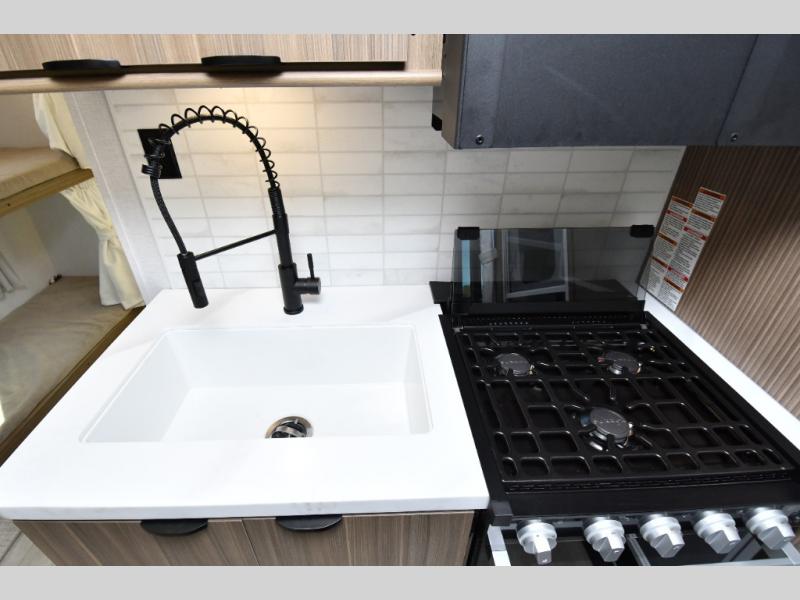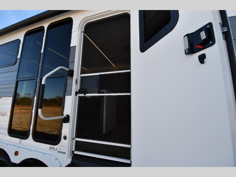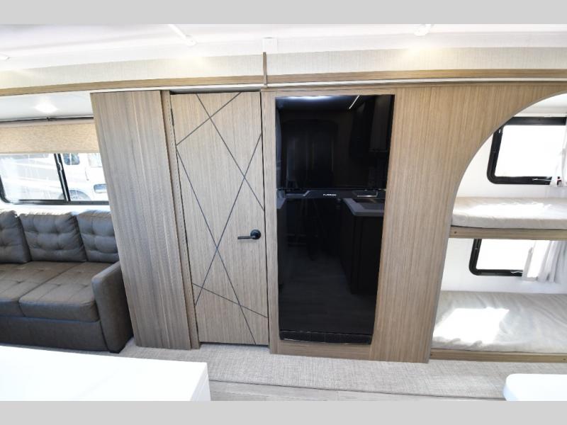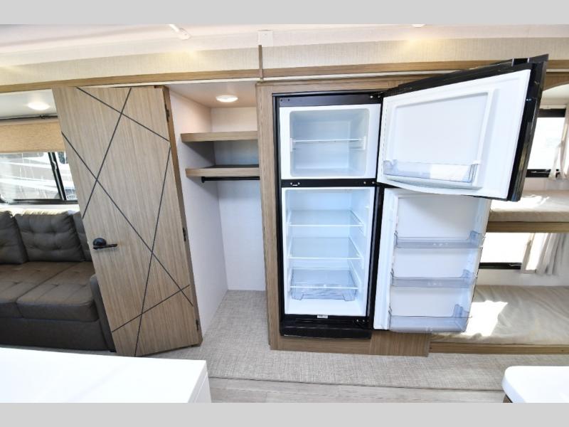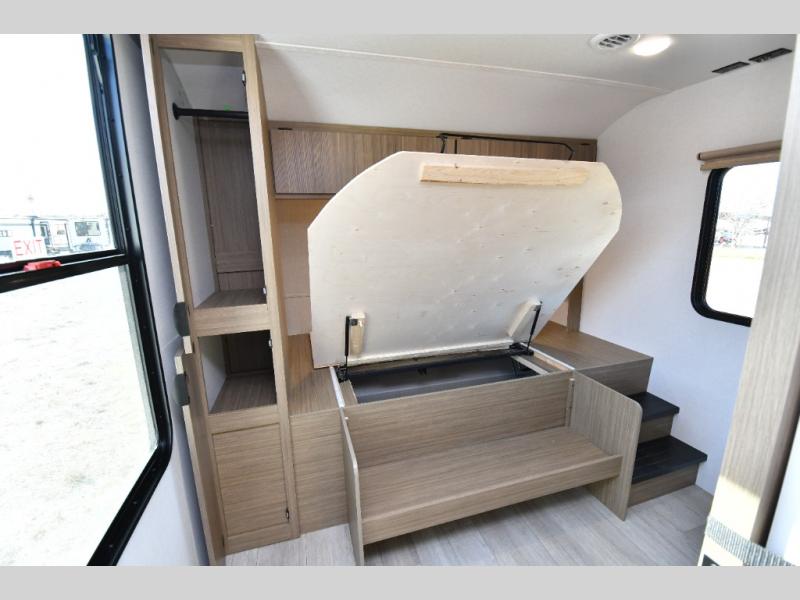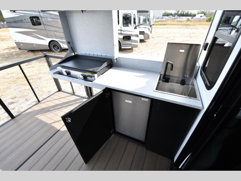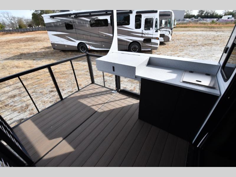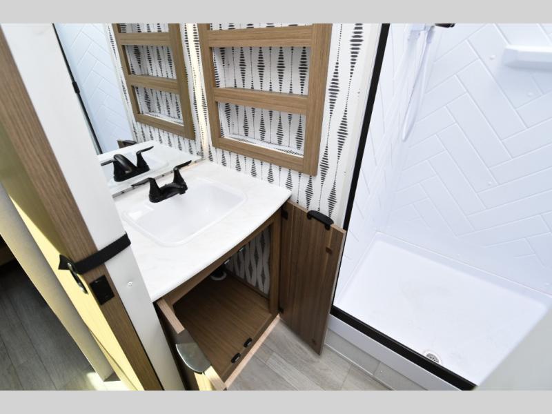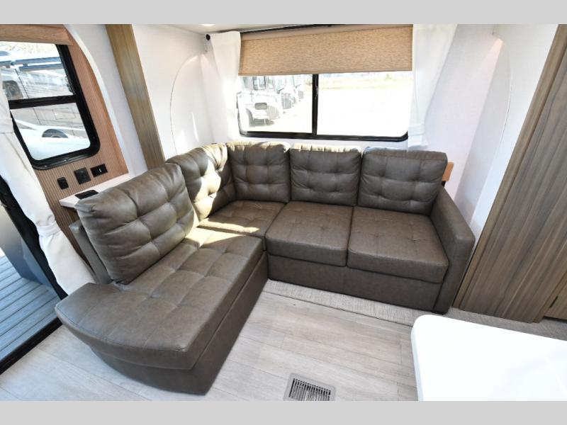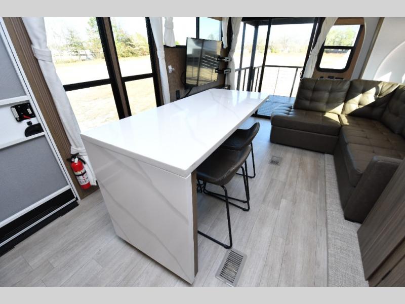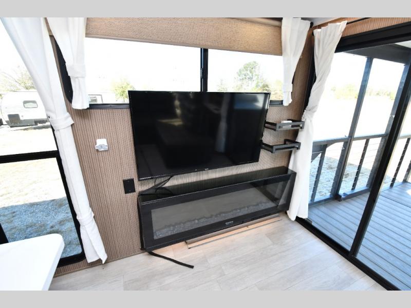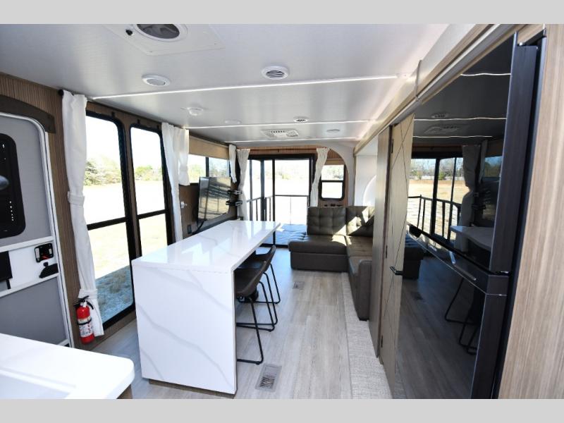 From the moment you step inside, the Salem Veranda 34 impresses with its bright, open floorplan and home-like design. The front living area offers large panoramic windows, plush seating, and a deluxe entertainment center that’s perfect for cozy evenings in. The kitchen is built for real cooking, featuring residential-style appliances, solid surface counters, and abundant storage. A private rear bedroom provides a peaceful retreat with ample wardrobe space and a comfortable sleeping area, while the spacious bathroom offers a full shower, vanity, and linen storage for everyday convenience. Perfect for extended stays or seasonal living, this destination trailer lets you travel in total comfort and style.