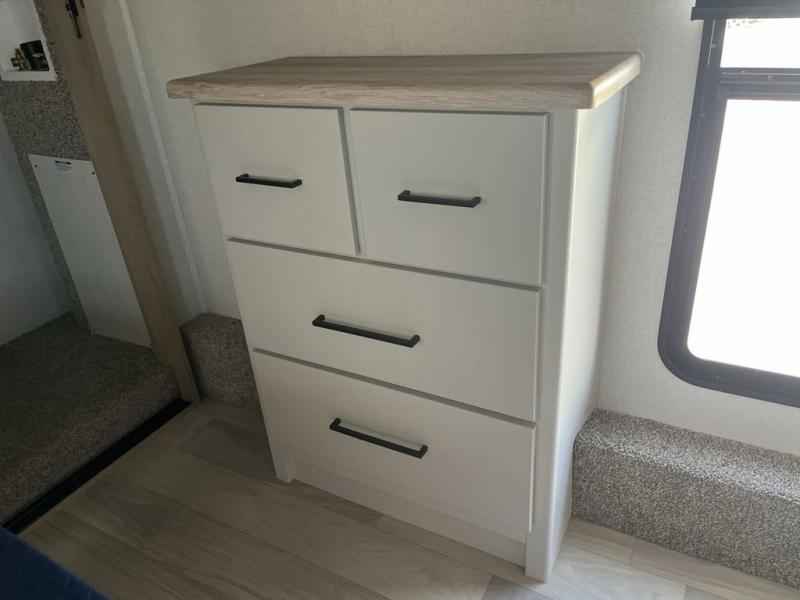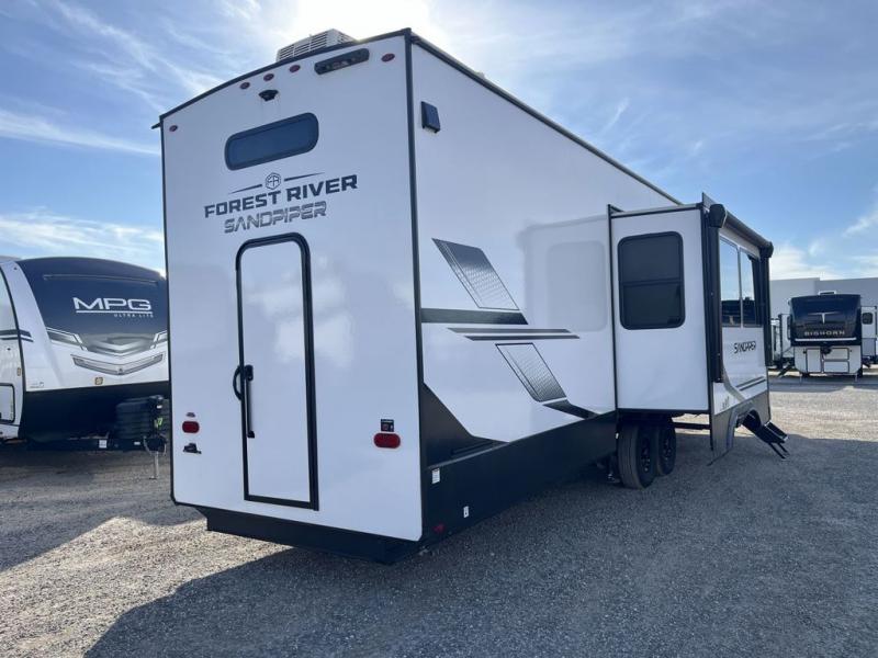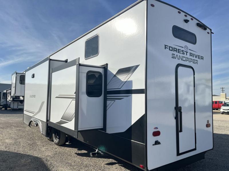You will find the perfect balance of size, space, features, and luxury with any one of these Forest River Sandpiper fifth wheels! They are constructed with a welded aluminum framed vacuum bonded laminated superstructure, a cambered powder coated frame with rust prohibitor, and a fully enclosed underbelly for added protection against the elements. The large tinted windows come with a 80/20 UV prohibitor or you can choose the optional dual pane windows. Some hassle-free amenities include a 60k BTU on-demand water heater, full coach water filter system, tire pressure monitor system, and an electric leveling system! Inside, you'll enjoy stainless steel appliances, solid surface countertops, Beachside Sundance linoleum, recessed residential lighting, and many more comforts!