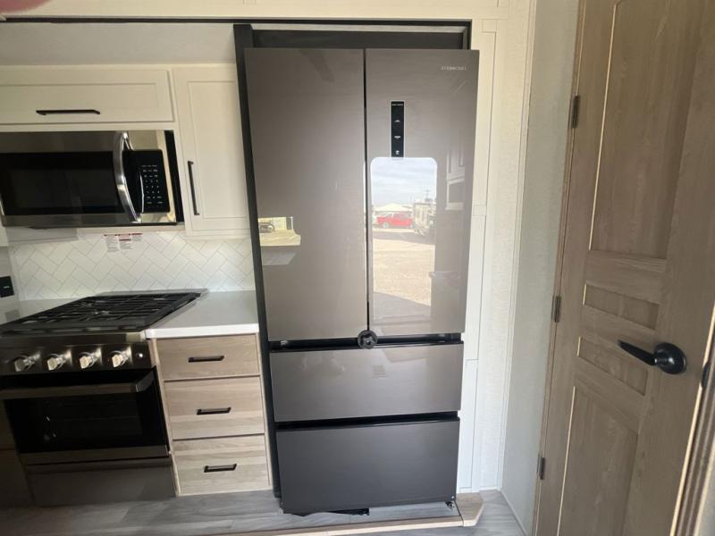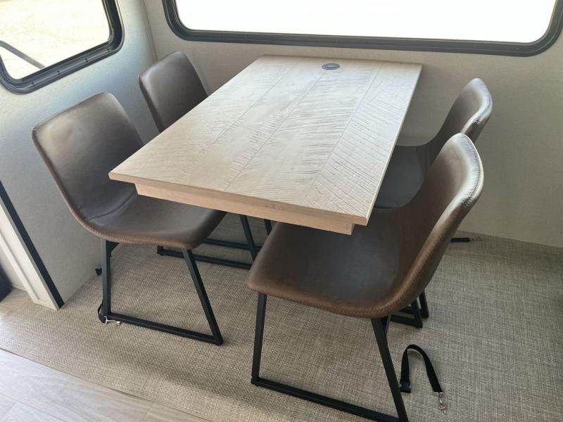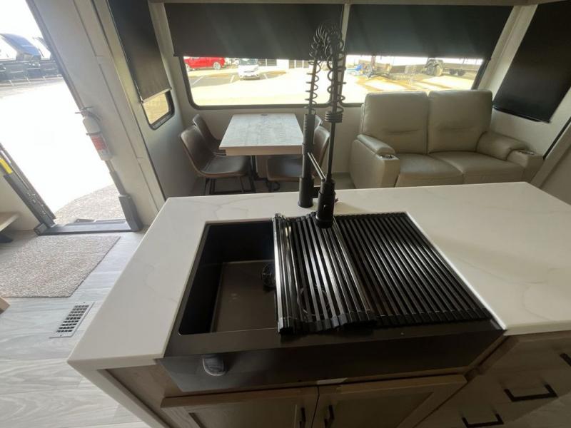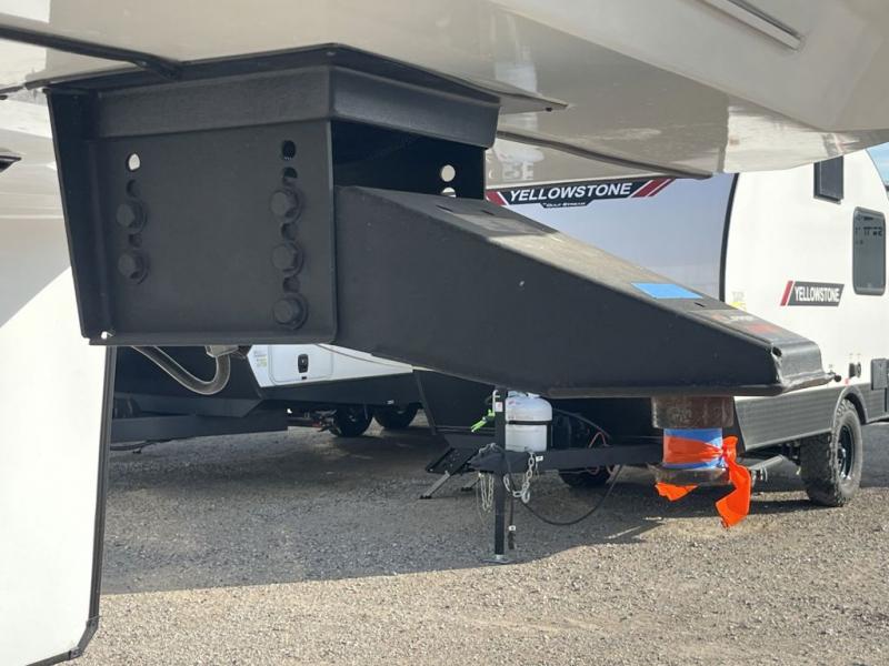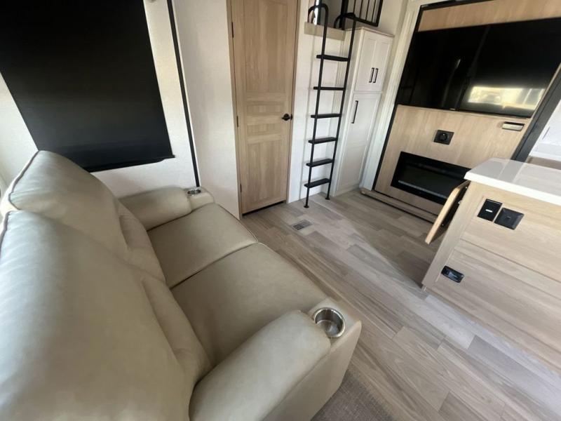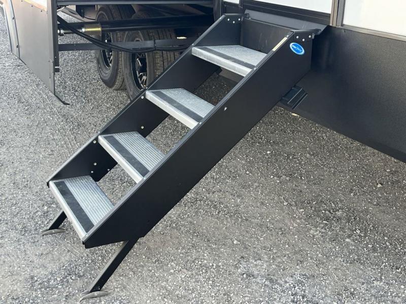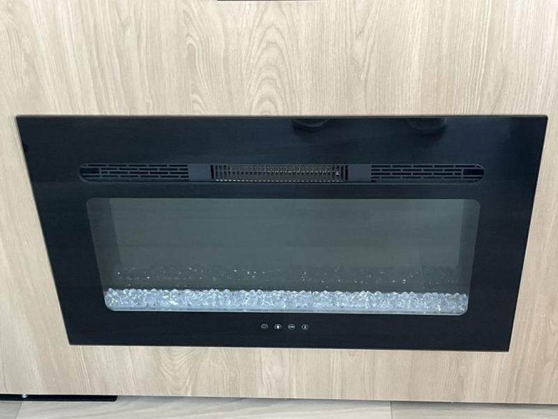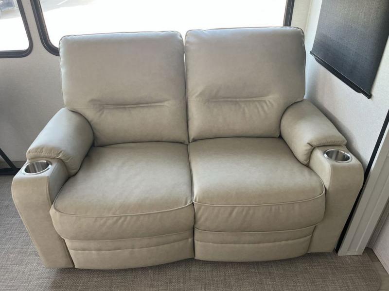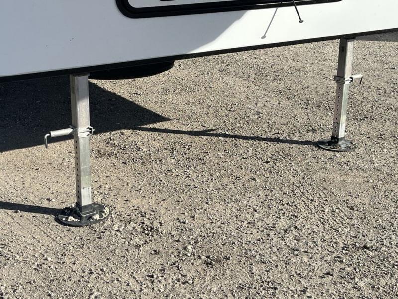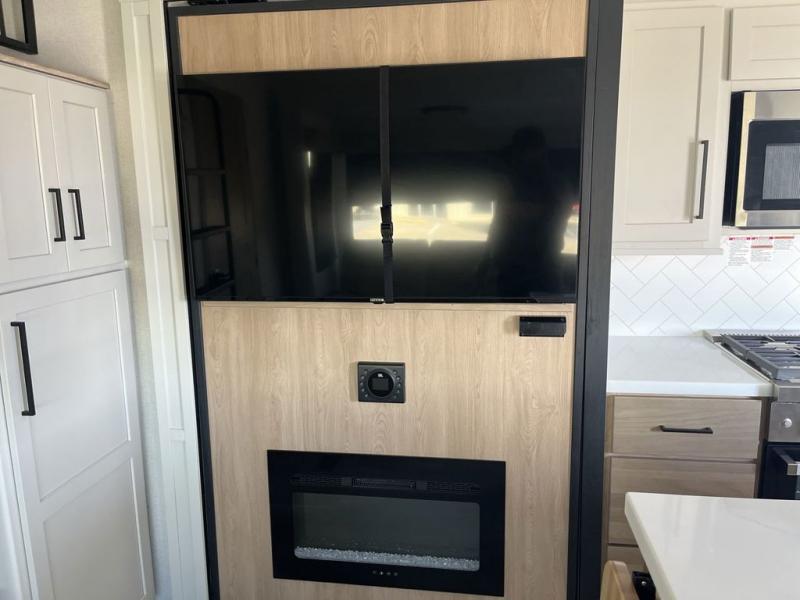 Weekend camping trips and full-time RV living is made complete in this quad slide out fifth wheel. Your crew can relax under the two power awnings, or head inside to enjoy the fireplace. There is also a 50" flat screen TV across from the theater seating, plus a free-standing dinette to dine at. There are two full baths with the front bath including a walk-in shower with a seat for your comfort, and the front private bedroom will feel just like home with its queen bed and large front wardrobe. There is even washer and dryer prep to make laundry day easier than ever. The master bedroom in back includes a second queen bed slide out, and the rear full bath has another convenience with it's exterior entry door, and