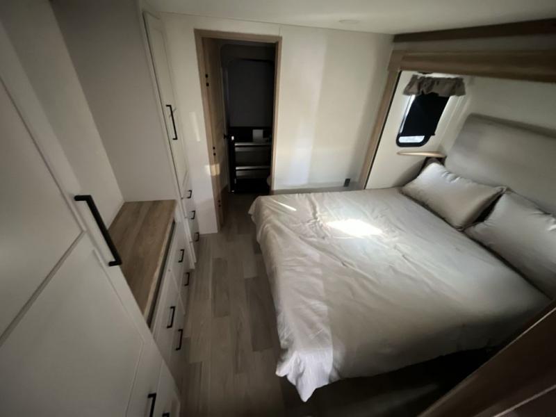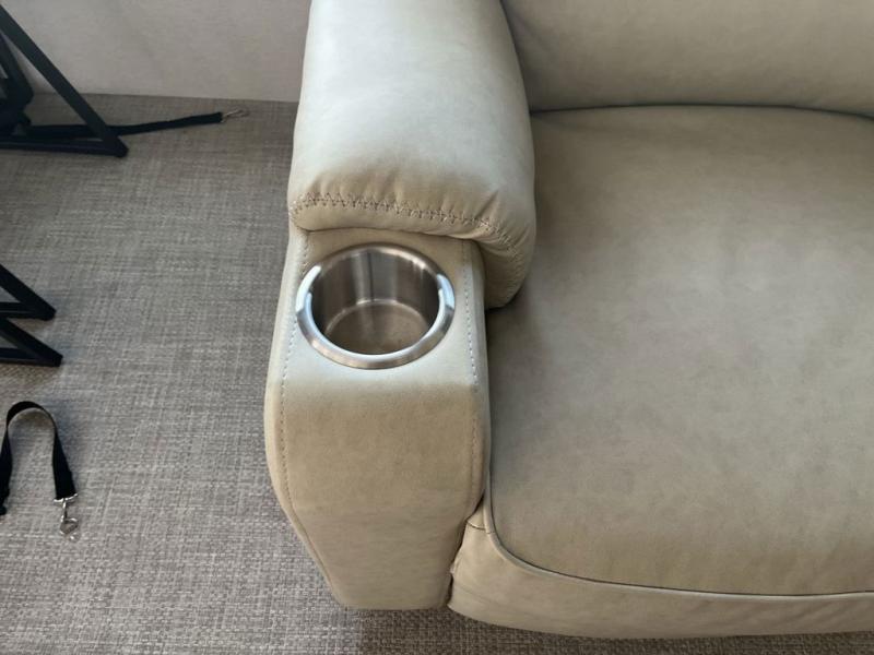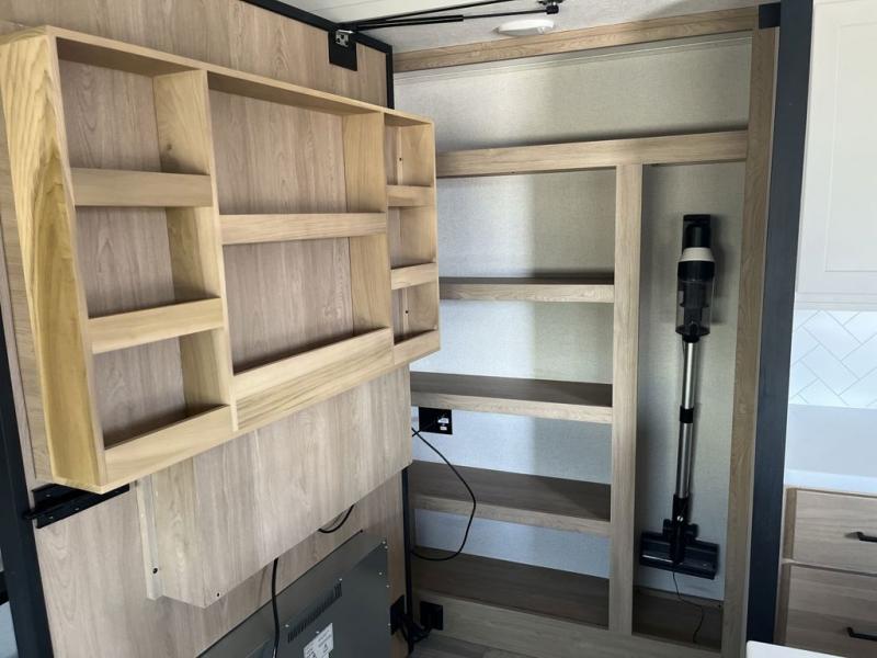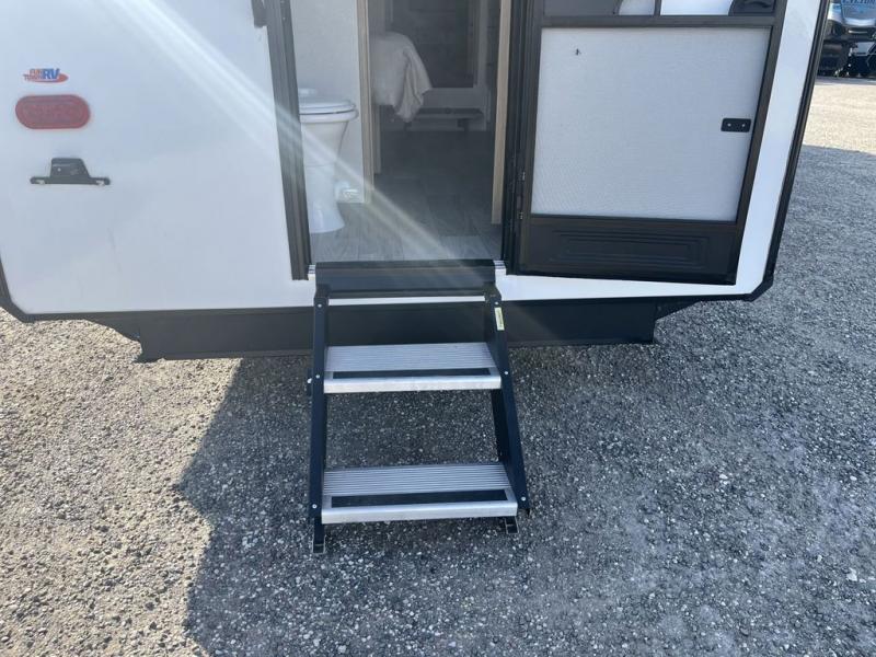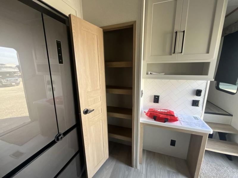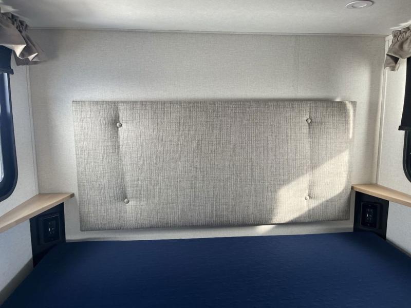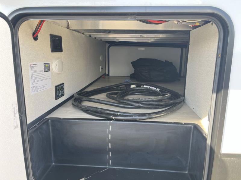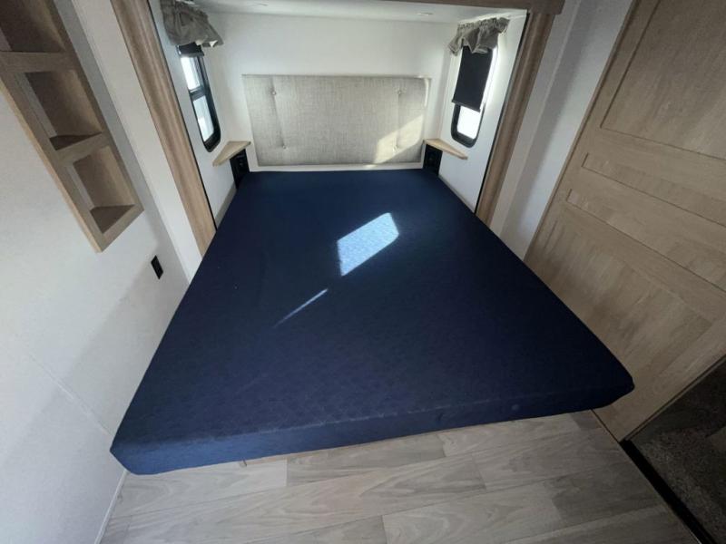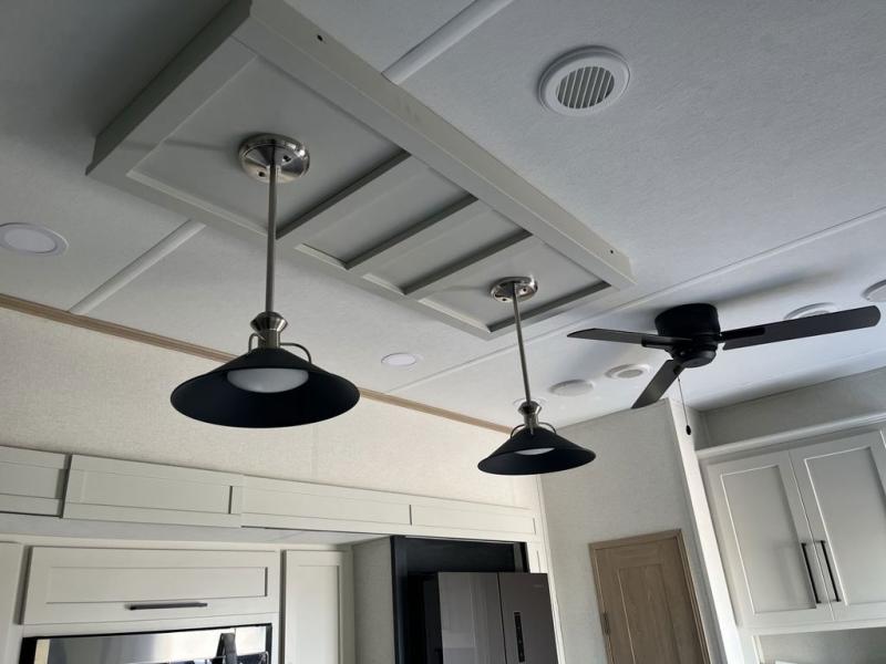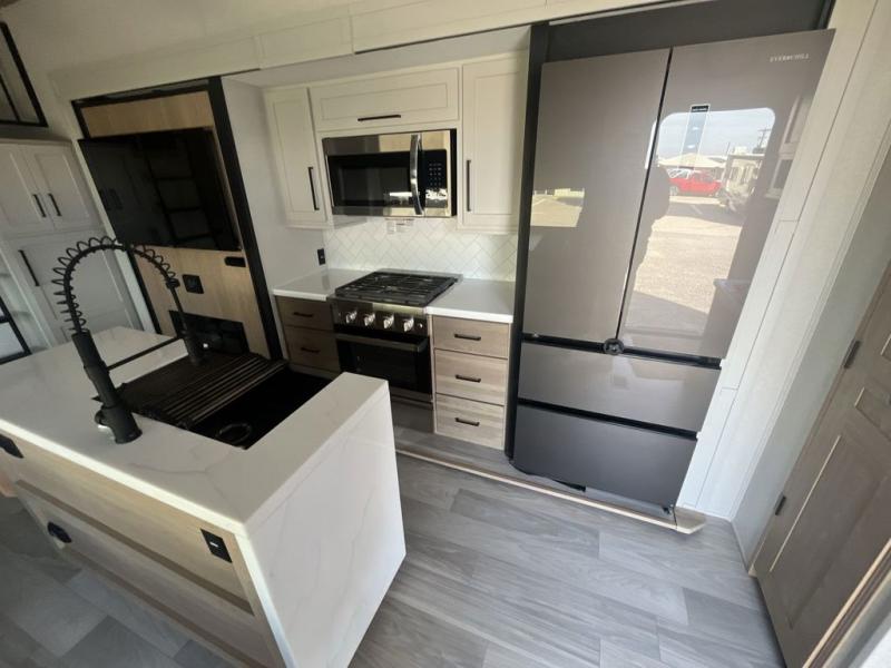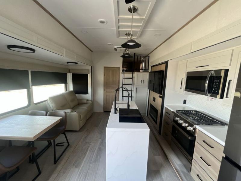 Weekend camping trips and full-time RV living is made complete in this quad slide out fifth wheel. Your crew can relax under the two power awnings, or head inside to enjoy the fireplace. There is also a 50" flat screen TV across from the theater seating, plus a free-standing dinette to dine at. There are two full baths with the front bath including a walk-in shower with a seat for your comfort, and the front private bedroom will feel just like home with its queen bed and large front wardrobe. There is even washer and dryer prep to make laundry day easier than ever. The master bedroom in back includes a second queen bed slide out, and the rear full bath has another convenience with it's exterior entry door, and