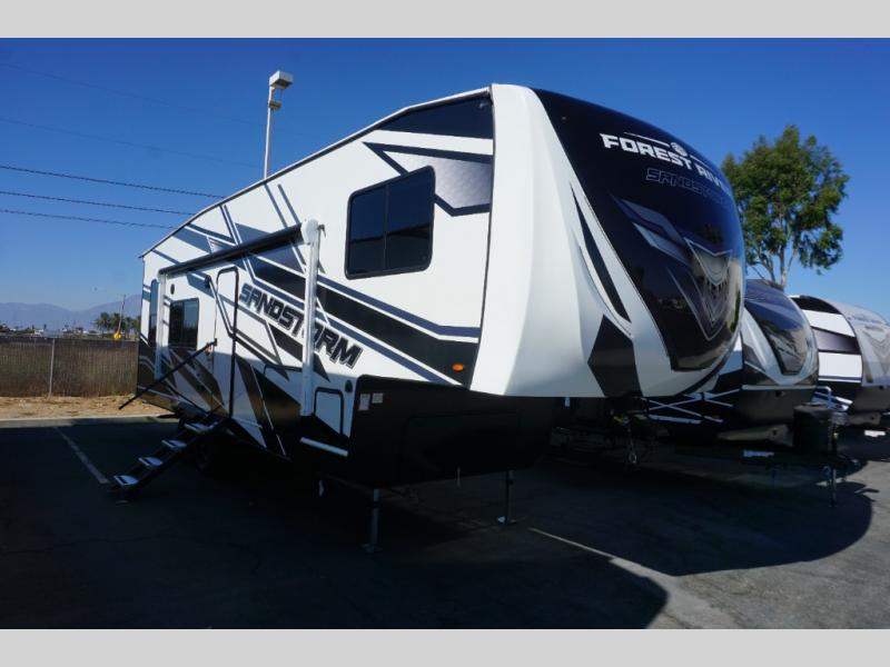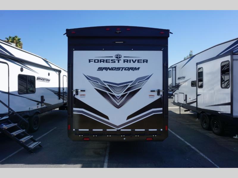 The Sandstorm toy haulers by Forest River let you take your adventures up a notch! There are four different build levels to choose from to best fit your needs, budget, and style. Each travel trailer and fifth wheel include flipped axles with no interior drive on wheel wells, Solid Step entry steps, and tie-downs mounted to steel throughout to keep toys secure on the way to the campground. The power tongue jack will make it easier than ever to hitch up and go, and the Lippert ladder prep means you can add this option to easily access the roof. A 40 gallon fuel station comes standard to keep your toys ready to go when you are, and the dual 20 lbs. propane tanks will let you hook up the grill to make dinner for your whole crew. Some of the other convenient features include a matching spare tire if an unfortunate flat happens, a 335W solar panel, and a 1.5 cu. ft. convection microwave. And don't forget about the available options that will allow you to customize your toy hauler exactly how you want it!