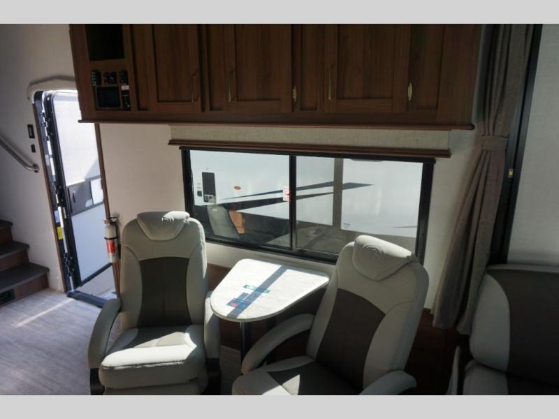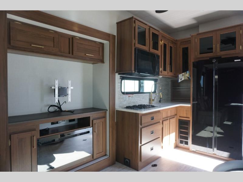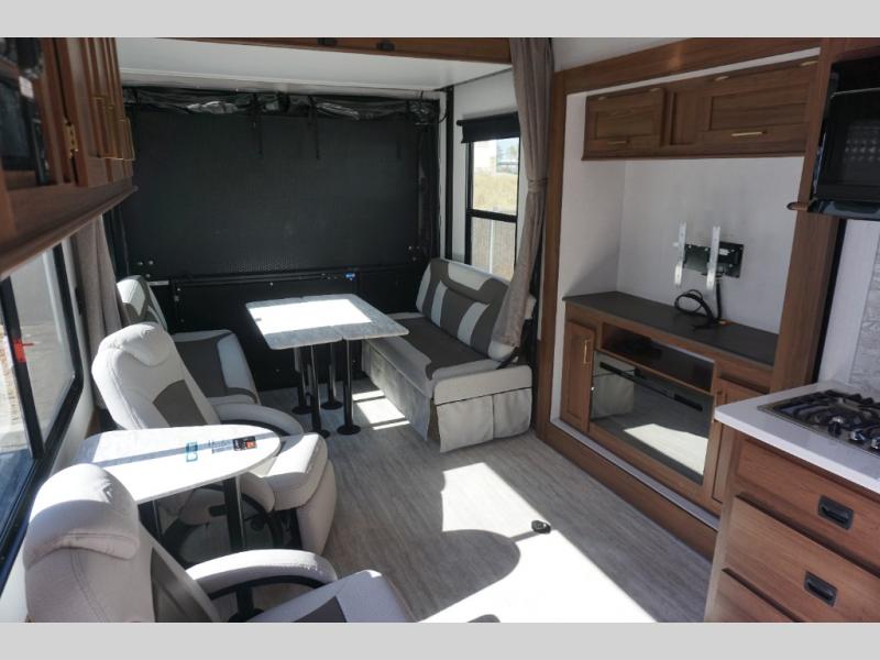 This toy hauler features 15' 7" of total garage space so you can easily fit your toys in! Once they're unloaded, you can relax on the electric pass-thru dinette or dual lounge chairs. There is also an entertainment center slide here and a ceiling fan for a nice breeze. You'll find a three burner cooktop in the kitchen, a 15.6 cu. ft. 12V refrigerator to keep perishables fresh, and plenty of counter space to prep meals. The full bath will let you clean up after trail riding, and the front private bedroom with a king bed is sure to bring a great night's rest. There is also a dresser slide out in the bedroom for added storage and space!
