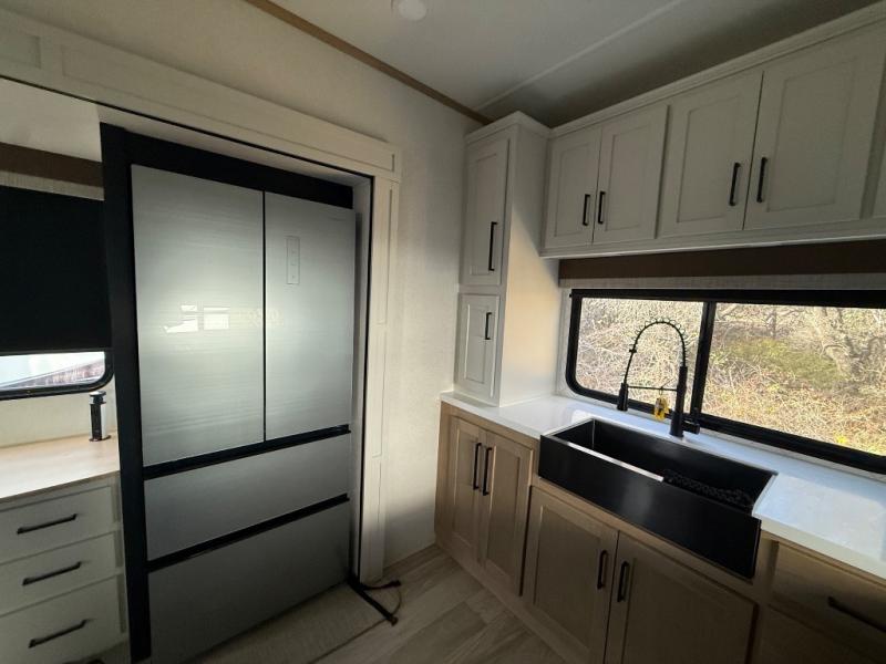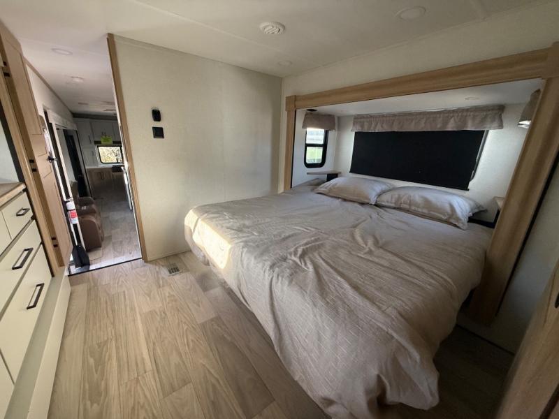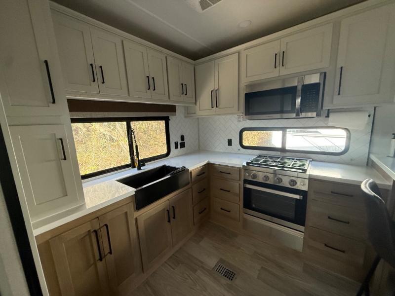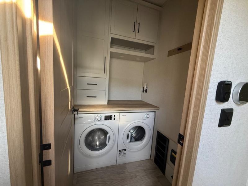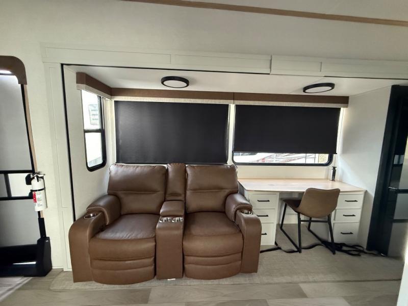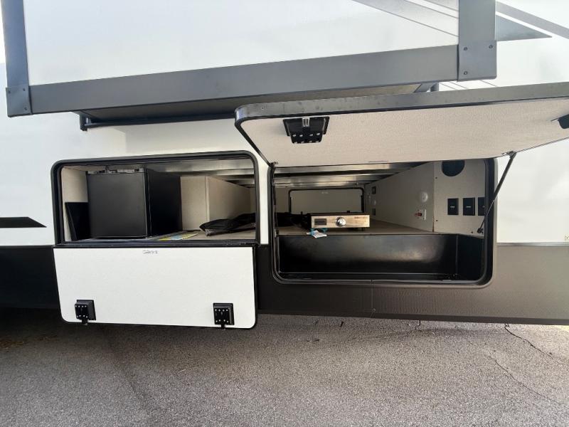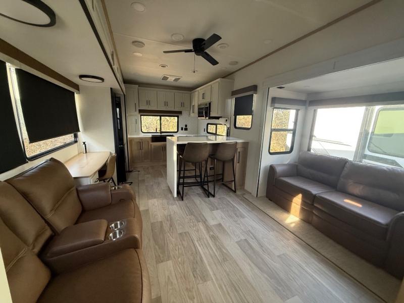 If you're looking to go full-time RVing, this fifth wheel is packed with convenient features! The master bedroom includes a king bed slide out with USB ports on either side of the bed so you both can charge your phones, and there is a dresser for your folded clothes. You will love the front bathroom with dual bath sinks, a shower with a seat, plus a walk-in closet with shelves, rods to hand clothes, and baskets for laundry! There is a unique middle utility room with washer and dryer, Washer and dryer counter and a rod to hang clothes that will make a perfect laundry room, or you can utilize this space for storage! Head to the main living area to relax on the theater seating or hide-a-bed sofa, and if you have guests stay over, they can sleep here. There is also an entertainment center with a 50" flat screen TV, but you might just leave that off if you're working at the desk with a chair that is provided. We've saved the best part for last; the kitchen! Here, you'll find ample counter space to prep home-cooked meals, a three burner high output range with a 22" oven, plus a large counter with barstools where you can enjoy breakfast at each morning. Choosing this fifth wheel is a no-brainer!