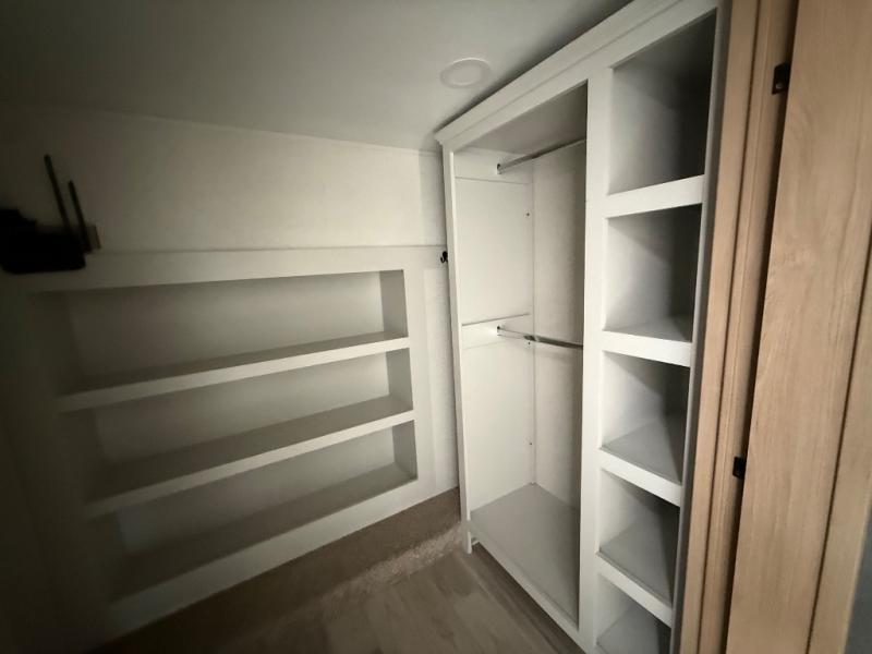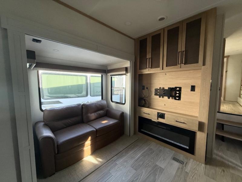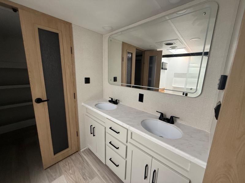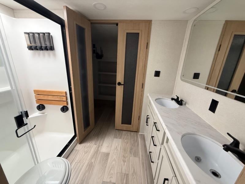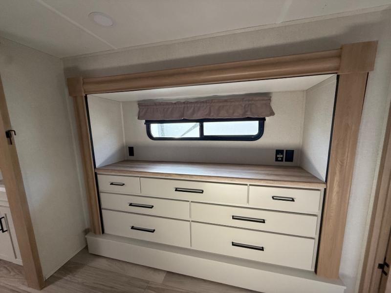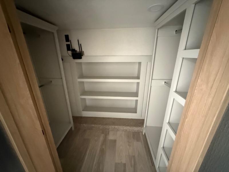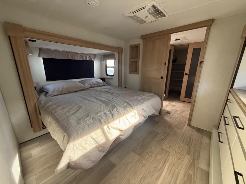 If you're looking to go full-time RVing, this fifth wheel is packed with convenient features! The master bedroom includes a king bed slide out with USB ports on either side of the bed so you both can charge your phones, and there is a dresser for your folded clothes. You will love the front bathroom with dual bath sinks, a shower with a seat, plus a walk-in closet with shelves, rods to hand clothes, and baskets for laundry! There is a unique middle utility room with washer and dryer, Washer and dryer counter and a rod to hang clothes that will make a perfect laundry room, or you can utilize this space for storage! Head to the main living area to relax on the theater seating or hide-a-bed sofa, and if you have guests stay over, they can sleep here. There is also an entertainment center with a 50" flat screen TV, but you might just leave that off if you're working at the desk with a chair that is provided. We've saved the best part for last; the kitchen! Here, you'll find ample counter space to prep home-cooked meals, a three burner high output range with a 22" oven, plus a large counter with barstools where you can enjoy breakfast at each morning. Choosing this fifth wheel is a no-brainer!