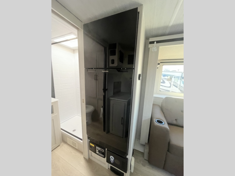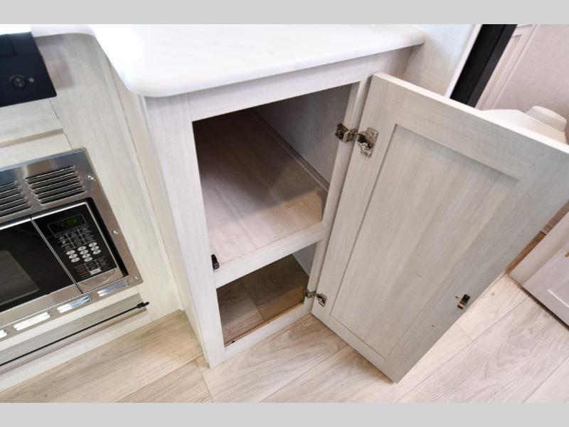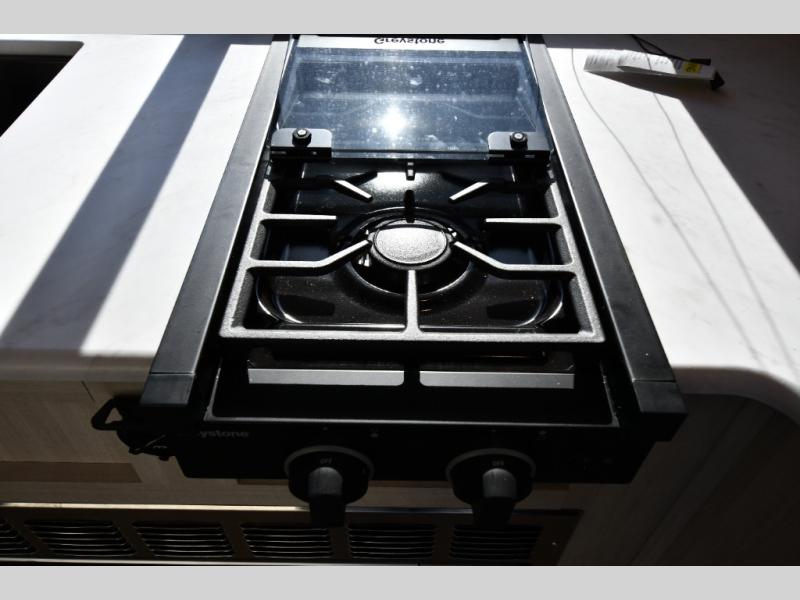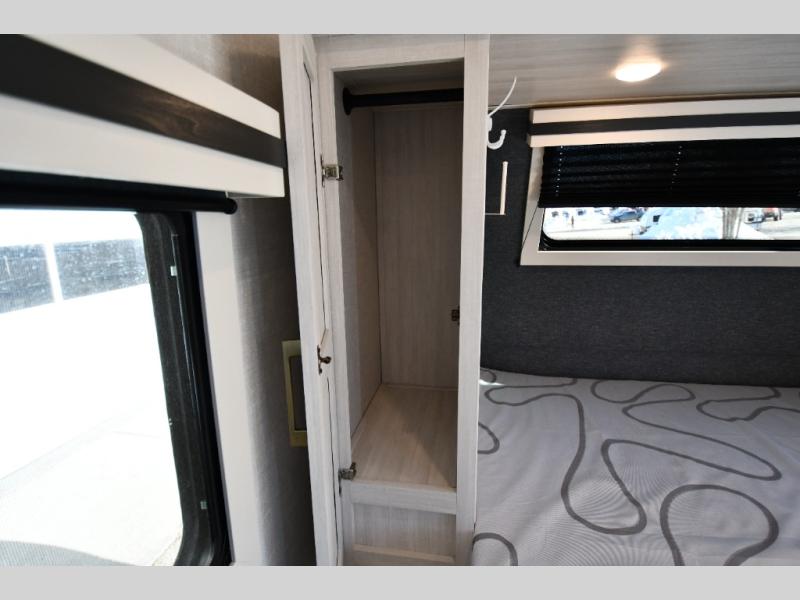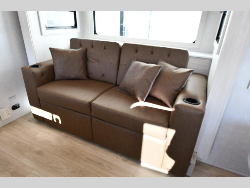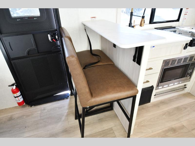 Hit the road with this Surveyor Legend trailer in tow, featuring a tri-fold sofa slide for added seating, sleeping, and interior space. You will also love the breakfast bar with two stools for dining. The queen bed up front will provide a great night's rest, and there is overhead storage at the head of the bed along with dual wardrobes for your things on either side. If you have an overnight guest or two little ones, they can sleep on the tri-fold sofa slide, and everyone will appreciate the privacy of the full rear bath. You will have everything needed each day to prepare meals, including a two burner cooktop, a convection microwave, and refrigerator for your perishables. The pass-through storage will be be perfect for fishing poles, outdoor chairs, yard games, plus there is additional outdoor storage along the rear curbside for your hiking gear!