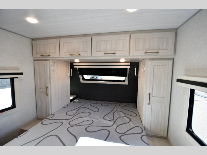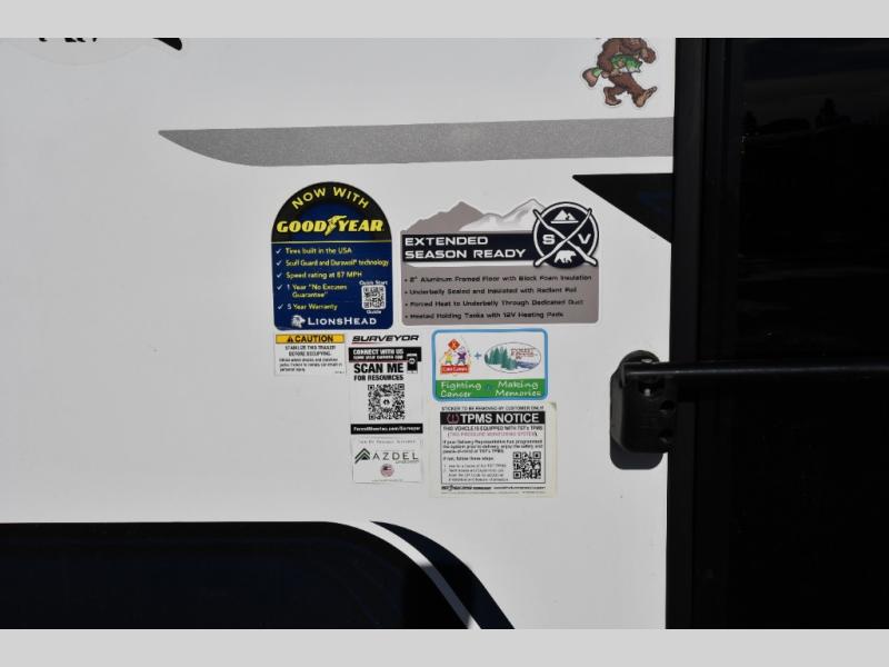 With any Surveyor Legend travel trailer by Forest River you will enjoy quality craftsmanship, convenient amenities, and at-home comforts. The Azdel composite walls provide a longer-lasting trailer, and the power tongue jack with a hitch light will get you back on the road in no-time. There are also Goodyear tires and a tire pressure monitoring system for hassle-free towing. Each model includes the Surveyor Legend Package that comes standard with oversized dinette storage access doors, front slam latch baggage doors, plus an automotive style tinted front windshield. You'll appreciate camping with a tankless water heater for endless hot showers, a 2" accessory hitch to bring bikes along, plus carpet-free interiors and a central vacuum system for easy clean up.