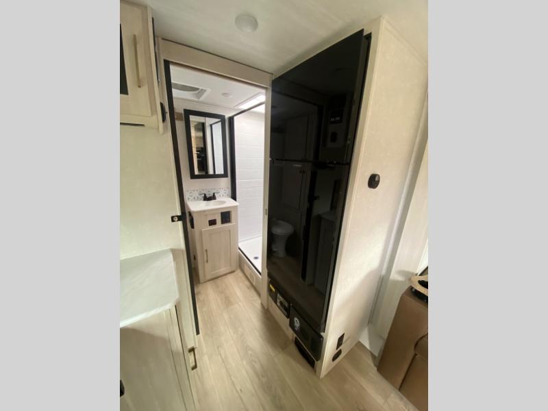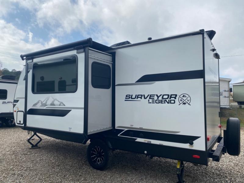 Hit the road with this Surveyor Legend trailer in tow, featuring a tri-fold sofa slide for added seating, sleeping, and interior space. You will also love the breakfast bar with two stools for dining. The queen bed up front will provide a great night's rest, and there is overhead storage at the head of the bed along with dual wardrobes for your things on either side. If you have an overnight guest or two little ones, they can sleep on the tri-fold sofa slide, and everyone will appreciate the privacy of the full rear bath. You will have everything needed each day to prepare meals, including a two burner cooktop, a convection microwave, and refrigerator for your perishables. The pass-through storage will be be perfect for fishing poles, outdoor chairs, yard games, plus there is additional outdoor storage along the rear curbside for your hiking gear!