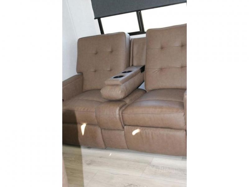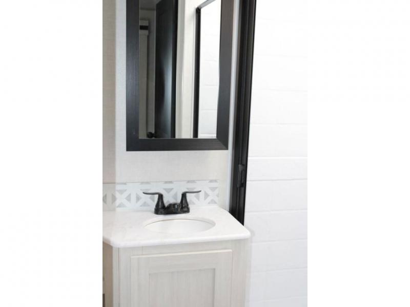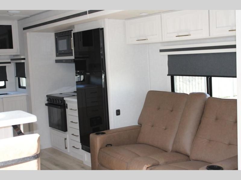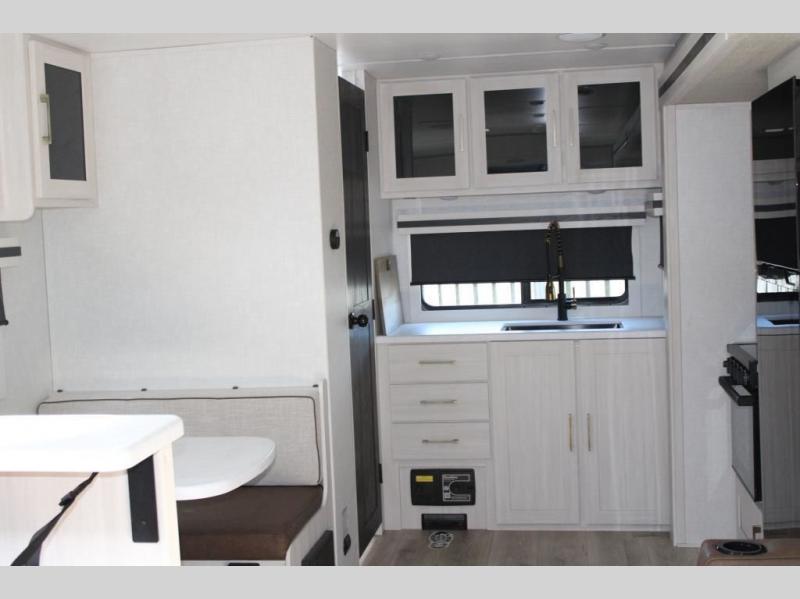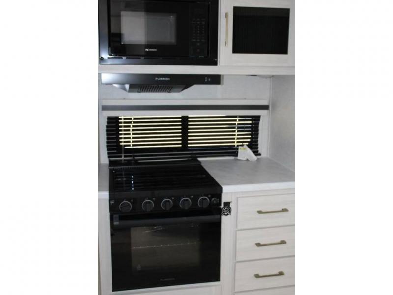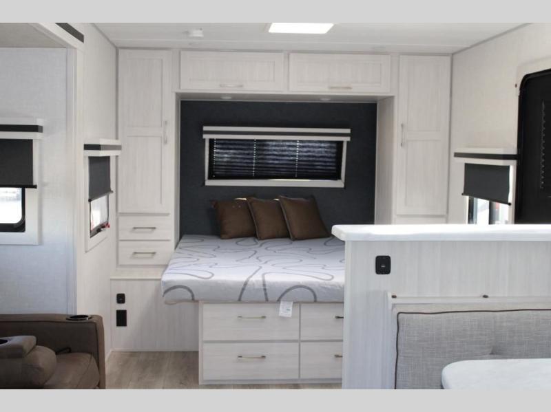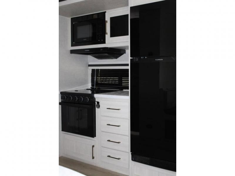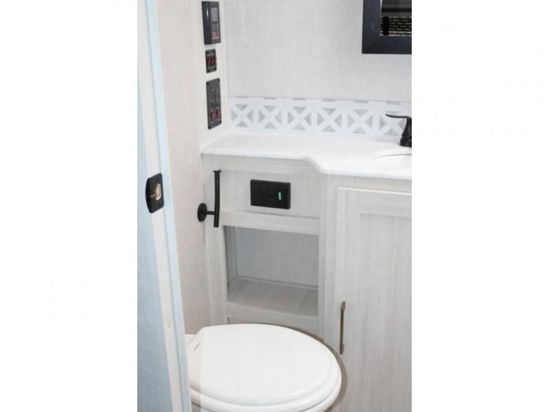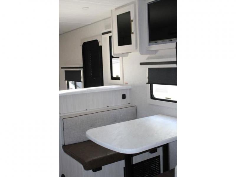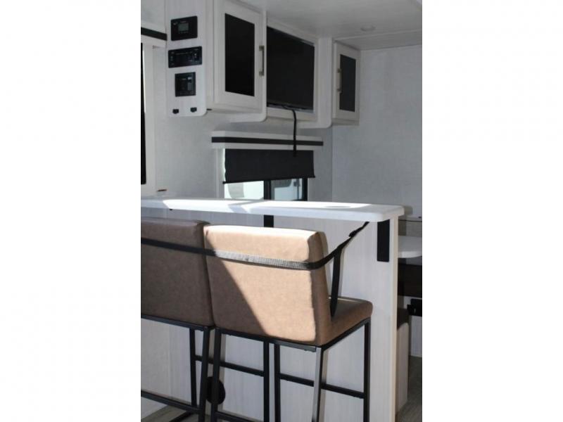 You'll love camping and spending time with loved ones in this spacious travel trailer. The 18' power awning with LED lights can be set up once you arrive at the campground, and you can unload camp gear from the pass-through storage. Head inside to make lunch on the residential range top or in the microwave oven. There is a booth dinette and tri-fold sofa for seating space, plus an additional counter with bar stools beside the dinette. A full bath onboard lets you clean up each day, and the front queen bed is sure to bring a great night's rest. There are also dual wardrobes to keep your space tidy and overhead storage for even more belongings.