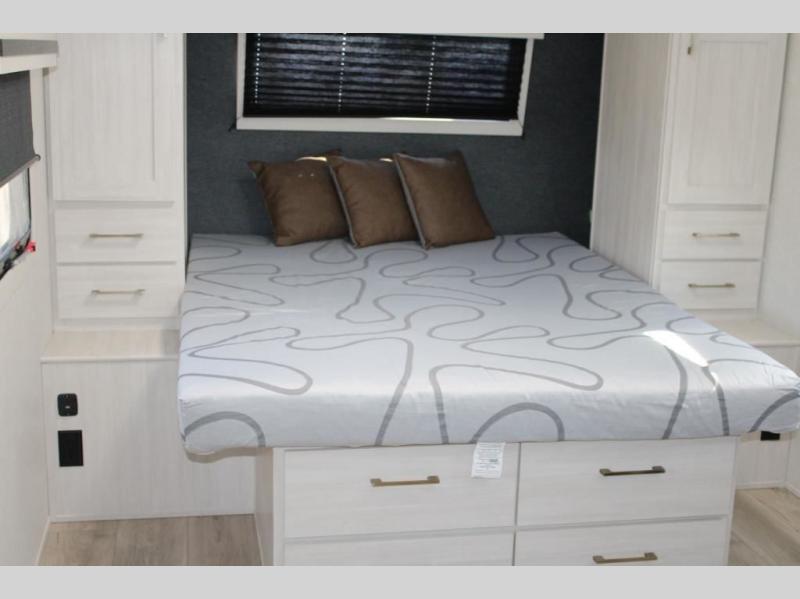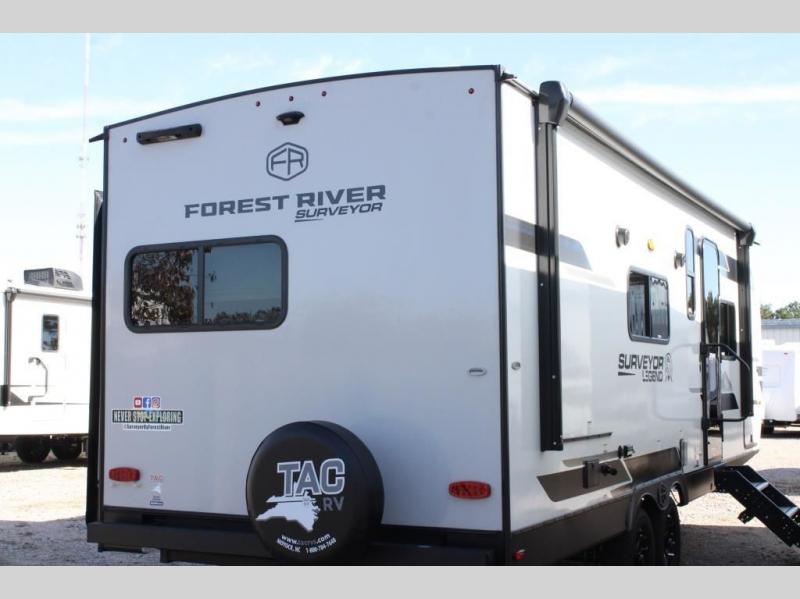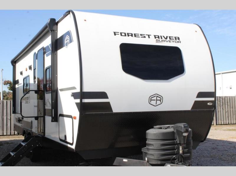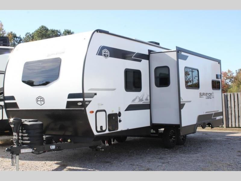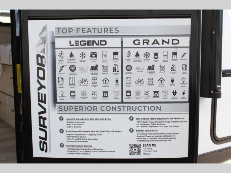With any Surveyor Legend travel trailer by Forest River you will enjoy quality craftsmanship, convenient amenities, and at-home comforts. The Azdel composite walls provide a longer-lasting trailer, and the power tongue jack with a hitch light will get you back on the road in no-time. There are also Goodyear tires and a tire pressure monitoring system for hassle-free towing. Each model includes the Surveyor Legend Package that comes standard with oversized dinette storage access doors, front slam latch baggage doors, plus an automotive style tinted front windshield. You'll appreciate camping with a tankless water heater for endless hot showers, a 2" accessory hitch to bring bikes along, plus carpet-free interiors and a central vacuum system for easy clean up.