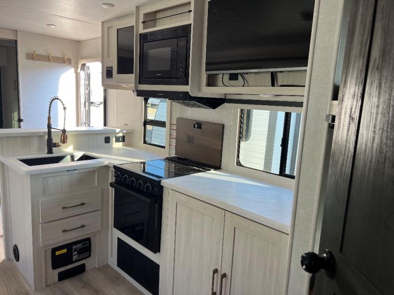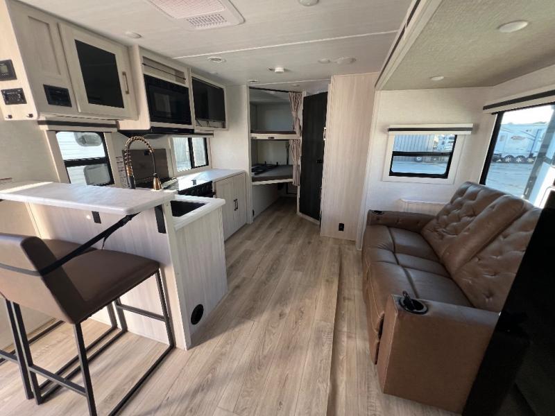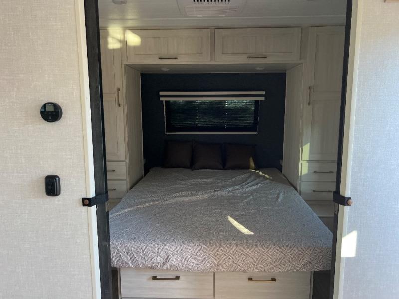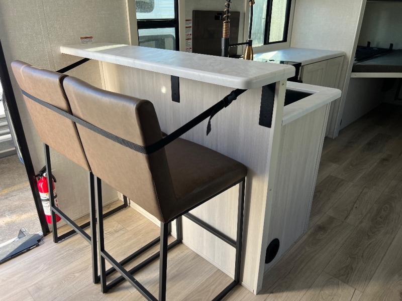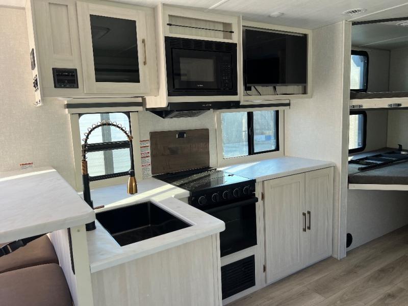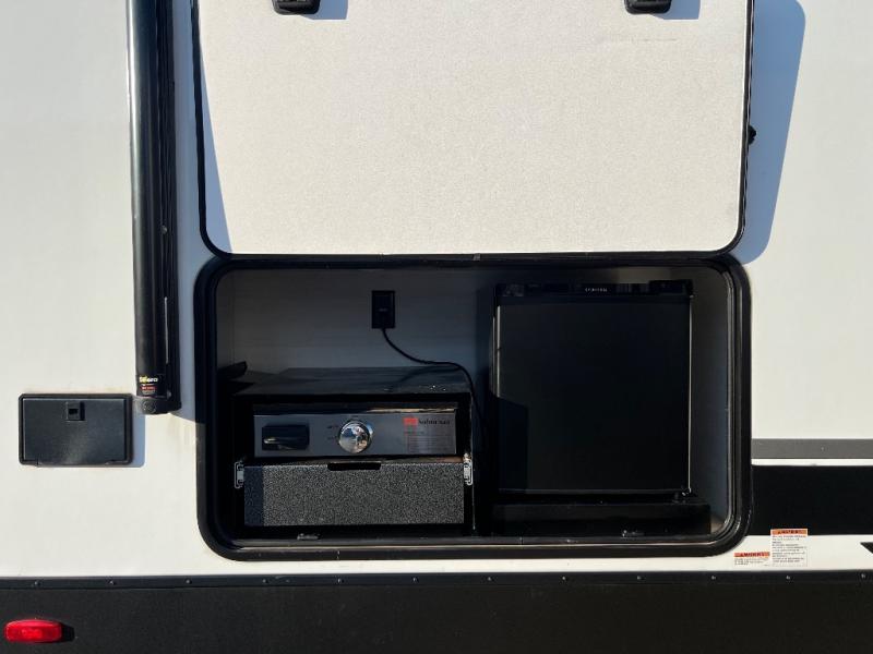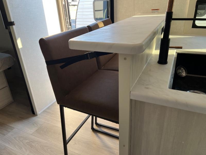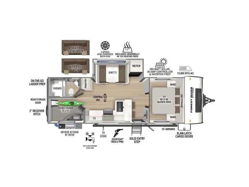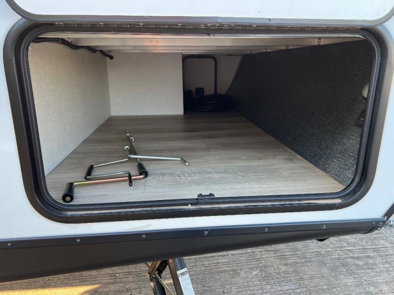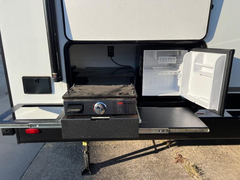 Every trip to the campground will be spent in comfort with this single slide out travel trailer. Once you arrive at the site, remove the kayaks or bikes from the rear storage door, start lunch on the outside kitchen, and put out the 15' power awning with LED lights. The interior includes a booth dinette slide with storage, a bar top with stools, plus an HD TV for movie nights. After a day of fun, head to the front private bedroom for a great night's rest on the queen bed, and you can store your belongings in the dual bedroom wardrobes!