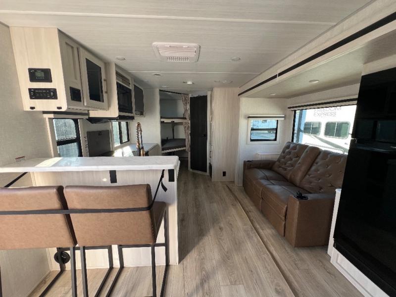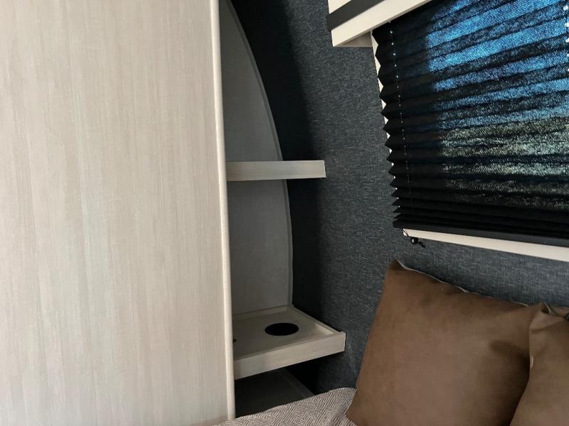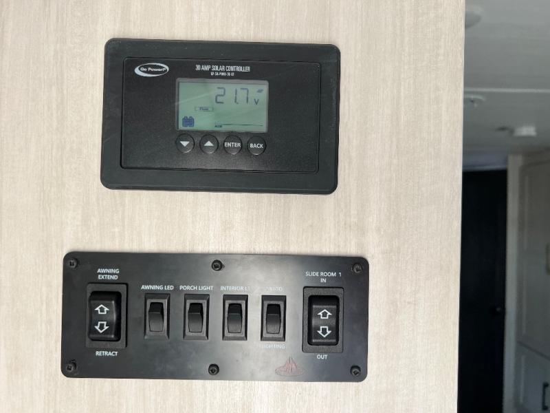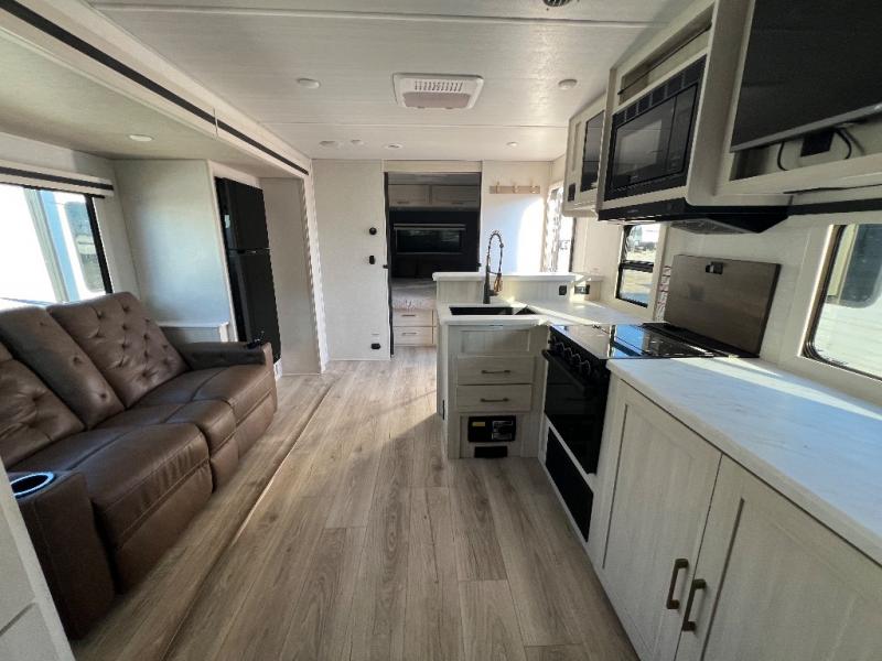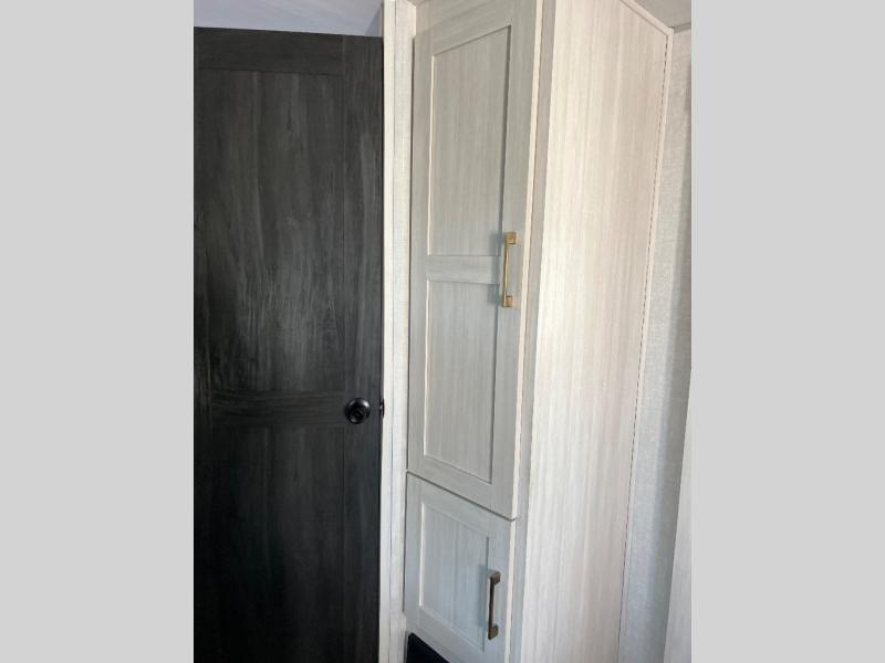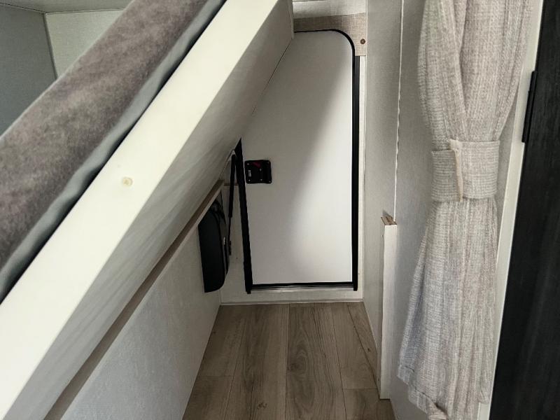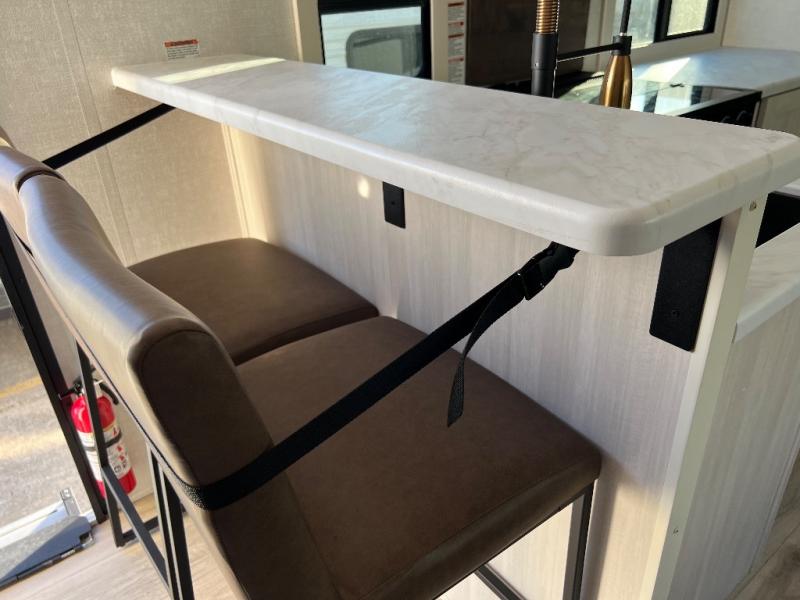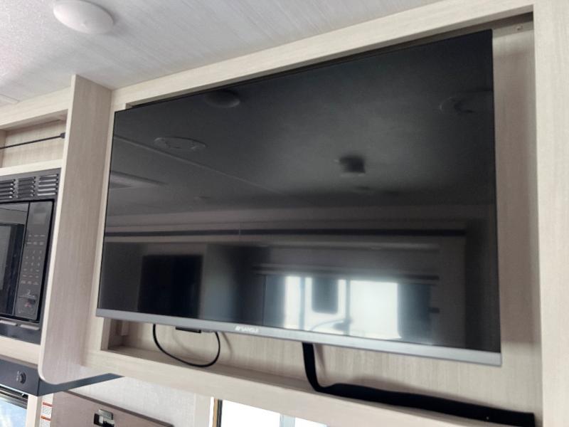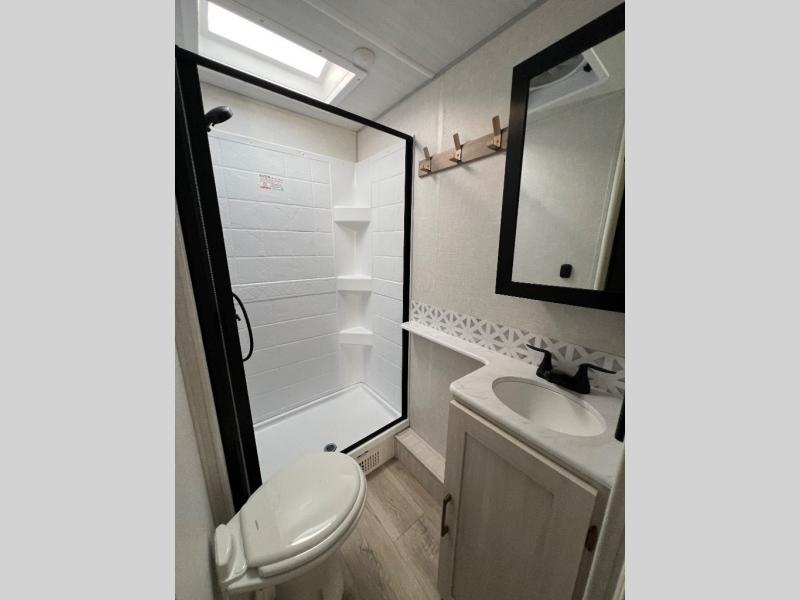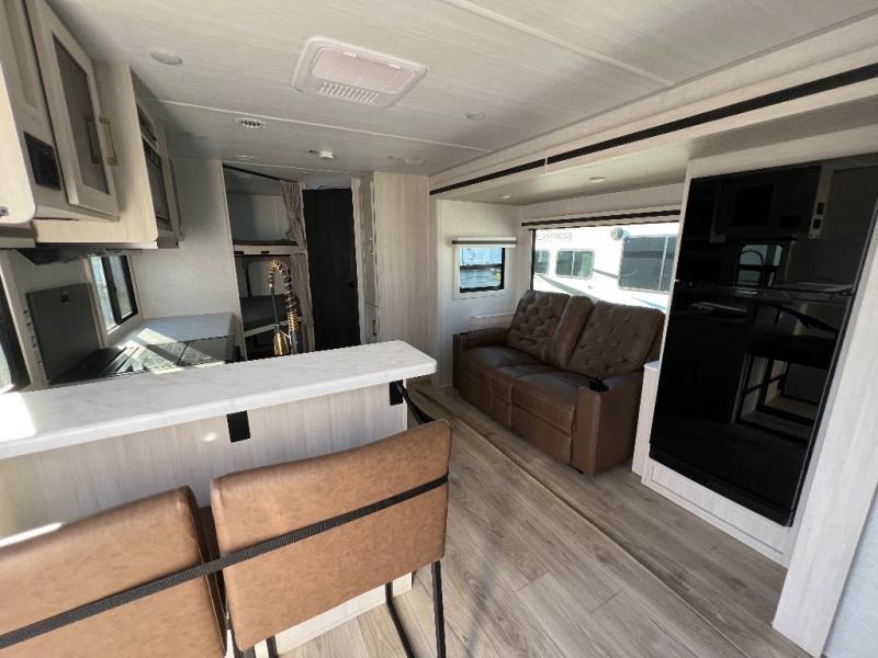 Every trip to the campground will be spent in comfort with this single slide out travel trailer. Once you arrive at the site, remove the kayaks or bikes from the rear storage door, start lunch on the outside kitchen, and put out the 15' power awning with LED lights. The interior includes a booth dinette slide with storage, a bar top with stools, plus an HD TV for movie nights. After a day of fun, head to the front private bedroom for a great night's rest on the queen bed, and you can store your belongings in the dual bedroom wardrobes!