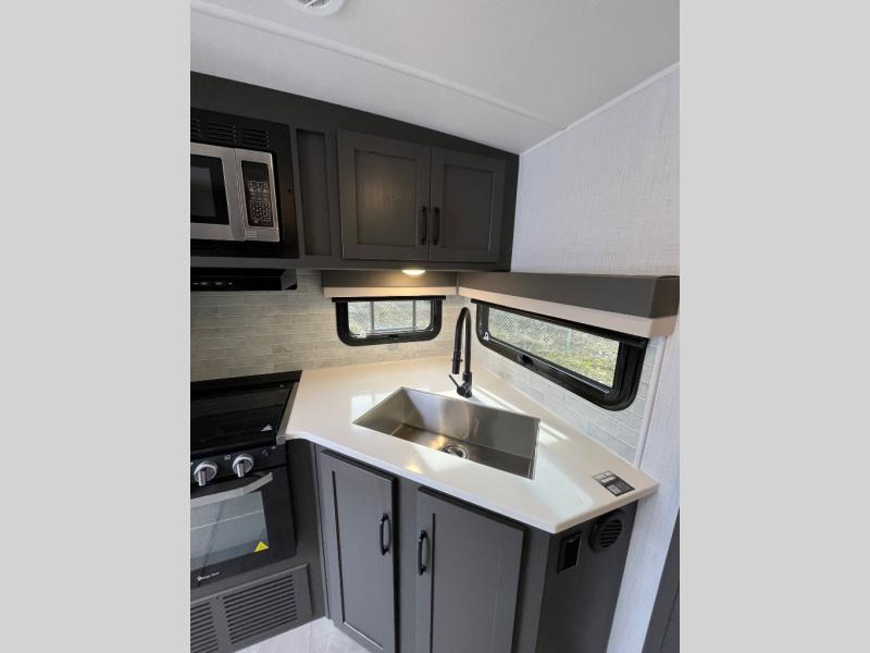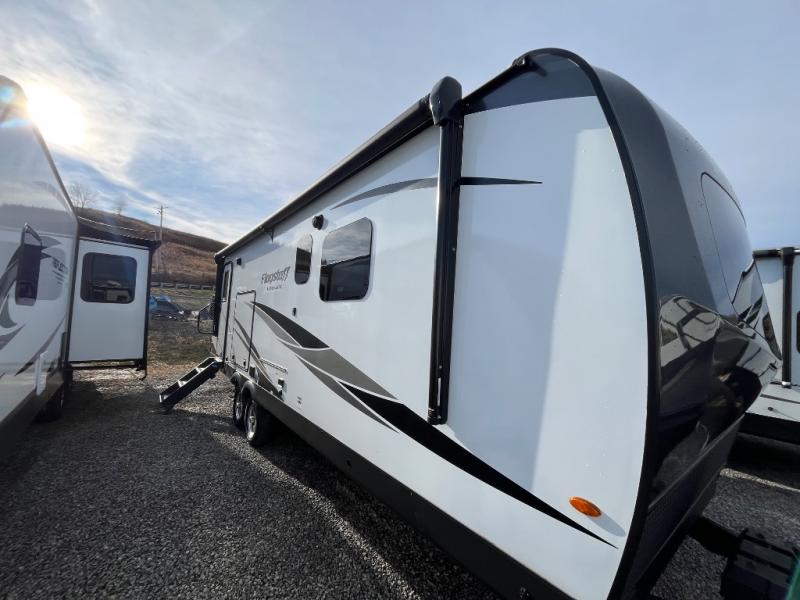 With any Flagstaff Super Lite travel trailer by Forest River the towing features include the TST tire pressure monitor system with a monitor providing safety on the road, Easy Lube axles and Nev-R adjust brakes, a power tongue jack for easy setup, and rear observation camera prep. Each is built with 6 sided aluminum framed side walls, end wall, front, floor and a roof, a plywood tongue and groove subfloor, electronically controlled heated holding tanks and an enclosed underbelly allowing you to travel during any season. The interior includes designer kitchen backsplash, solid surface kitchen countertops, Sedonwood cabinetry, and solid wood cabinet doors and drawers to make you feel right at home.