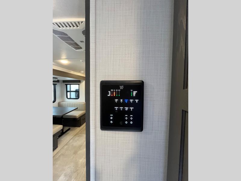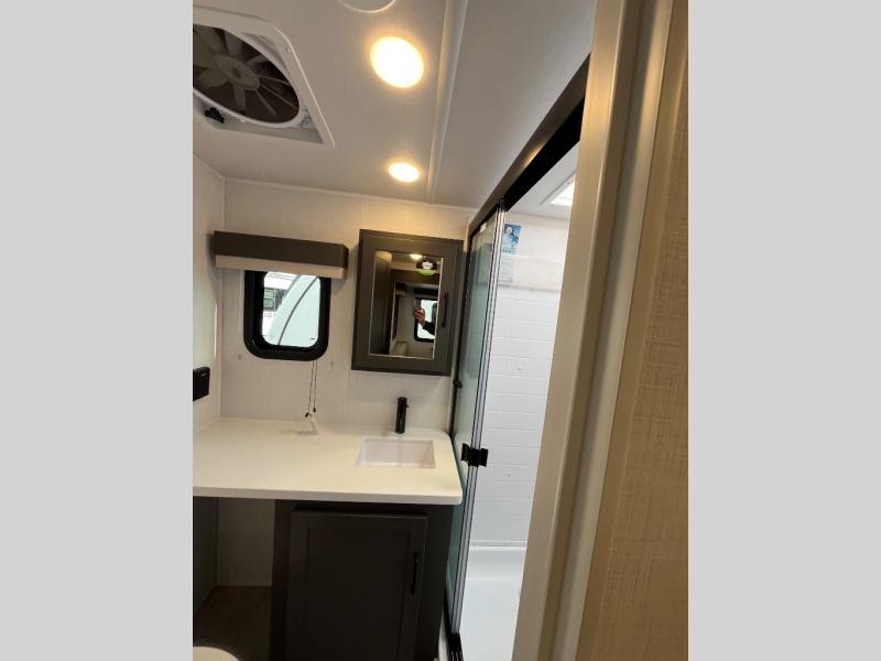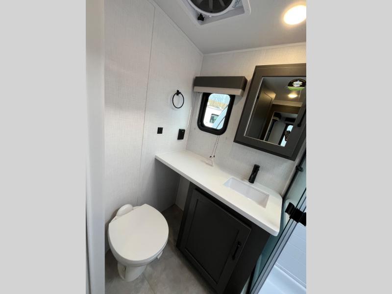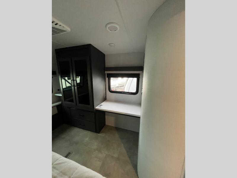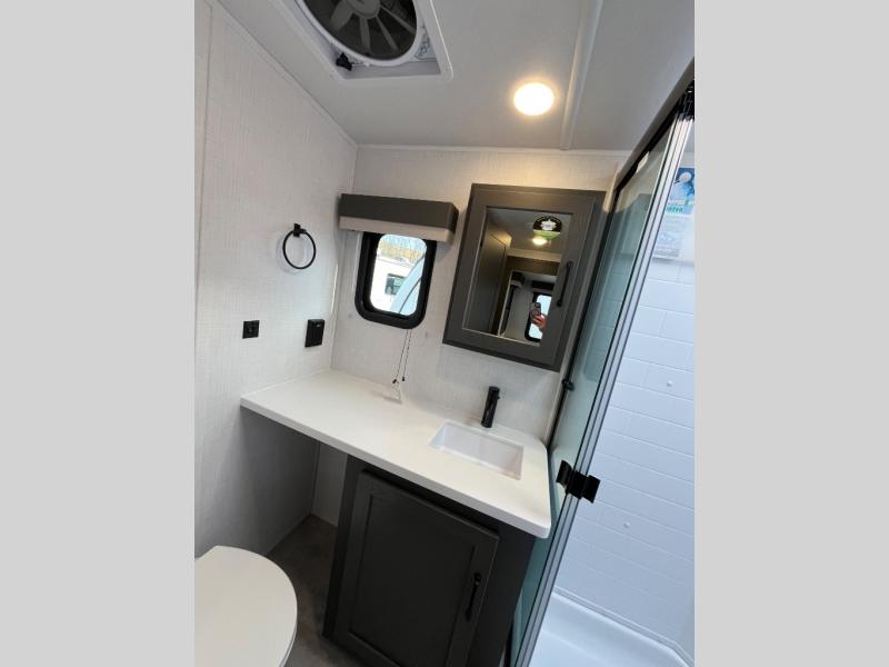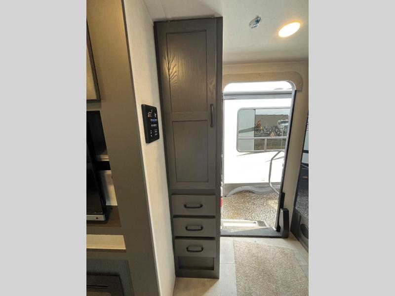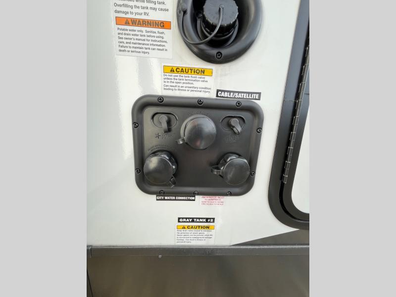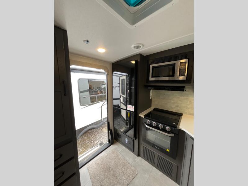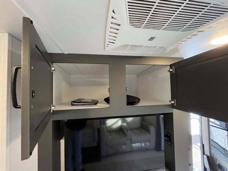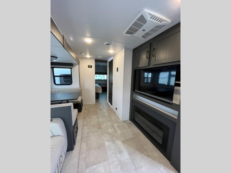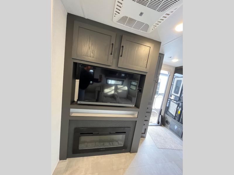 Whether you camp at state parks, national forests or on your friend's land, this trailer offers you plenty of floor space thanks to the two slide outs! As you enter the main entrance near the rear kitchen you can grab a drink from the 12V refrigerator or a snack from the pantry and relax on the 60" theater seating or sit at the booth dinette. The Smart TV offers entertainment while the fireplace will keep you cozy during the cooler months. Everyone will appreciate having a full bathroom to get cleaned up in, and the front bedroom gives you privacy and a queen bed slide, plus storage and the second exterior entry. If you don't need the second entry door you can choose the optional desk and window in place of the door!