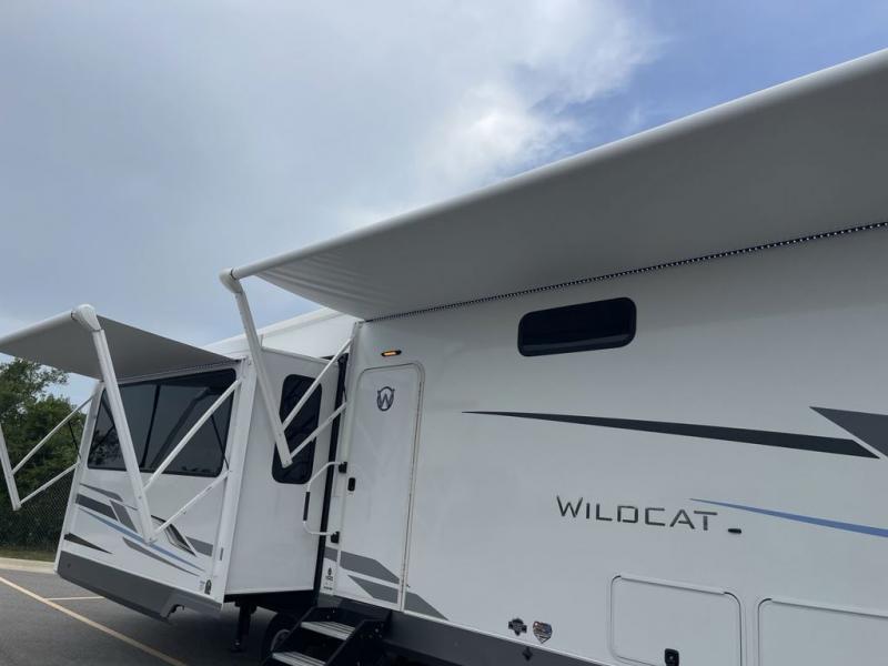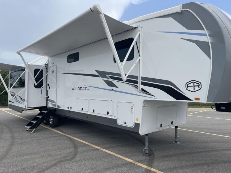 With any Wildcat fifth wheel by Forest River you will enjoy affordable luxury at every turn. These models are constructed with residential fiberglass insulation in the roof and floor, a sectioned ABS plastic underbelly armor, and a vacuum bonded, welded aluminum structure for added strength and durability. You will also find seamless roto-cast holding tanks, an outdoor shower, and 4-point auto leveling for quick and easy setup. Each model includes a best-in-class, high-efficiency 35,000 BTU furnace, along with a 18,000 BTU ducted A/C, with second and third A/C prep, plus an on-demand tankless water heater for added convenience. There are carpet-free living spaces, residential backsplash, motion lighting throughout, and many more comforts!