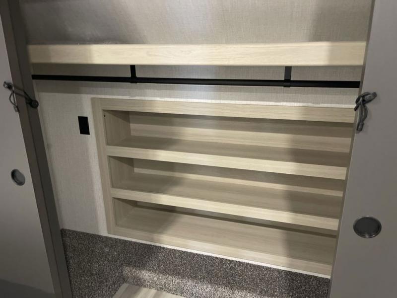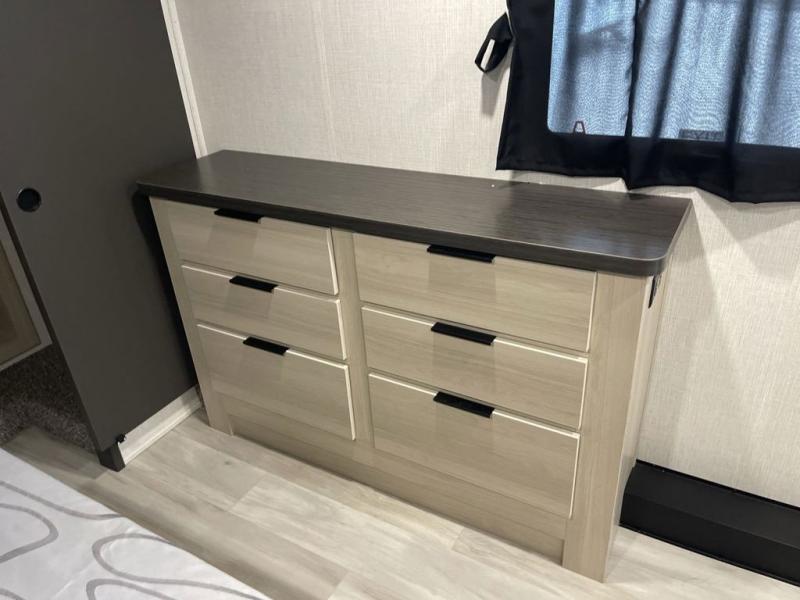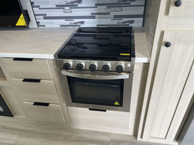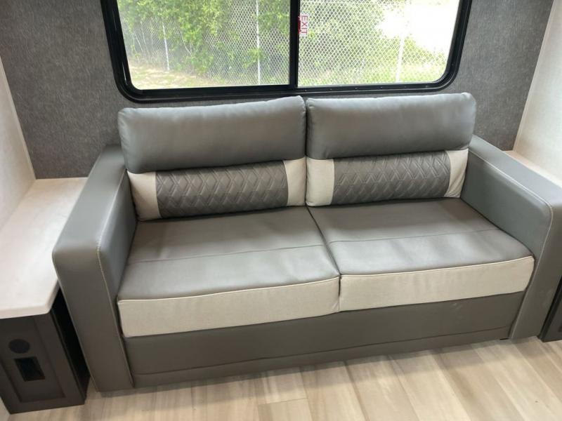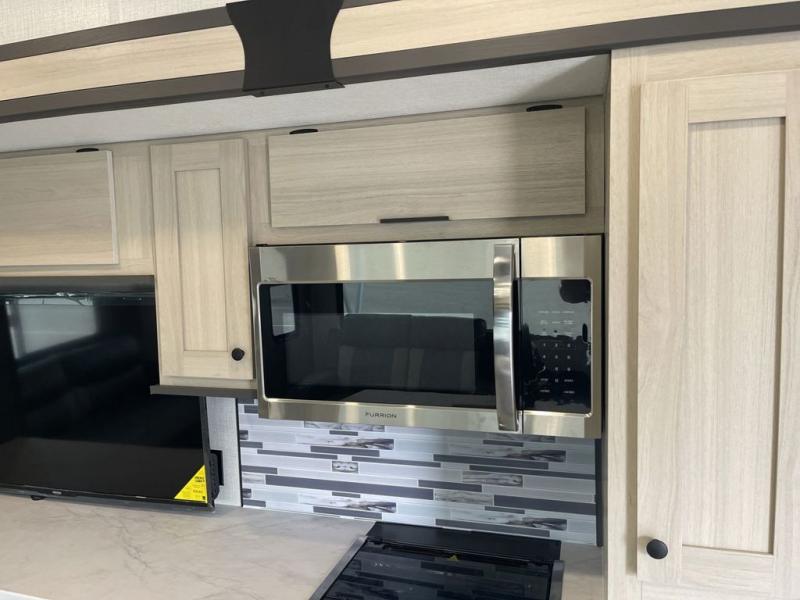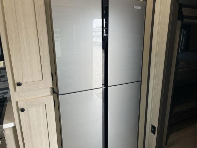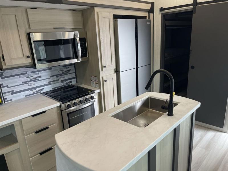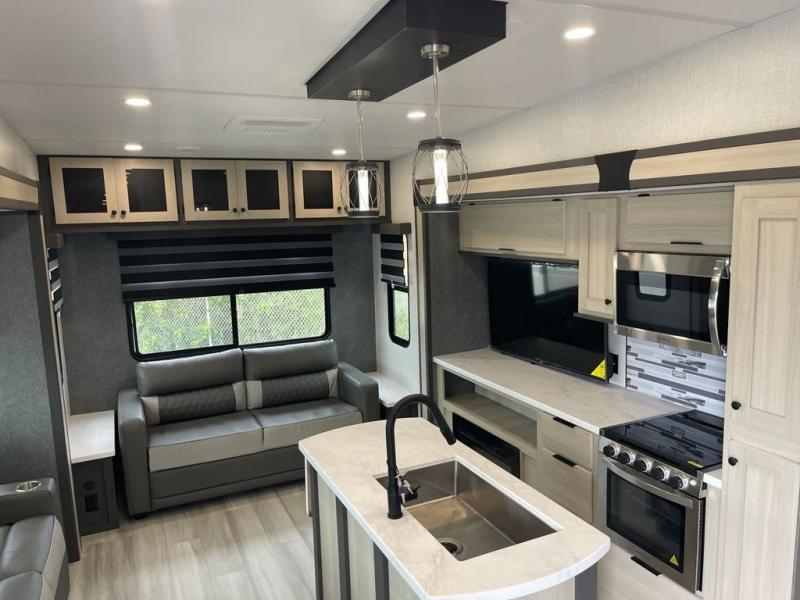 Wow! You won't believe the features found in this luxury fifth wheel that can sleep up to nine each night! Your guests or the kids will absolutely love the middle bunkroom with triple bunks and a loft above for even more sleeping or storage space. There is also a pull-out desk here, which will allow you to utilize this space as an office as well! You'll have your own space in the front private bedroom on the king bed slide out, and there is a walk-in wardrobe to keep your clothes tidy. There is even washer and dryer prep for the option to keep those clothes clean! The chef of your group will have everything they need to prepare meals, including a 21" 2-in-1 oven range, an over-the-range microwave, a 16 cu. ft. 12V refrigerator, plus a kitchen island for more counter space. In the evenings, your crew can get cozy on the rear sofa and theater seats across from the entertainment center and fireplace, or you might just play a game at the hi-top table and chairs!