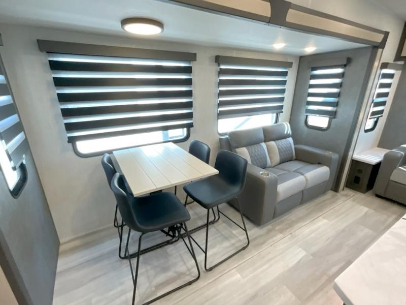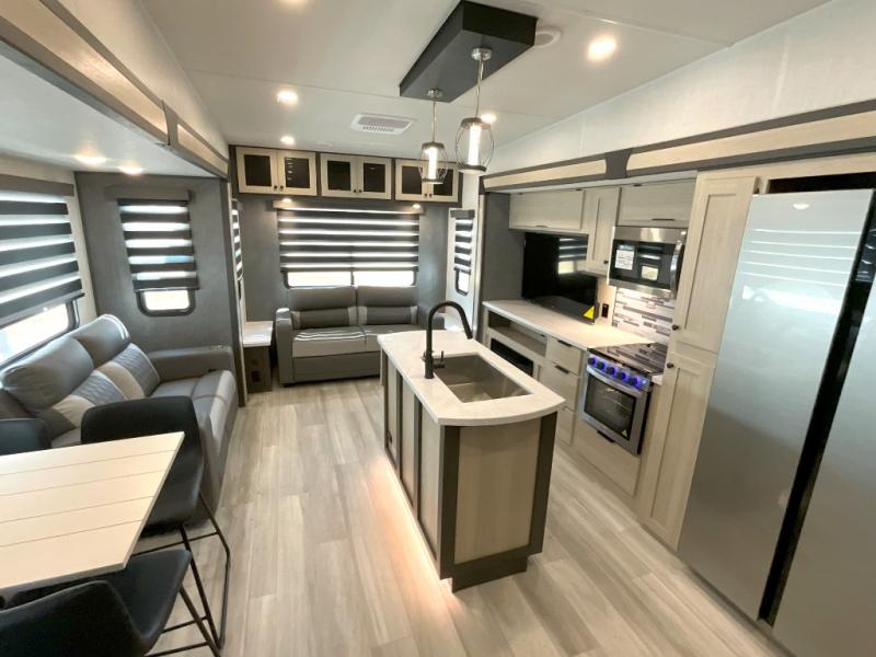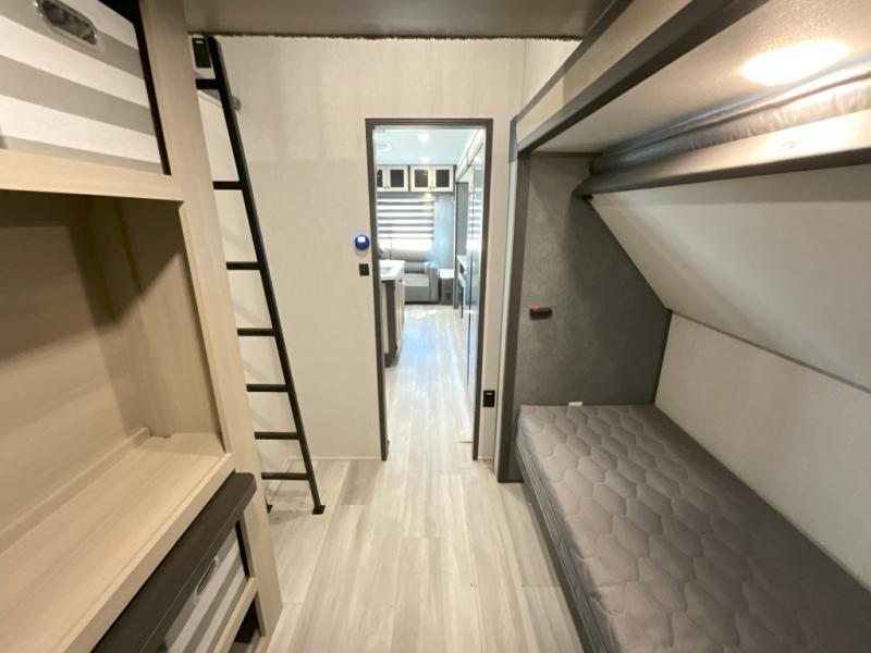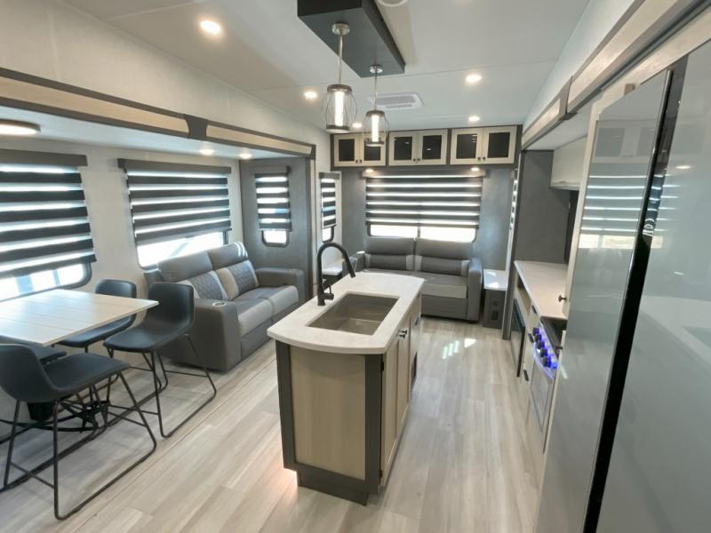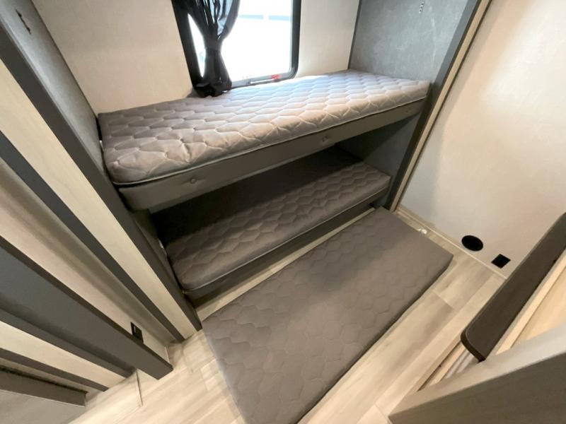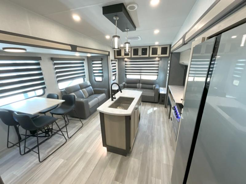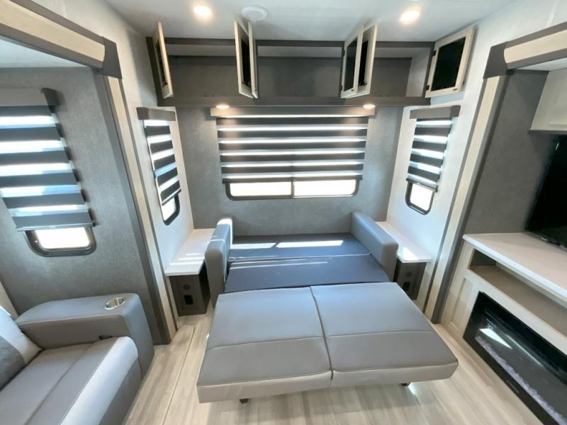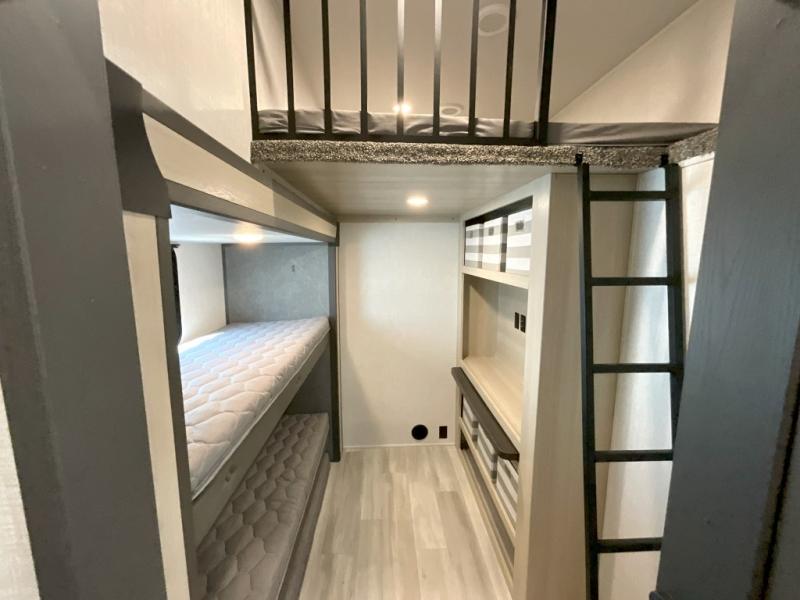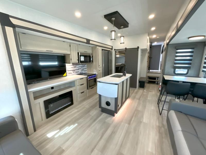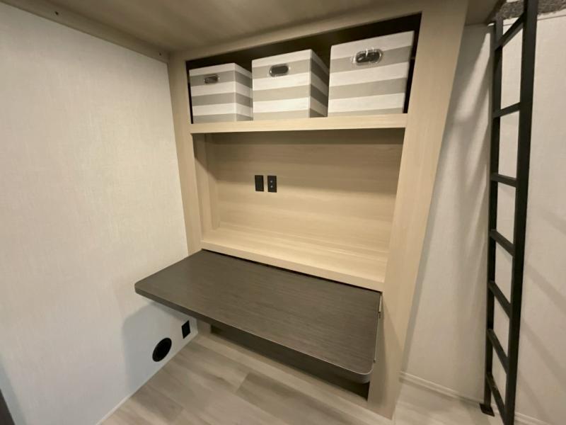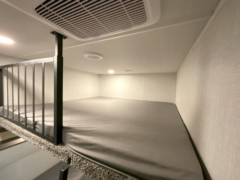 Wow! You won't believe the features found in this luxury fifth wheel that can sleep up to nine each night! Your guests or the kids will absolutely love the middle bunkroom with triple bunks and a loft above for even more sleeping or storage space. There is also a pull-out desk here, which will allow you to utilize this space as an office as well! You'll have your own space in the front private bedroom on the king bed slide out, and there is a walk-in wardrobe to keep your clothes tidy. There is even washer and dryer prep for the option to keep those clothes clean! The chef of your group will have everything they need to prepare meals, including a 21" 2-in-1 oven range, an over-the-range microwave, a 16 cu. ft. 12V refrigerator, plus a kitchen island for more counter space. In the evenings, your crew can get cozy on the rear sofa and theater seats across from the entertainment center and fireplace, or you might just play a game at the hi-top table and chairs!