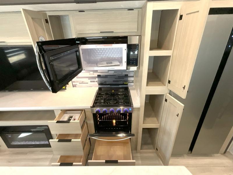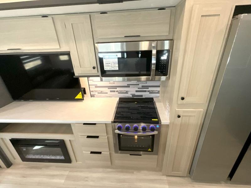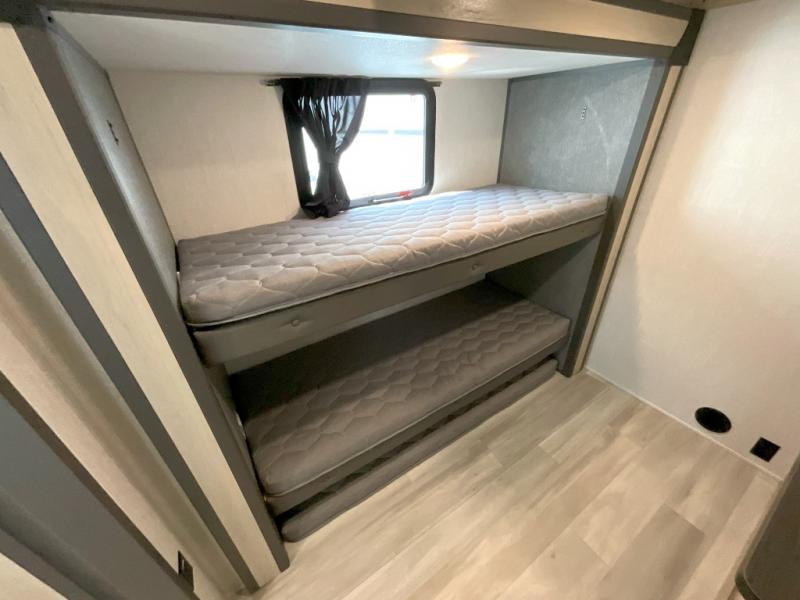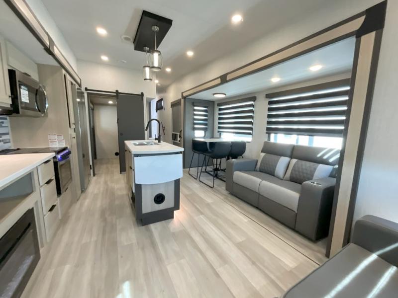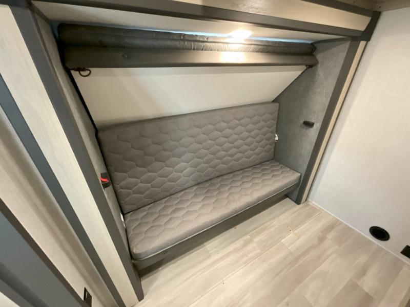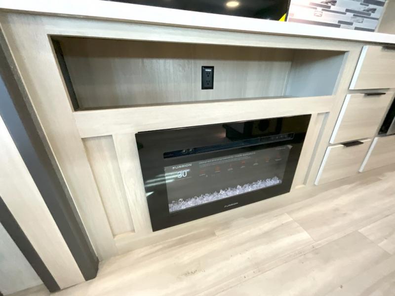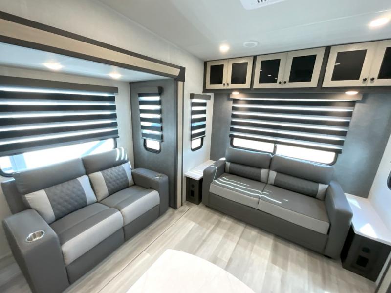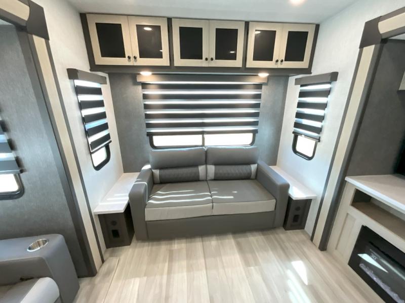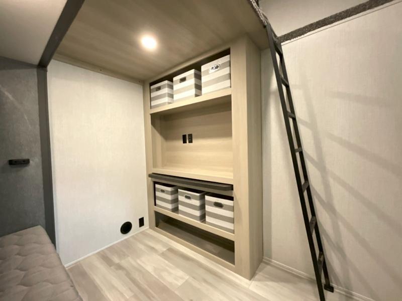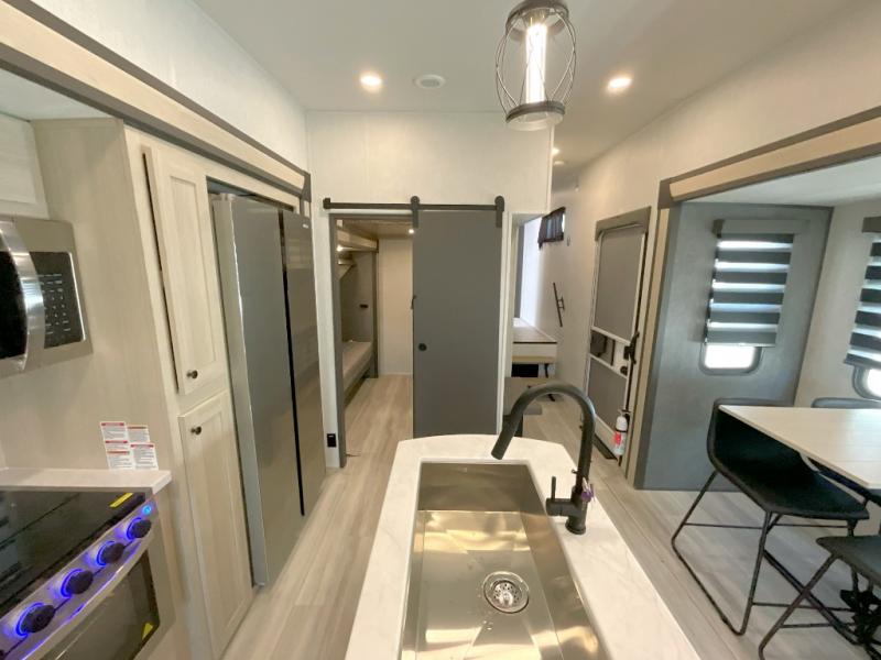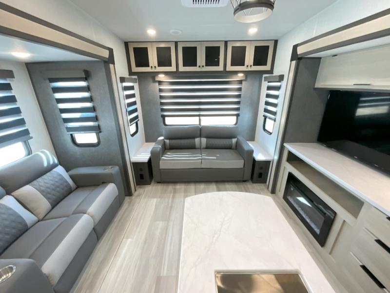 Wow! You won't believe the features found in this luxury fifth wheel that can sleep up to nine each night! Your guests or the kids will absolutely love the middle bunkroom with triple bunks and a loft above for even more sleeping or storage space. There is also a pull-out desk here, which will allow you to utilize this space as an office as well! You'll have your own space in the front private bedroom on the king bed slide out, and there is a walk-in wardrobe to keep your clothes tidy. There is even washer and dryer prep for the option to keep those clothes clean! The chef of your group will have everything they need to prepare meals, including a 21" 2-in-1 oven range, an over-the-range microwave, a 16 cu. ft. 12V refrigerator, plus a kitchen island for more counter space. In the evenings, your crew can get cozy on the rear sofa and theater seats across from the entertainment center and fireplace, or you might just play a game at the hi-top table and chairs!