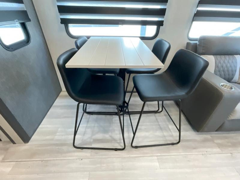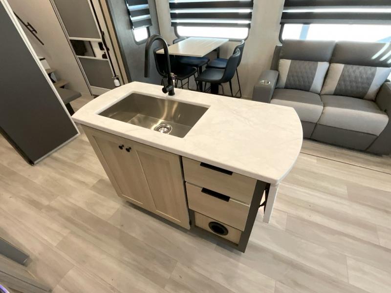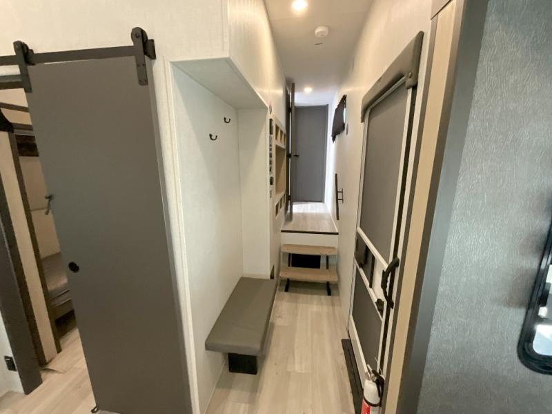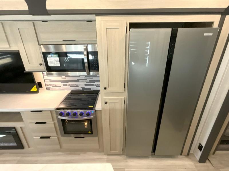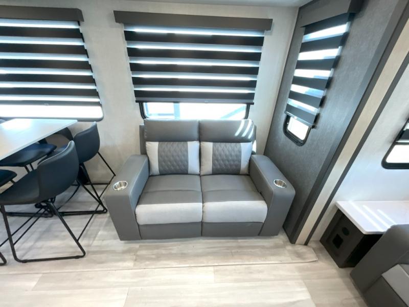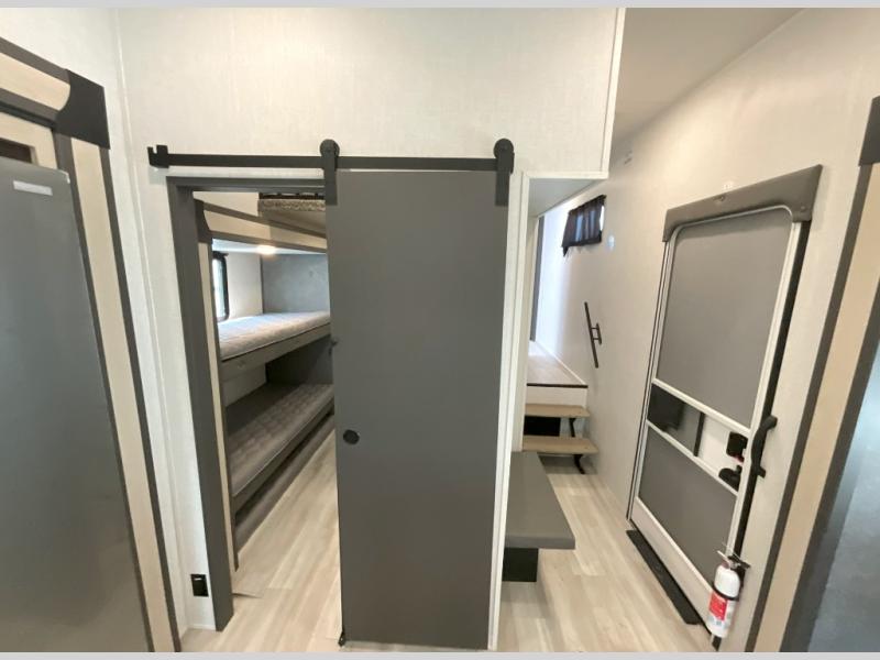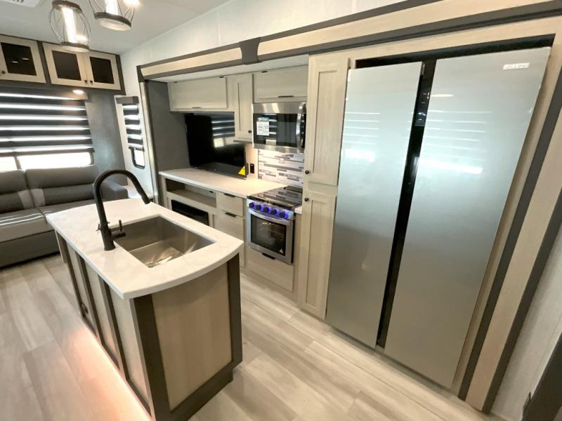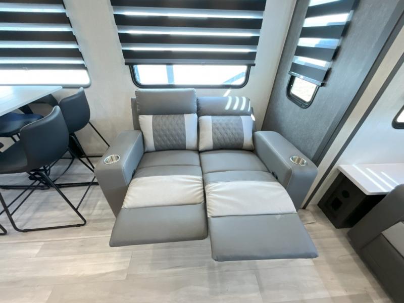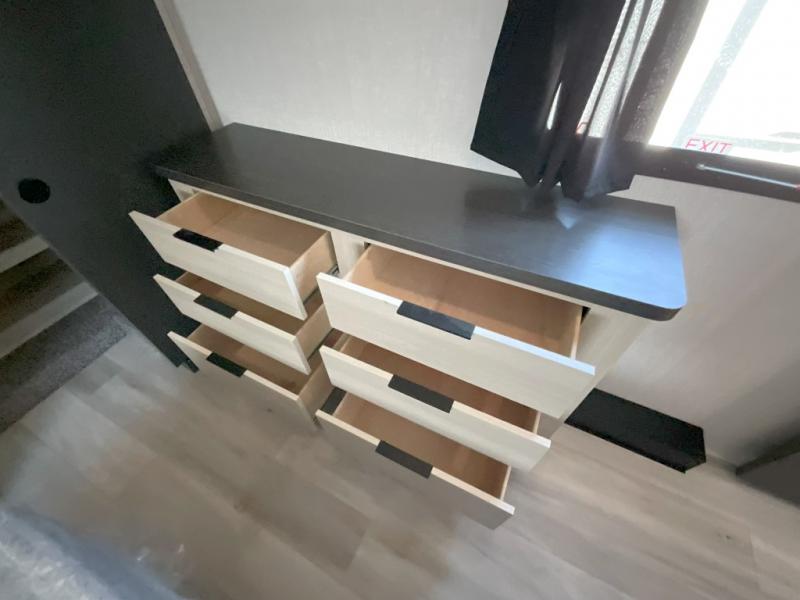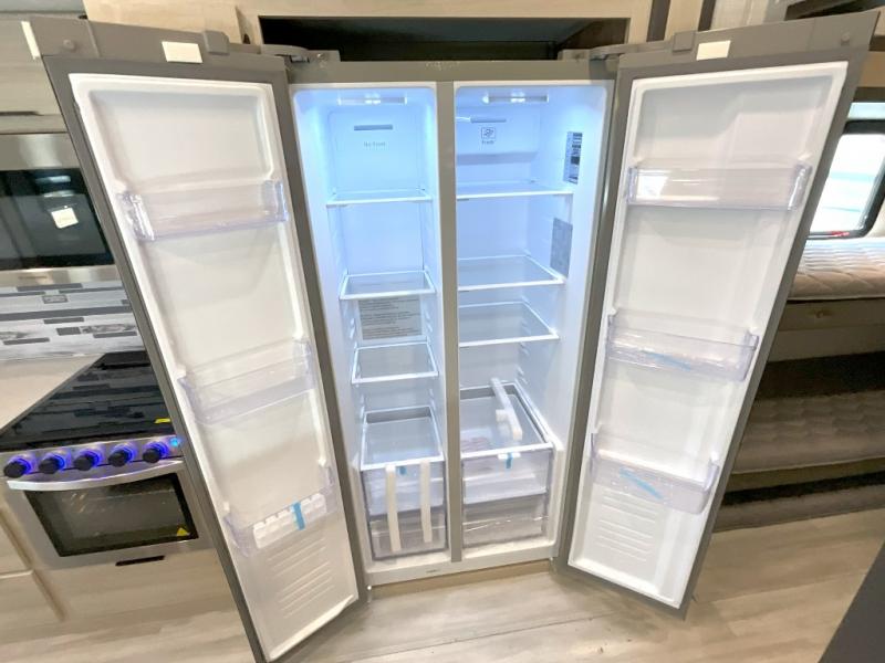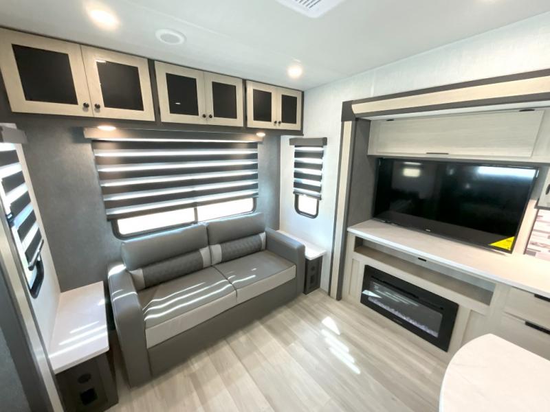 Wow! You won't believe the features found in this luxury fifth wheel that can sleep up to nine each night! Your guests or the kids will absolutely love the middle bunkroom with triple bunks and a loft above for even more sleeping or storage space. There is also a pull-out desk here, which will allow you to utilize this space as an office as well! You'll have your own space in the front private bedroom on the king bed slide out, and there is a walk-in wardrobe to keep your clothes tidy. There is even washer and dryer prep for the option to keep those clothes clean! The chef of your group will have everything they need to prepare meals, including a 21" 2-in-1 oven range, an over-the-range microwave, a 16 cu. ft. 12V refrigerator, plus a kitchen island for more counter space. In the evenings, your crew can get cozy on the rear sofa and theater seats across from the entertainment center and fireplace, or you might just play a game at the hi-top table and chairs!
