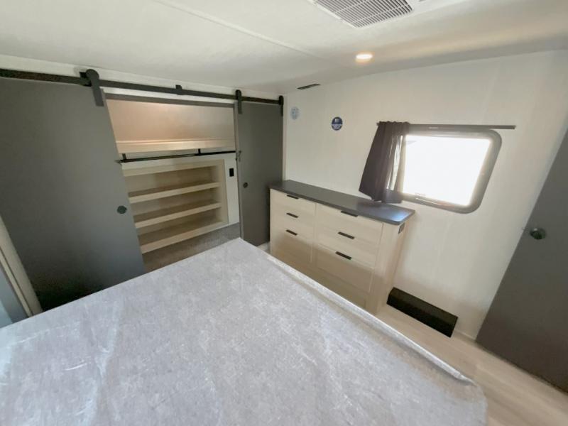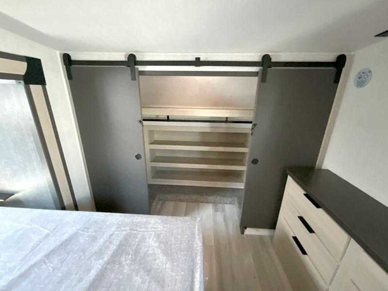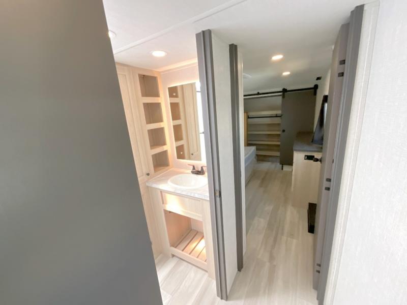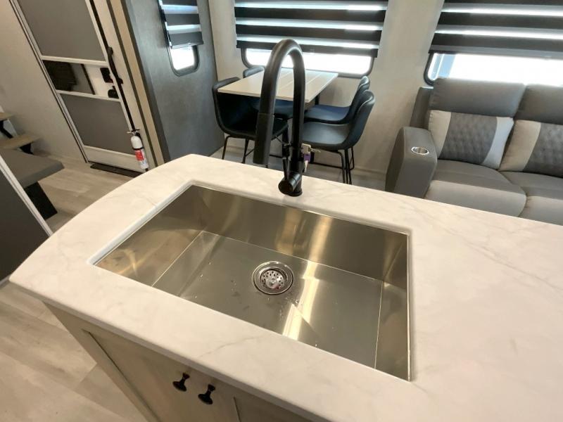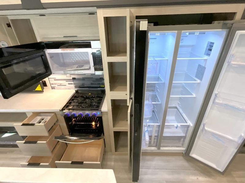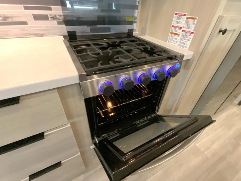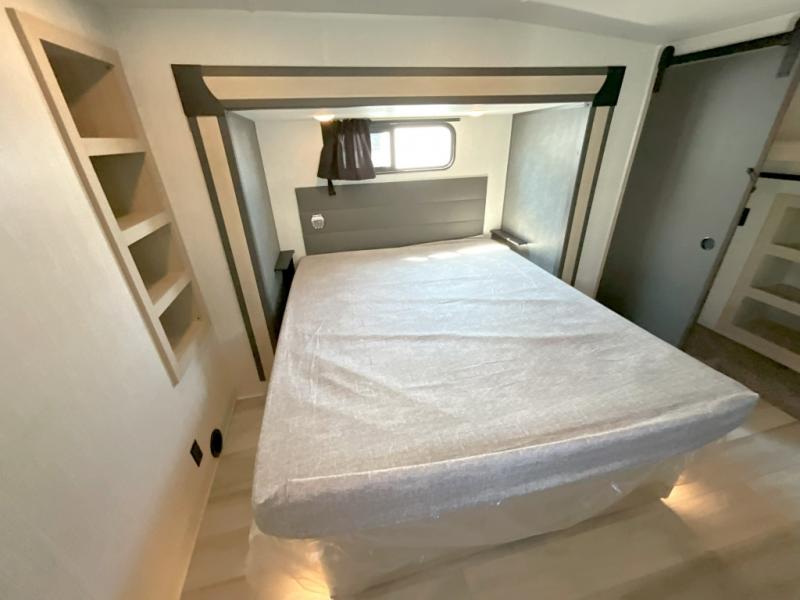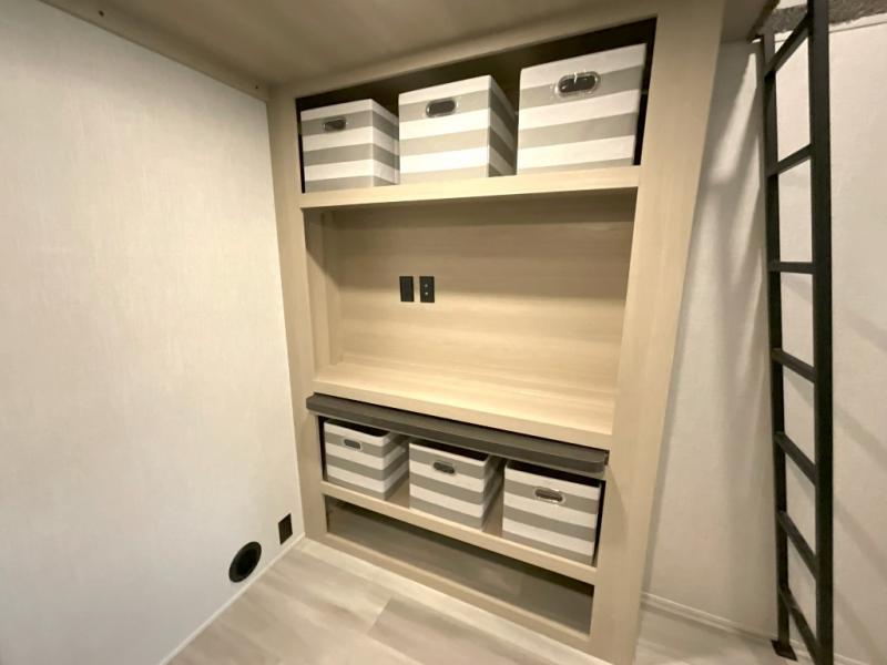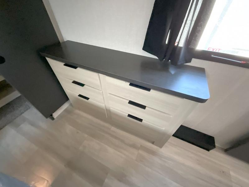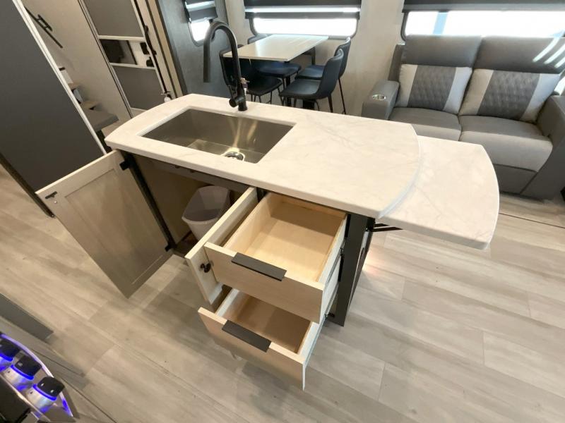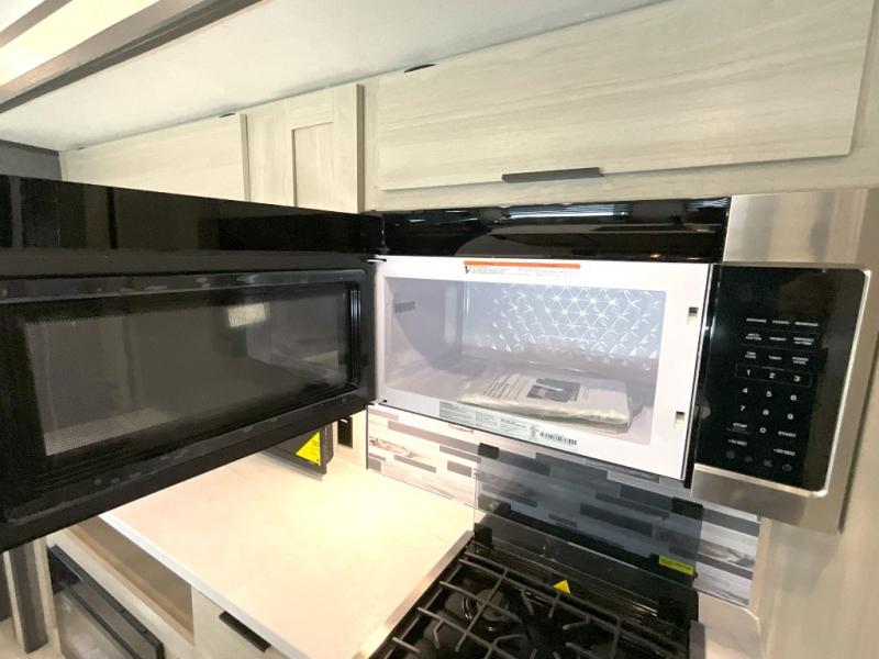 Wow! You won't believe the features found in this luxury fifth wheel that can sleep up to nine each night! Your guests or the kids will absolutely love the middle bunkroom with triple bunks and a loft above for even more sleeping or storage space. There is also a pull-out desk here, which will allow you to utilize this space as an office as well! You'll have your own space in the front private bedroom on the king bed slide out, and there is a walk-in wardrobe to keep your clothes tidy. There is even washer and dryer prep for the option to keep those clothes clean! The chef of your group will have everything they need to prepare meals, including a 21" 2-in-1 oven range, an over-the-range microwave, a 16 cu. ft. 12V refrigerator, plus a kitchen island for more counter space. In the evenings, your crew can get cozy on the rear sofa and theater seats across from the entertainment center and fireplace, or you might just play a game at the hi-top table and chairs!