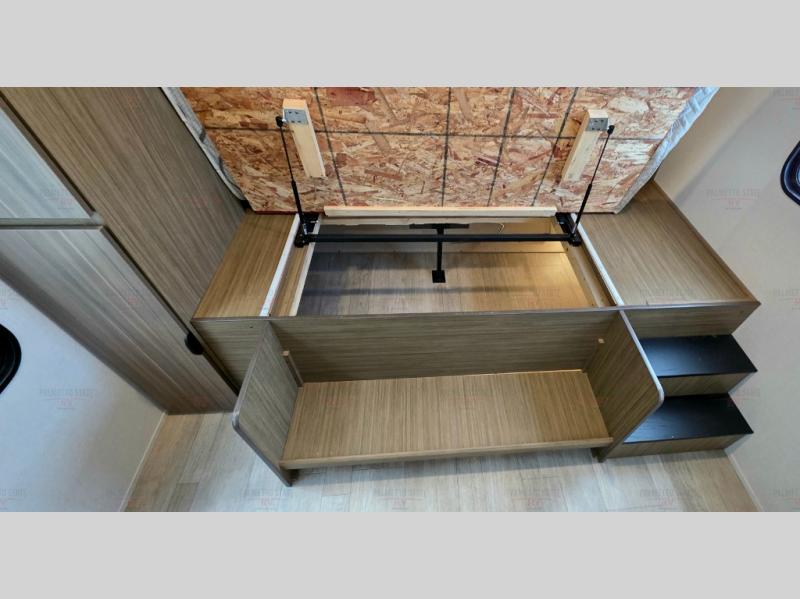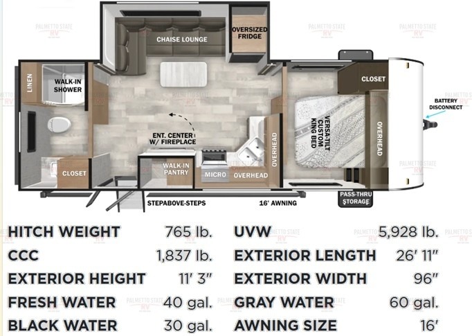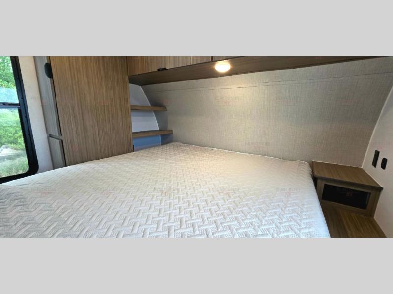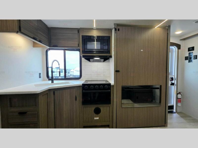 As you escape to the beautiful countryside, or embark across the country to visit family, you'll find that the modern amenities found in this Wildwood travel trailer will deliver the ultimate enjoyment all along the way! Relax on a chaise lounge that includes a table in front so that you can enjoy your morning coffee. When you are ready to face the day ahead, you can grab a towel from the linen closet in the rear bathroom and enjoy the walk-in shower before heading out for a day full of adventure. At night, a custom king bed with Versa-Tilt for a great night's rest. You will appreciate the pass-through storage, entertainment center with fireplace, and walk-in pantry for all the goodies!