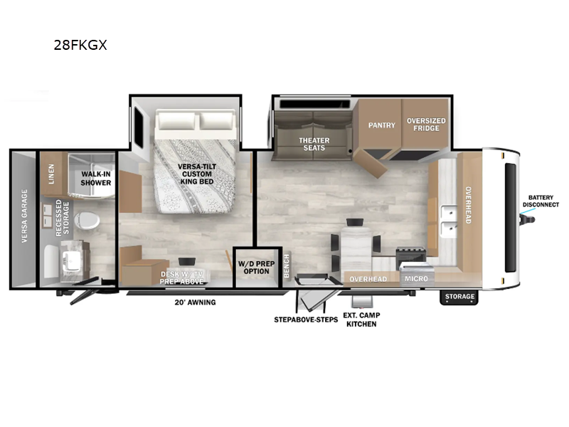 Grab your honey or your best camping friend for fun weekends in this travel trailer. There are two slide outs providing you with more space to relax, plus a front kitchen with ample counter space. The bar top with stools will provide a place to dine each morning, and the theater seat will be perfect for relaxing in the evenings. The middle master bedroom includes a custom king bed with Versa Tilt, a desk with TV prep above where you can work away from home if needed, and even a closet with washer and dryer prep option if you plan to go RVing full-time! This model also includes a spacious full rear bath with its own exterior entry door, a walk-in shower, a linen closet for clean towels, and recessed storage for necessities. Don't overlook the exterior with its camp kitchen, 20' awning, and Versa garage for luggage, fishing poles, and more!