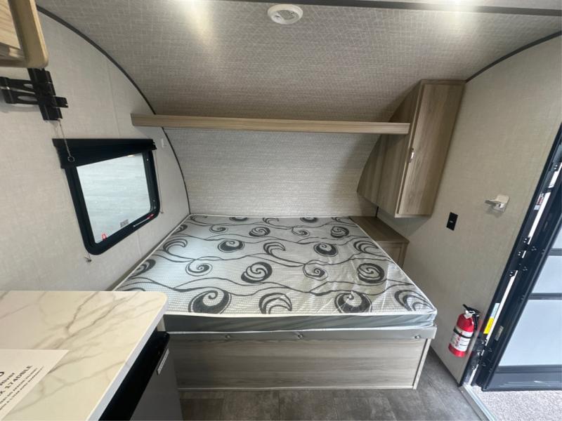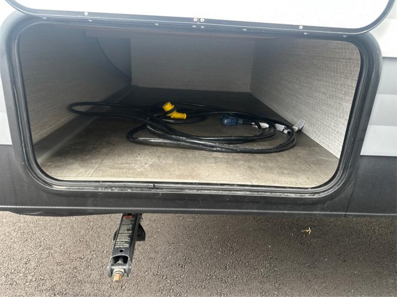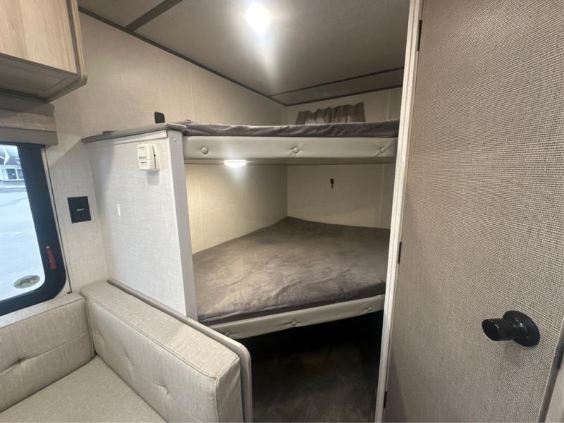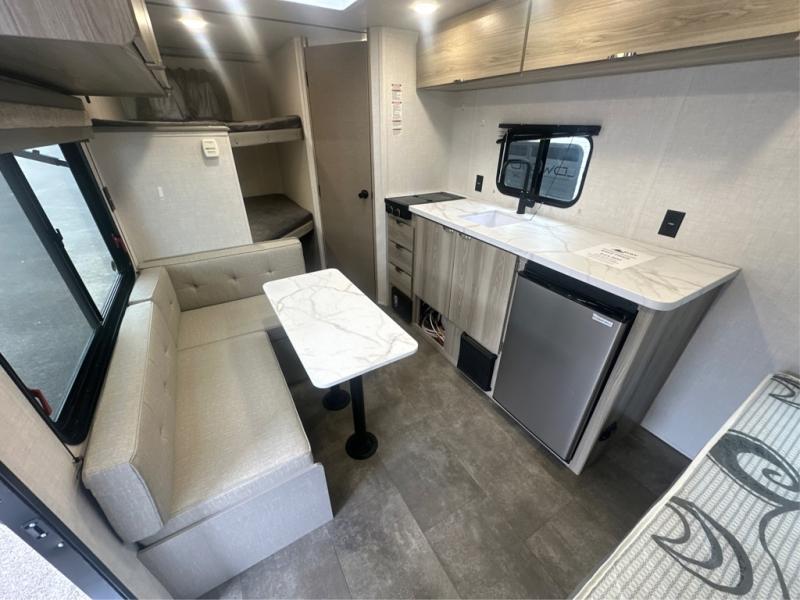 The double-size bunks with storage will be a big selling point in this travel trailer! While your guests take the bunks, you can have the front queen bed all to yourselves, and there is a wardrobe to keep your things organized. A two burner cooktop and microwave will let you make meals each day, and you can dine at the open lounge with a table.