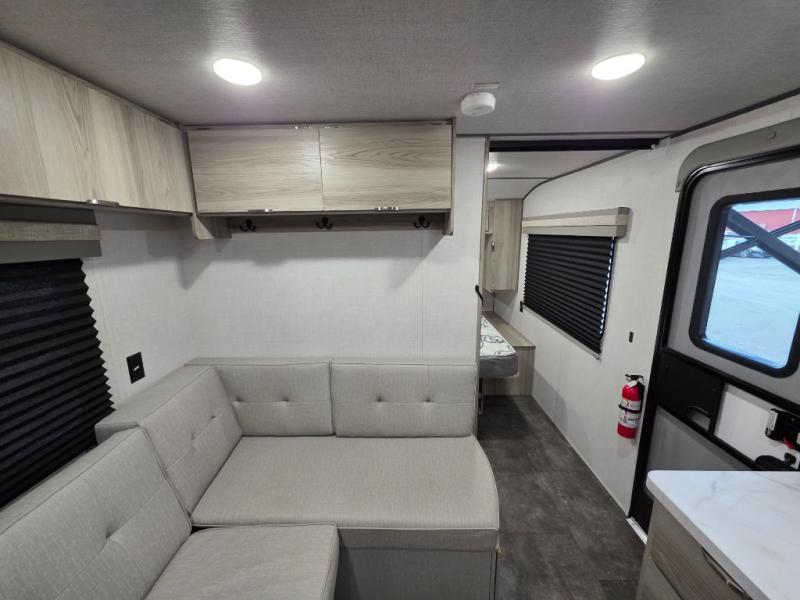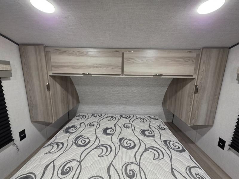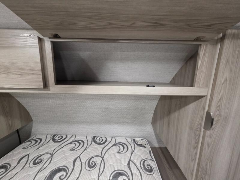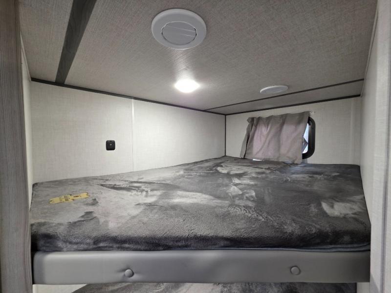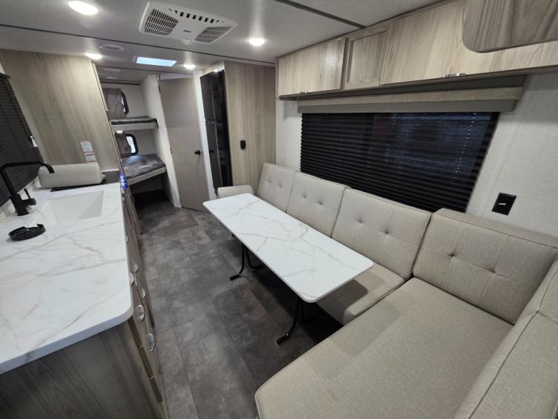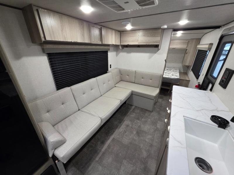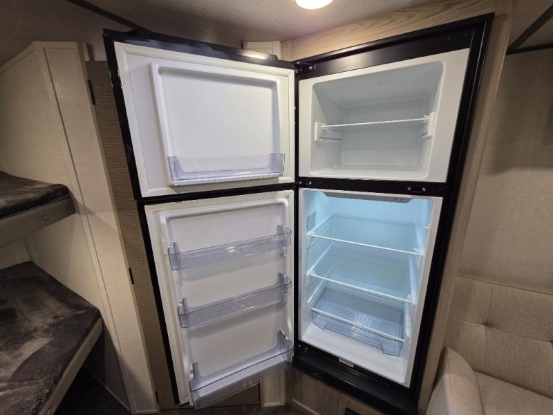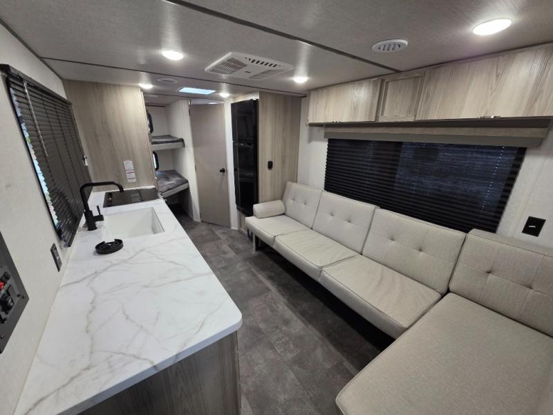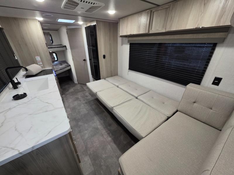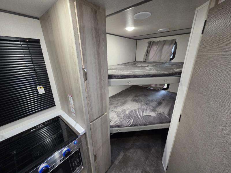 Camping is made easy in this travel trailer with more sleeping space and lots of comforts! The kids or your guests will enjoy the double-size bunks in the back, along with the full bath close by for easy nighttime use. You'll have the front private bedroom with a king bed all to yourselves, and there are dual bedroom wardrobes to keep your space neat and clean. Everyone can meet in the combined kitchen and living room to relax on the super U-lounge with a removable table while the chef of your group makes breakfast on the two burner cooktop. There is also a microwave oven for quick meals, plus a pantry and large under counter refrigerator for food storage!