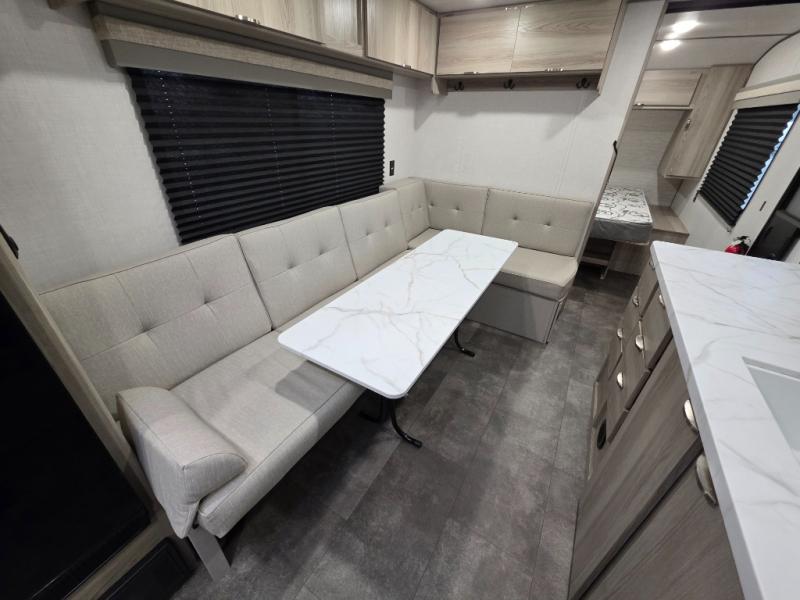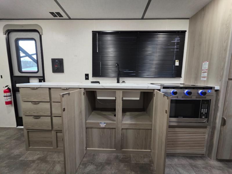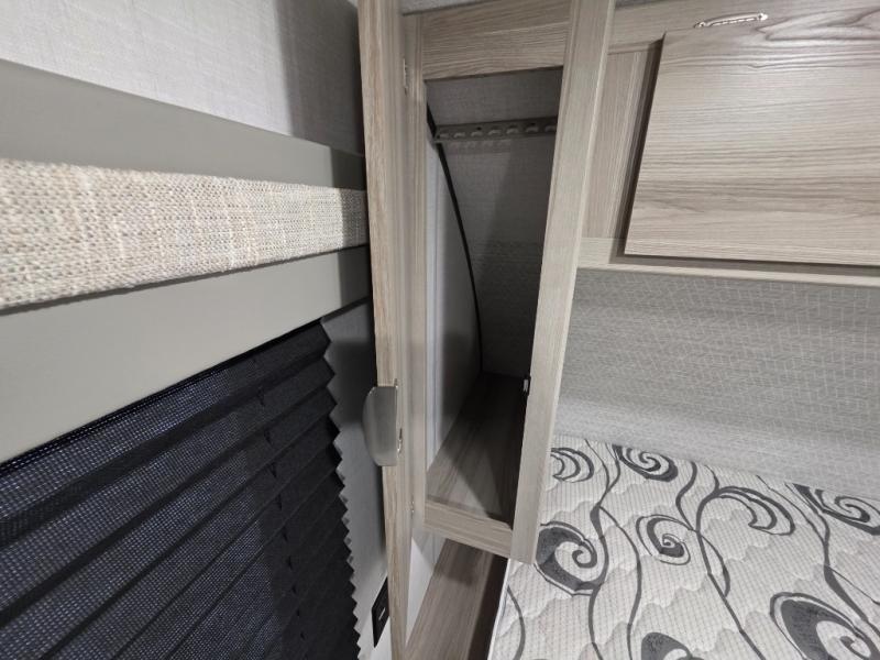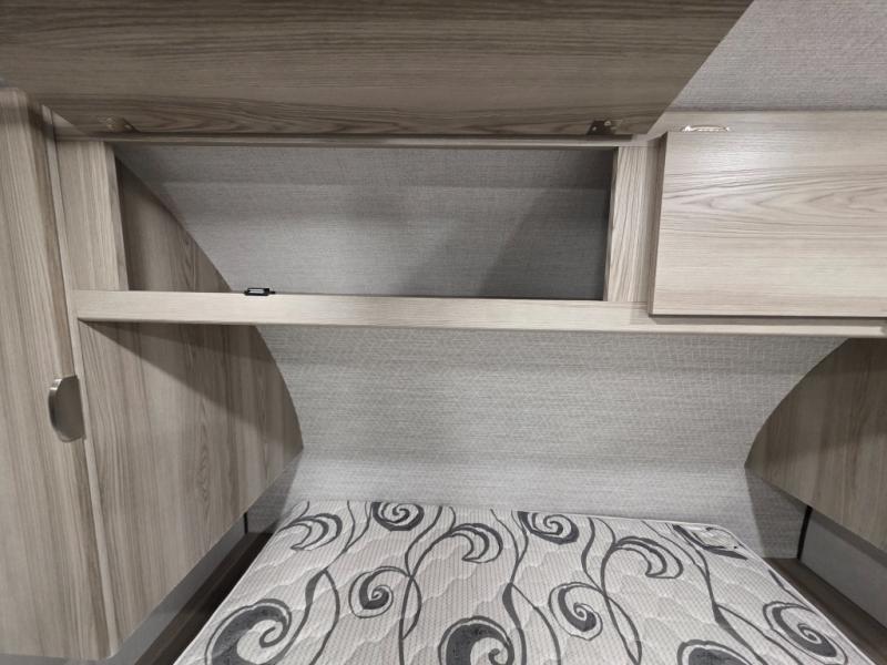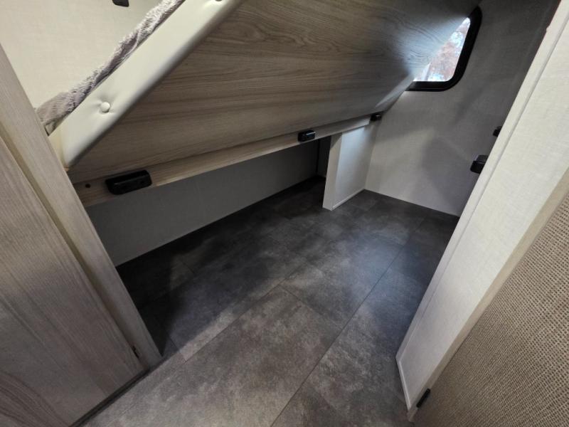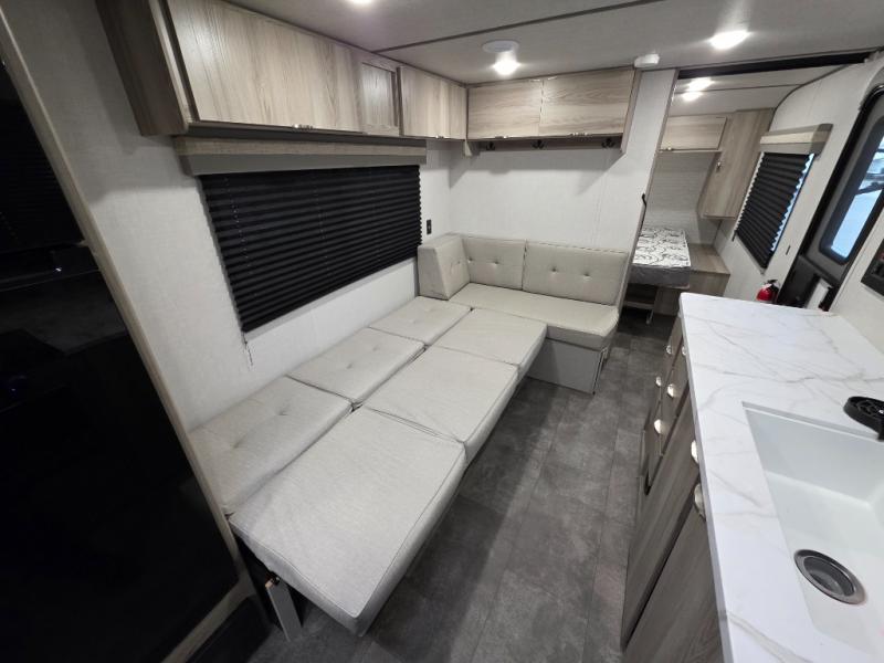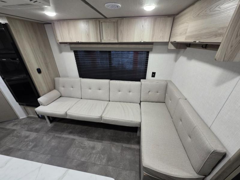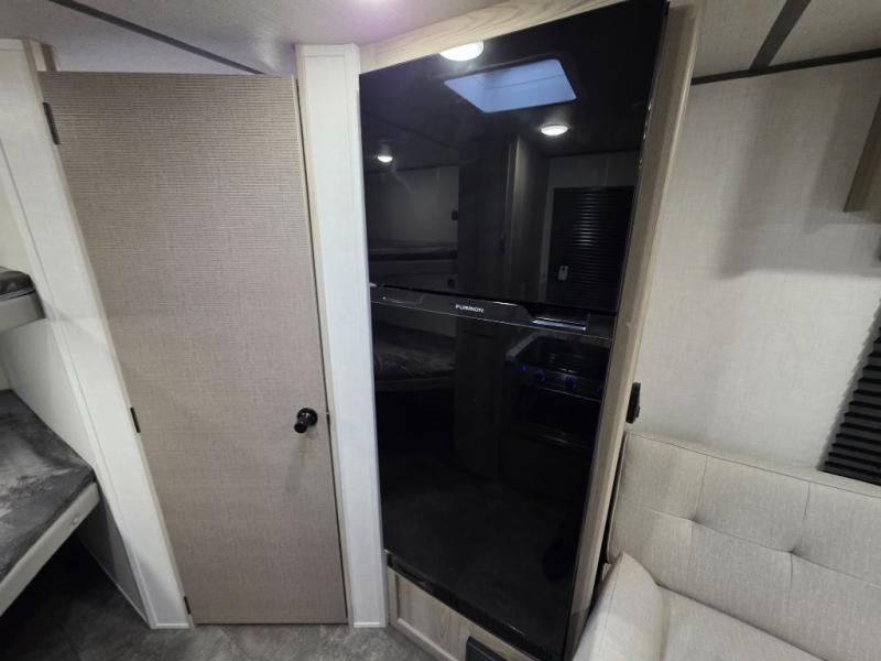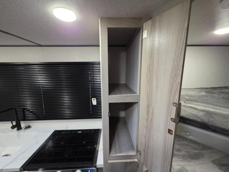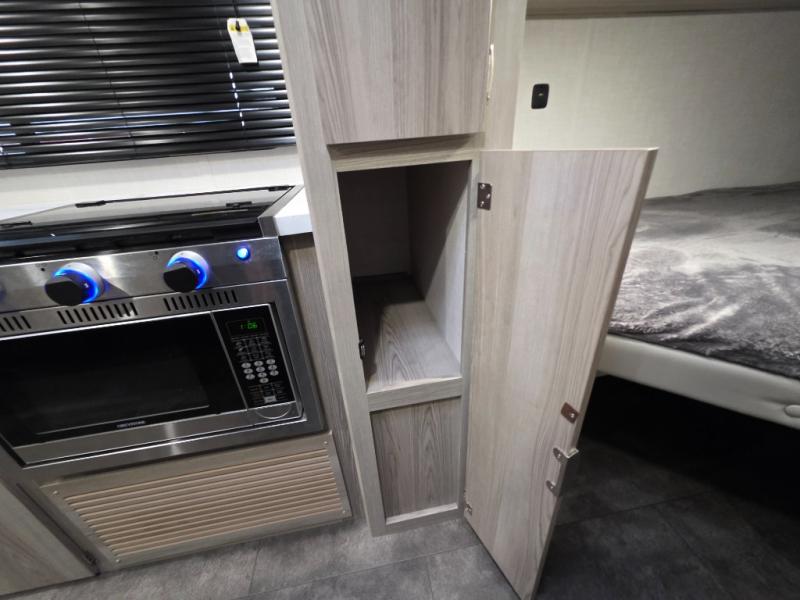Camping is made easy in this travel trailer with more sleeping space and lots of comforts! The kids or your guests will enjoy the double-size bunks in the back, along with the full bath close by for easy nighttime use. You'll have the front private bedroom with a king bed all to yourselves, and there are dual bedroom wardrobes to keep your space neat and clean. Everyone can meet in the combined kitchen and living room to relax on the super U-lounge with a removable table while the chef of your group makes breakfast on the two burner cooktop. There is also a microwave oven for quick meals, plus a pantry and large under counter refrigerator for food storage!