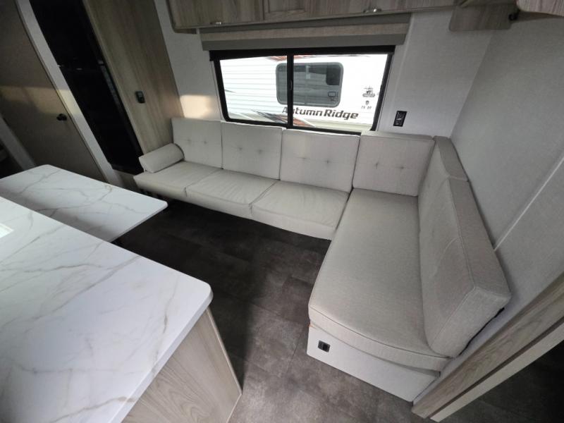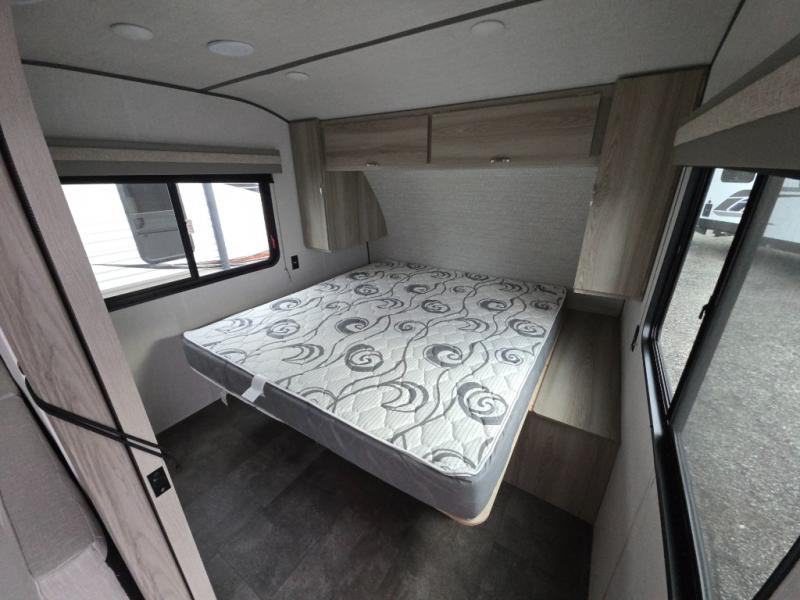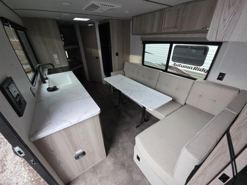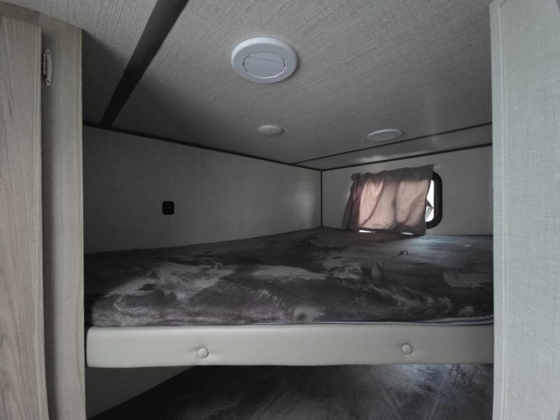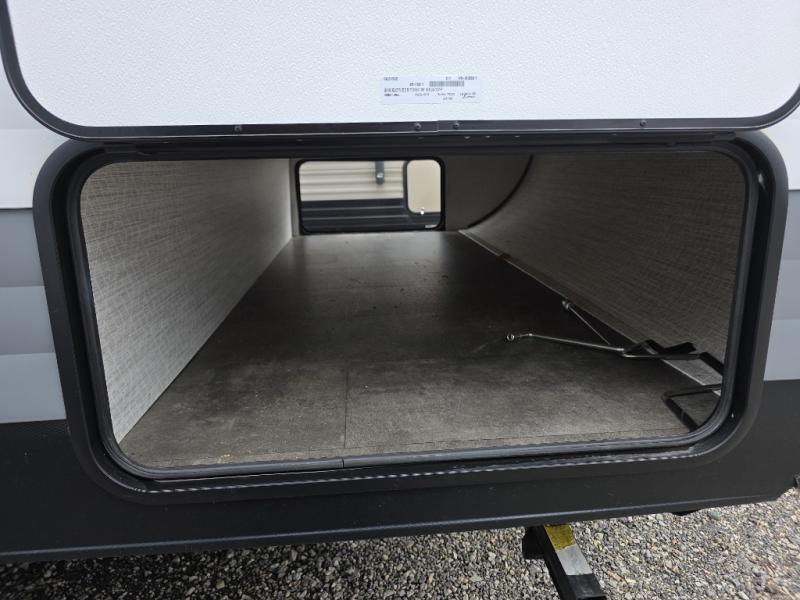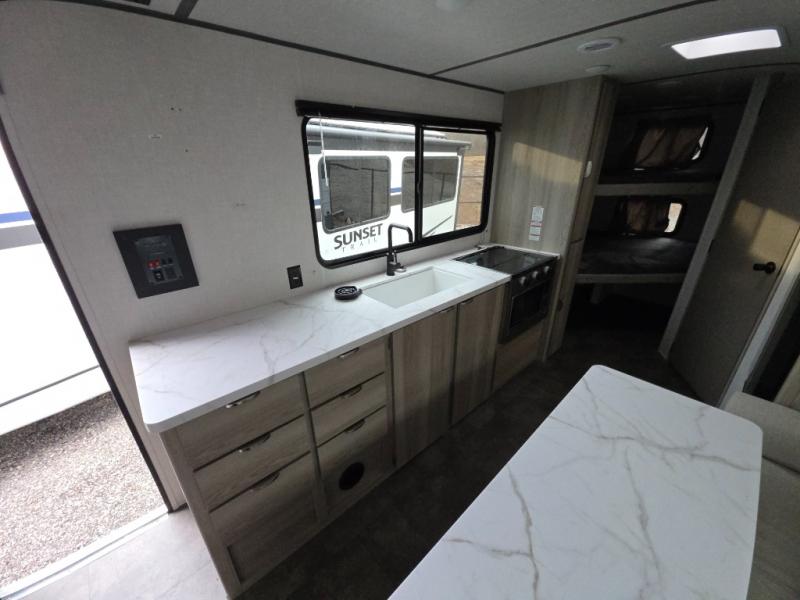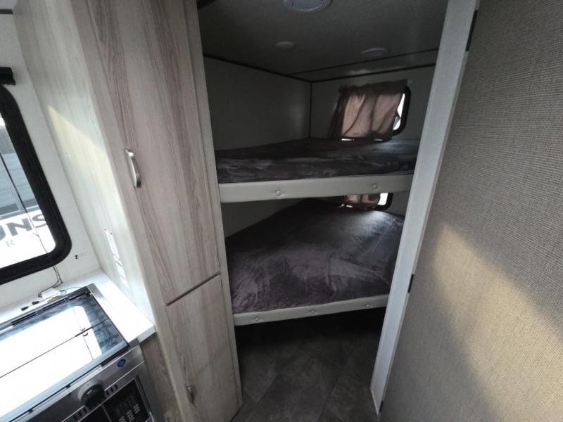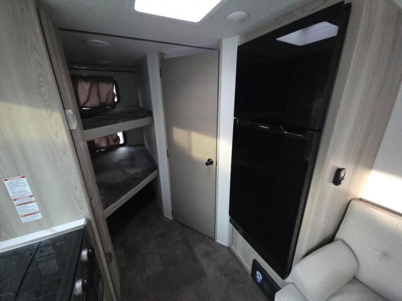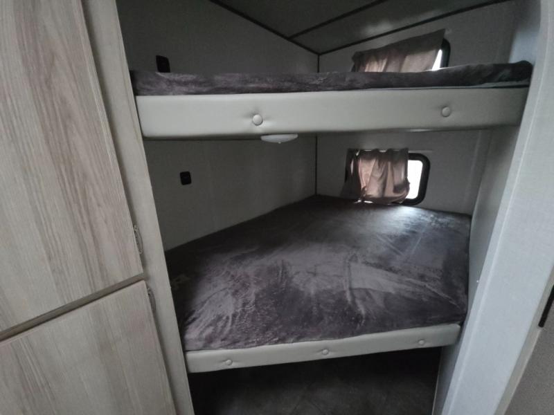 Camping is made easy in this travel trailer with more sleeping space and lots of comforts! The kids or your guests will enjoy the double-size bunks in the back, along with the full bath close by for easy nighttime use. You'll have the front private bedroom with a king bed all to yourselves, and there are dual bedroom wardrobes to keep your space neat and clean. Everyone can meet in the combined kitchen and living room to relax on the super U-lounge with a removable table while the chef of your group makes breakfast on the two burner cooktop. There is also a microwave oven for quick meals, plus a pantry and large under counter refrigerator for food storage!