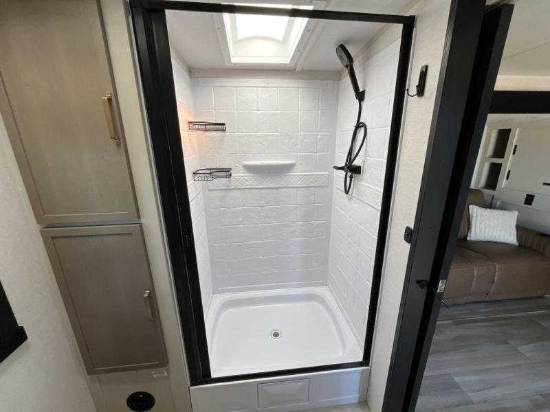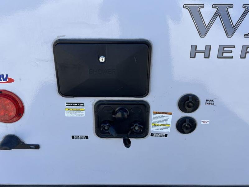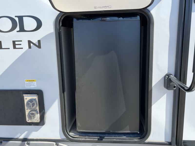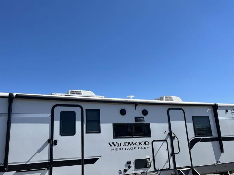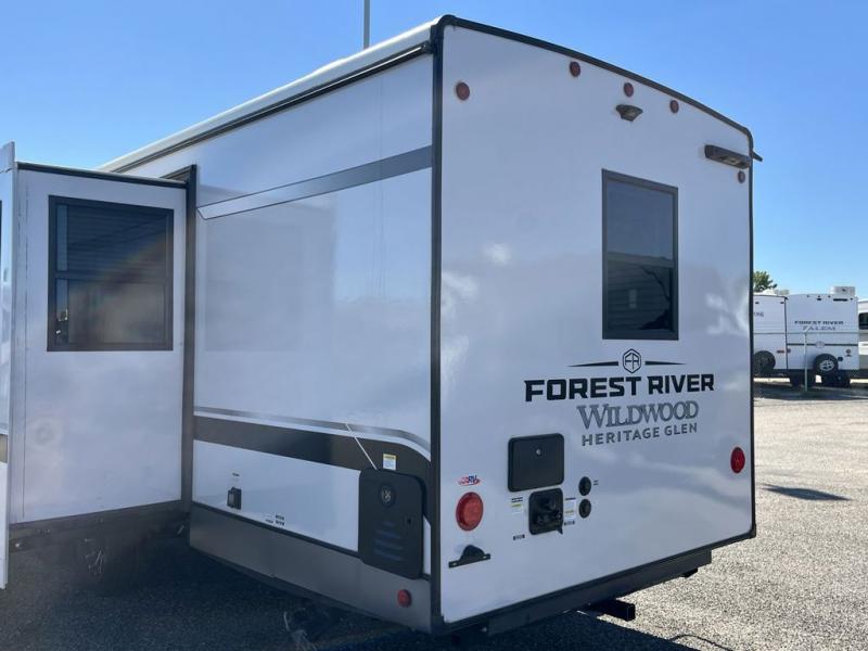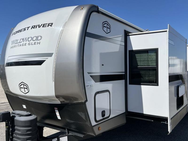 With any Wildwood Heritage Glen travel trailer by Forest River, the quality construction, attention to detail and design along with a bright and welcoming interior allows you to relax in comfort with conveniences while exploring outdoors. Each model includes a WeatherShield one piece fiberglass roof, Maxxis radial tires, and an enclosed underbelly with 12V tank heaters on all holding tanks for added protection. You will appreciate the on-demand tankless water heater, along with the 15K BTU Quite Cool A/C and 50 Amp service with a brace for a second A/C. There is an outside shower with hot and cold water, solar prep, a power tongue jack, plus many more exterior conveniences. Head inside to enjoy matte gold hardware, wood door casings in place of plastic door casings, and full length barreled ceilings for additional head room.